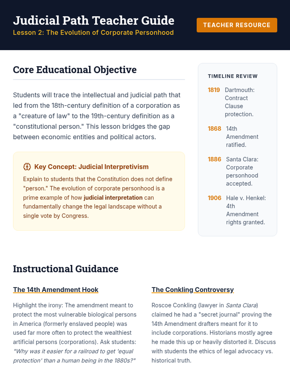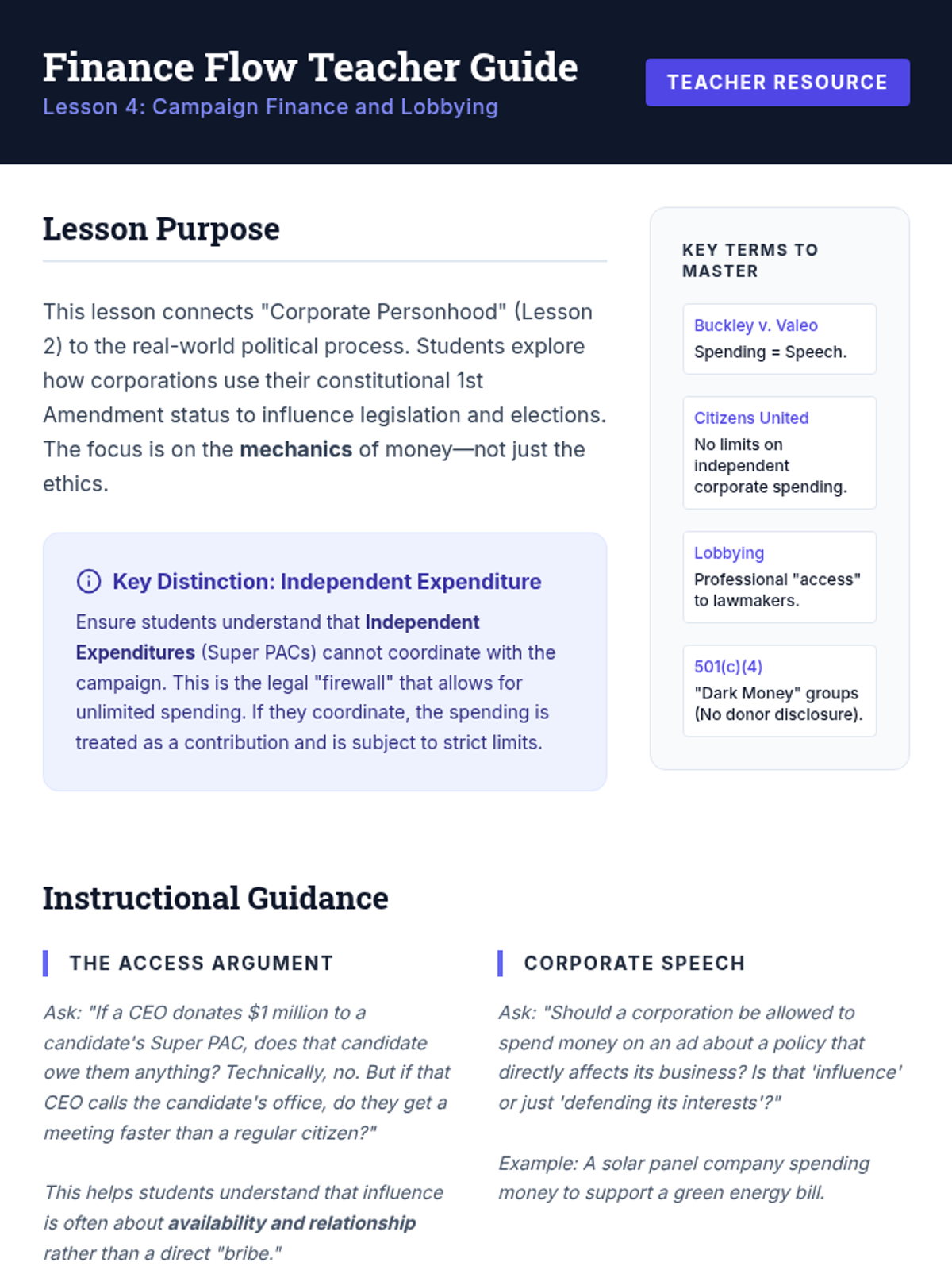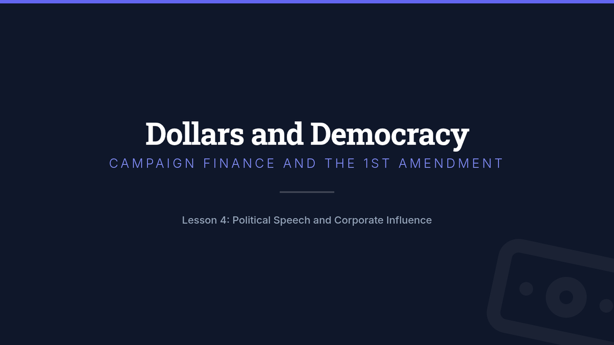 This sequence explores the legal evolution and political influence of corporations, from basic business structures to the complex debate over corporate personhood and campaign finance. Students analyze how legal precedents have shaped the modern economic and political landscape.