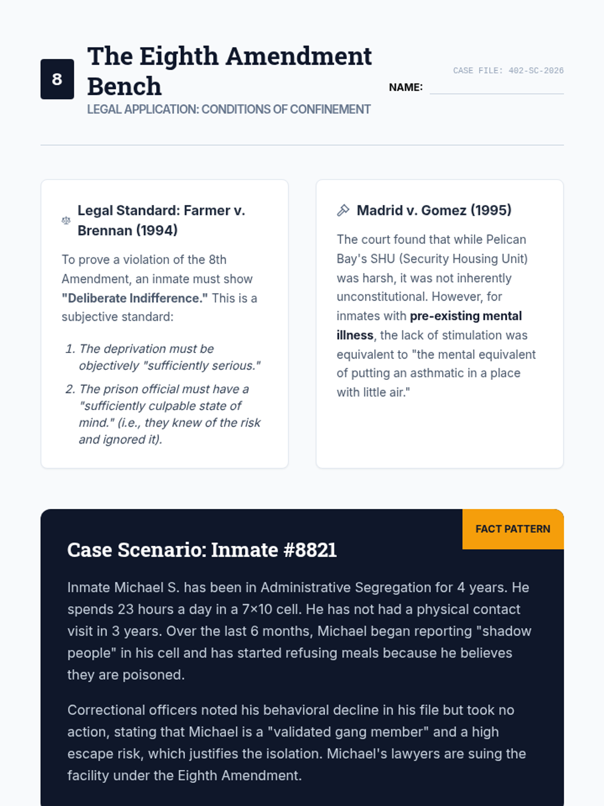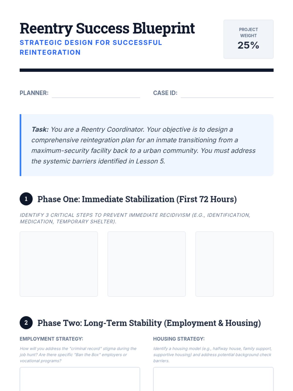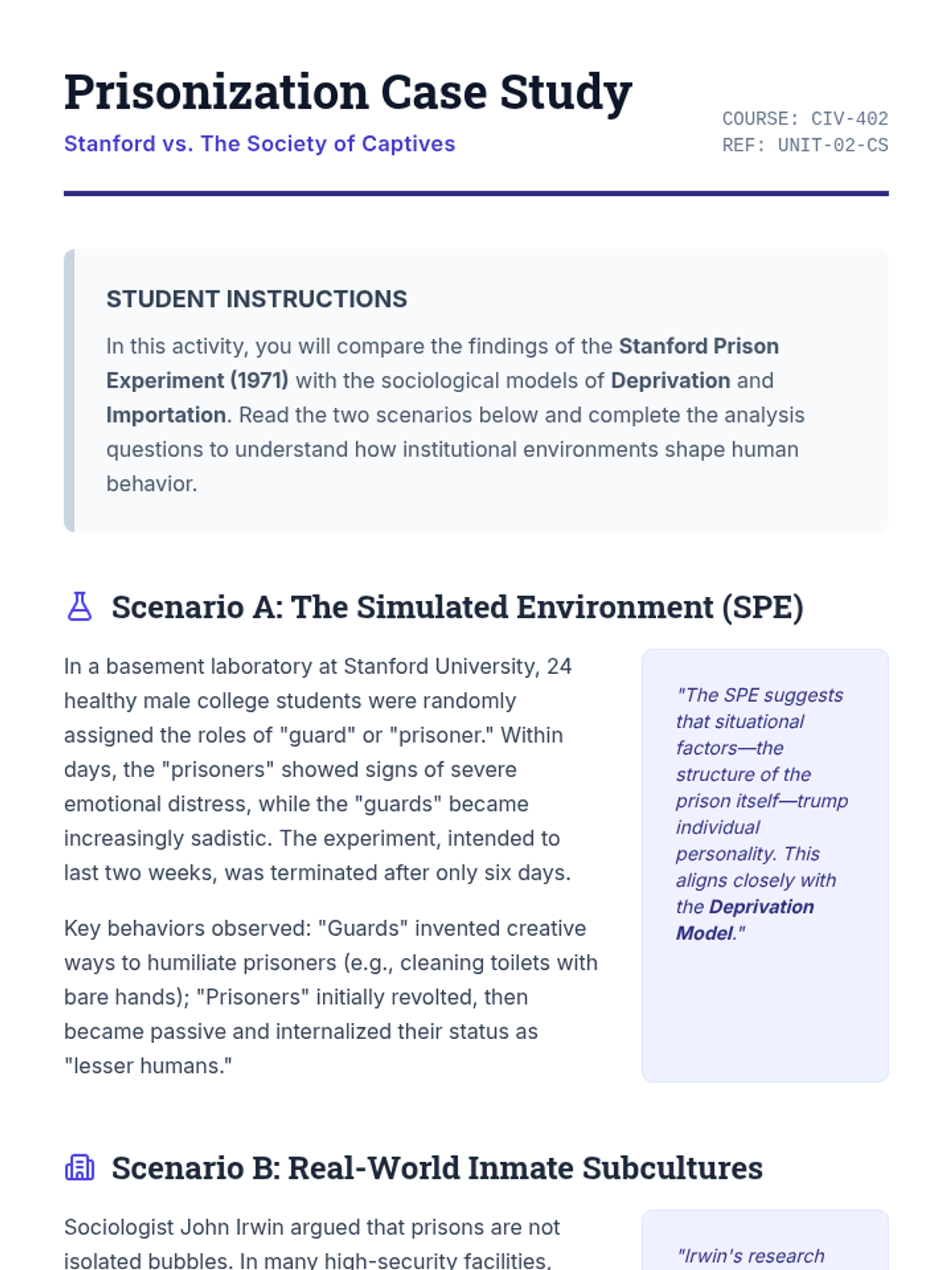 This sequence analyzes the operational and sociological aspects of the American correctional system, from its historical roots to modern mass incarceration and the challenges of reentry. Students engage with statistical data, constitutional law, and sociological theories to evaluate the efficacy and ethics of the current system.