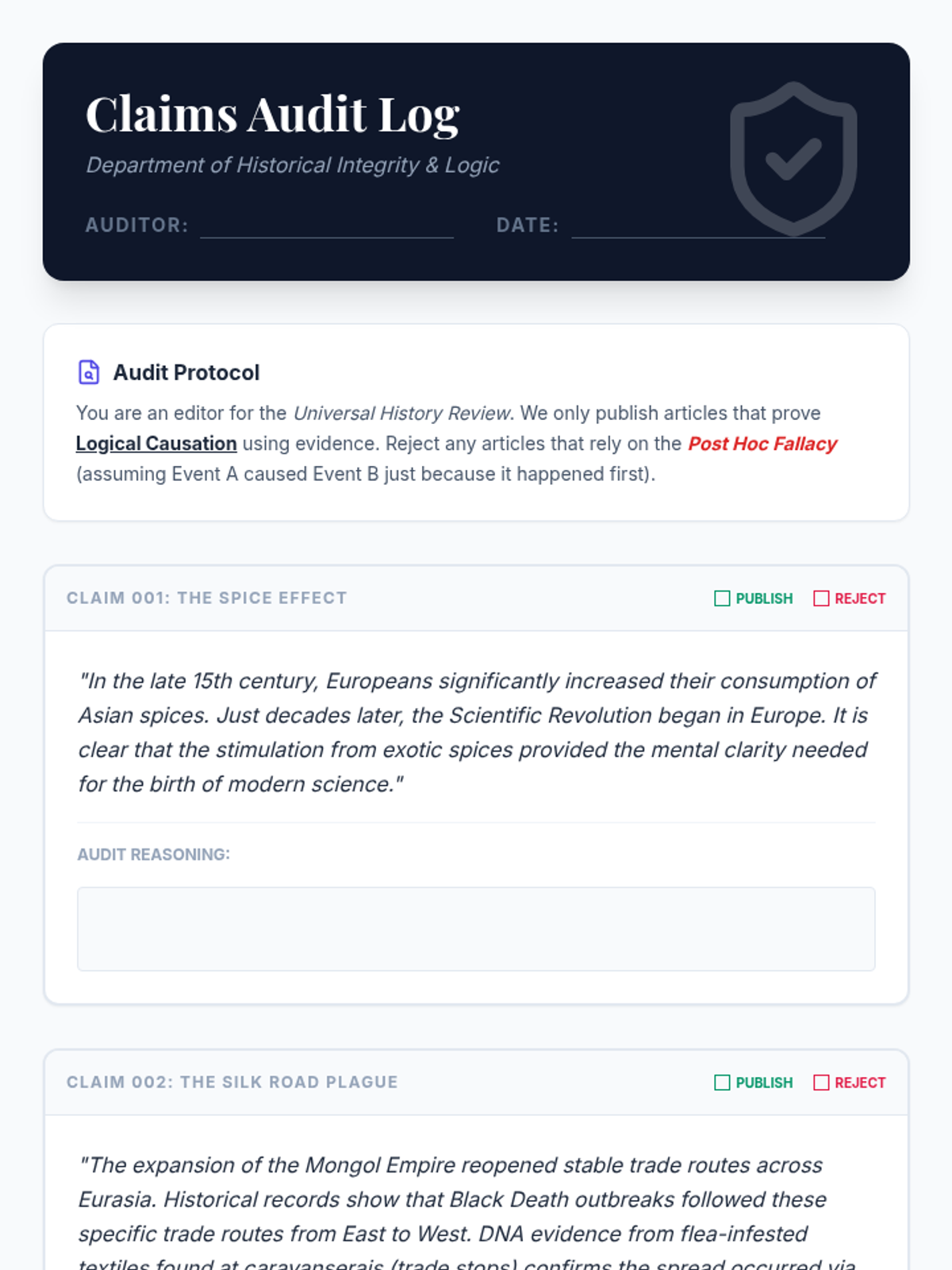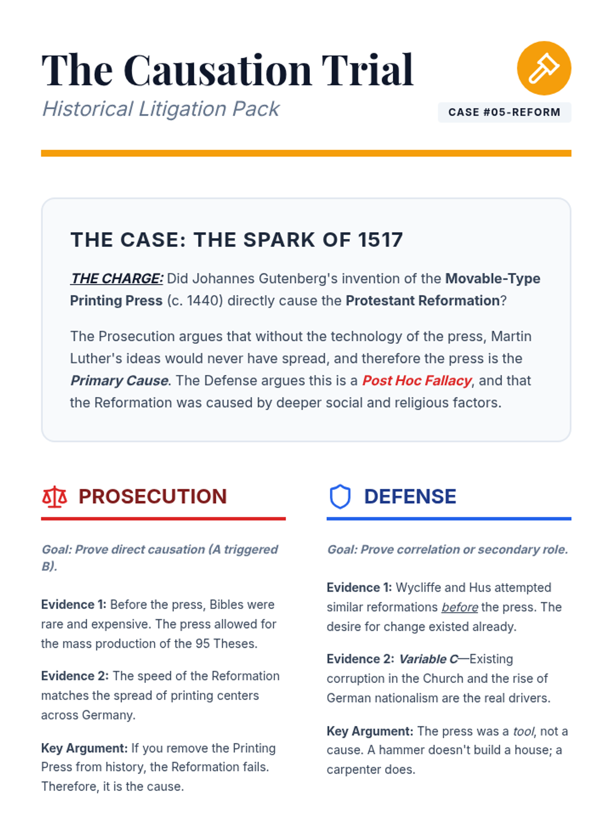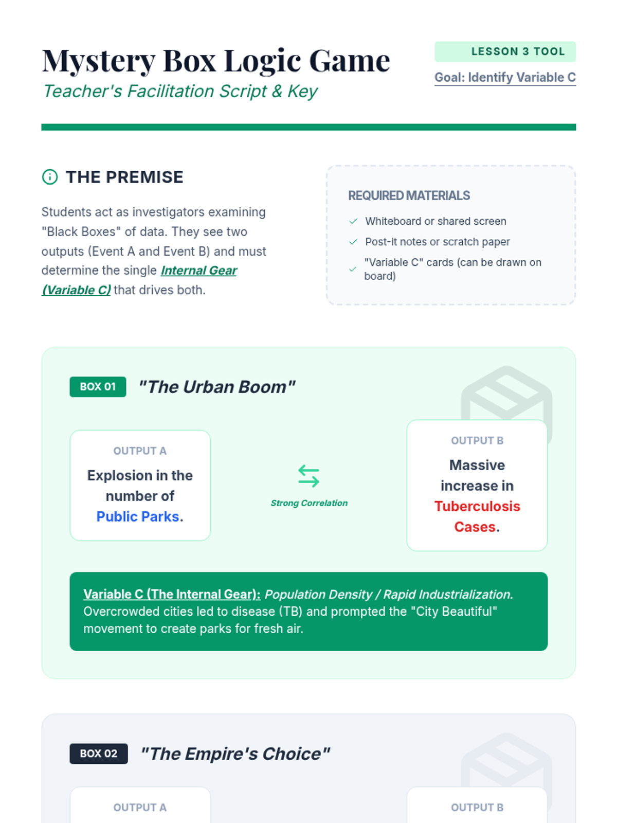 A 5-lesson sequence for 9th-grade students on historical chronology and causation, focusing on the logical fallacy of 'Post Hoc, Ergo Propter Hoc'. Students move from analyzing modern spurious correlations to conducting historical trials to differentiate between coincidence and cause.