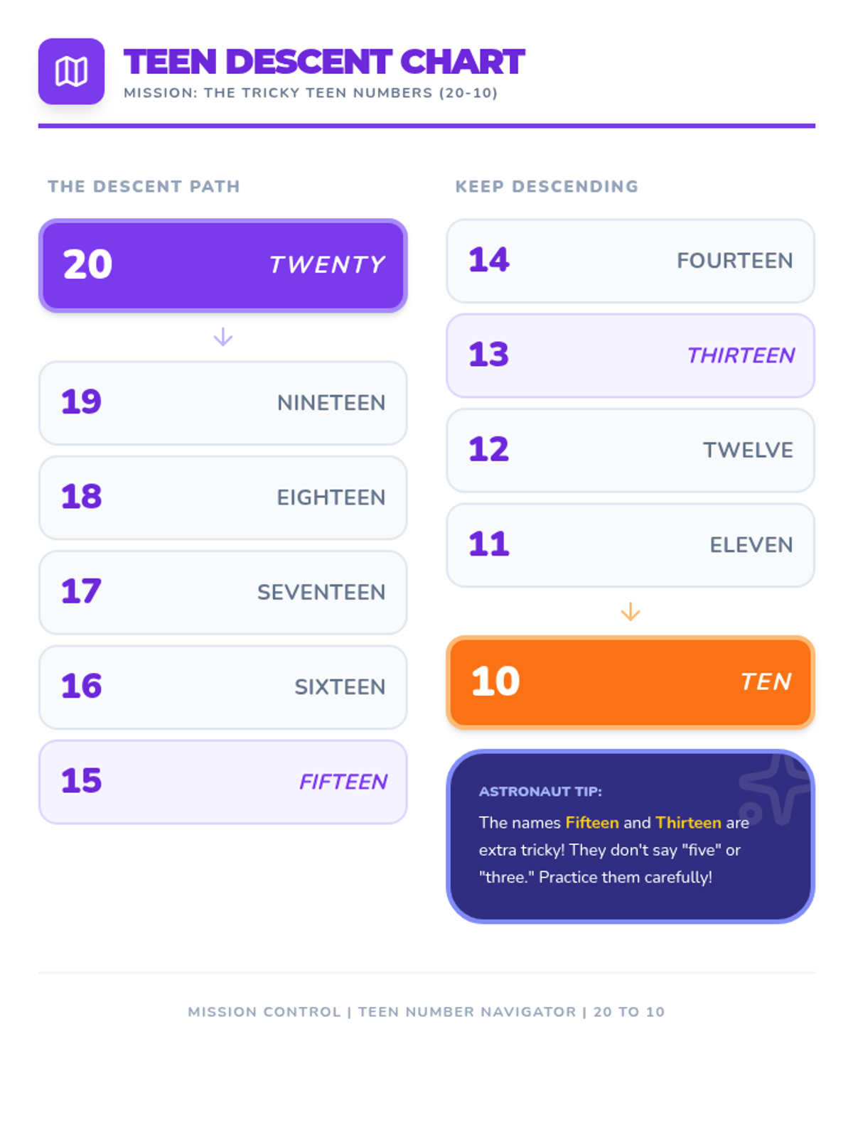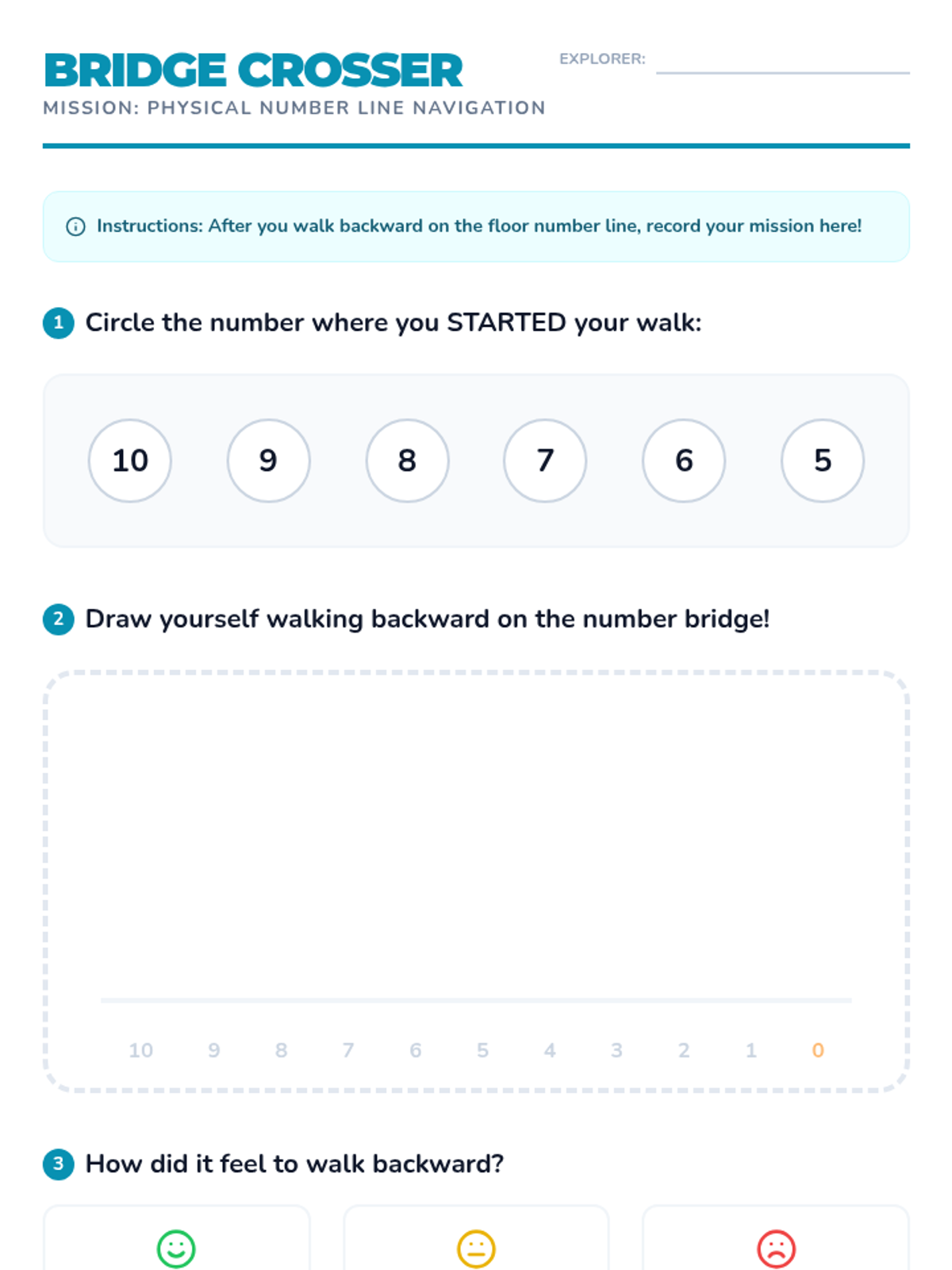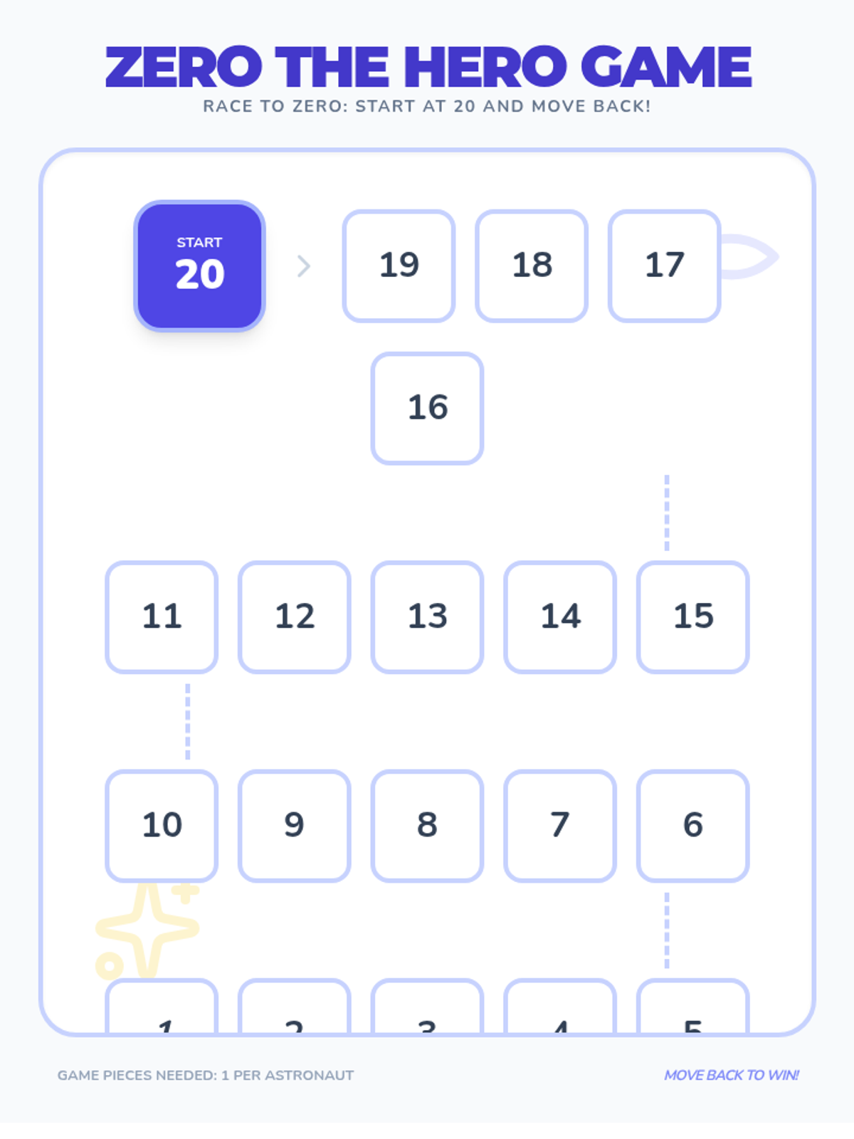 A Kindergarten math sequence introducing backward counting from 20 to 0 using a space exploration theme. Students learn that counting backwards corresponds to decreasing quantity, preparing them for subtraction concepts through simulations, games, and physical activities.