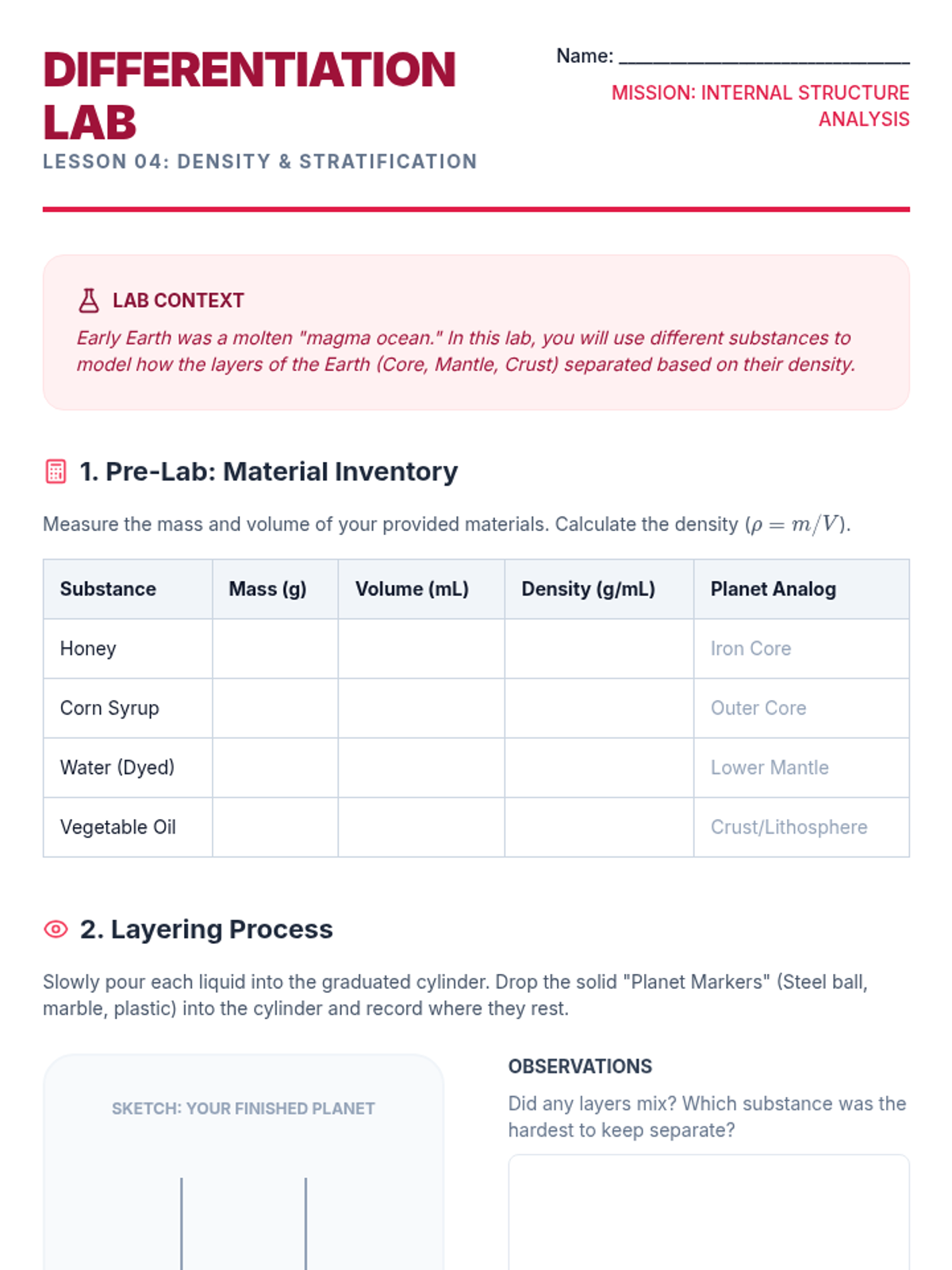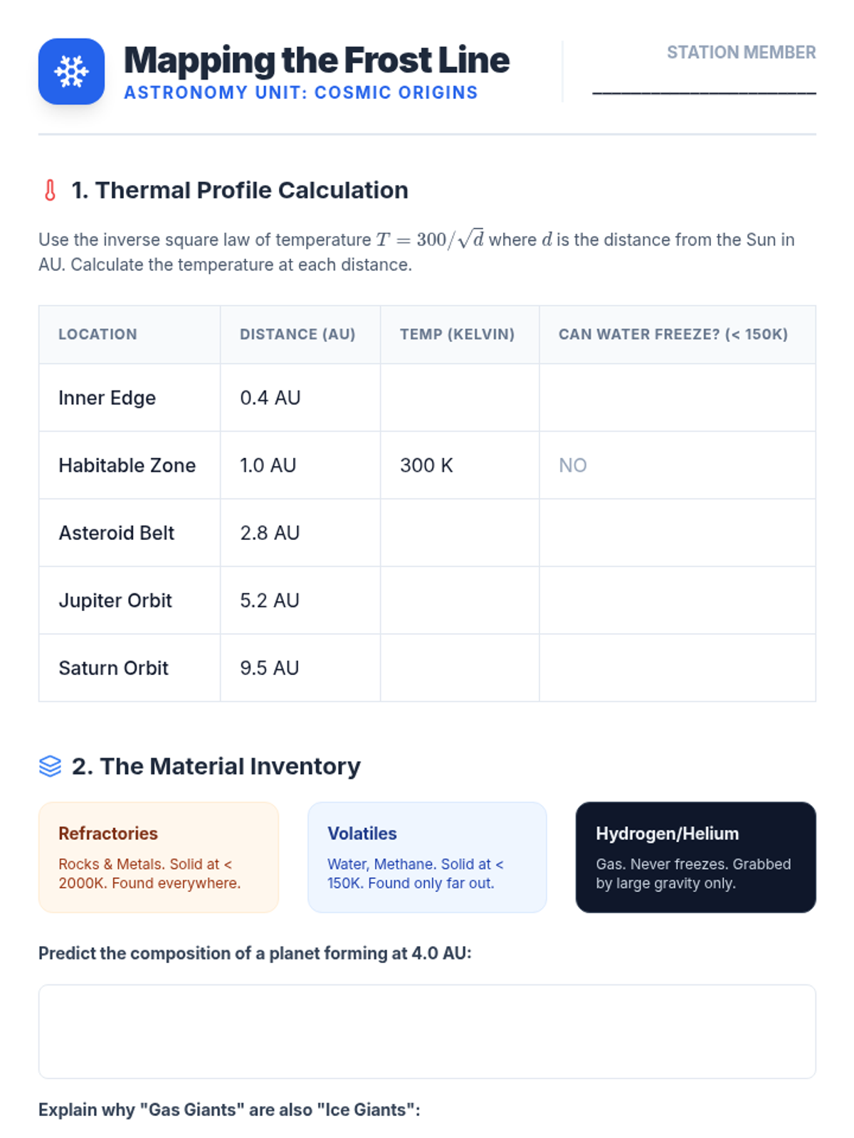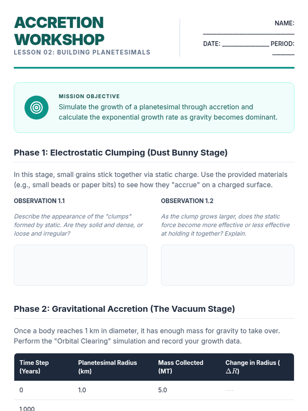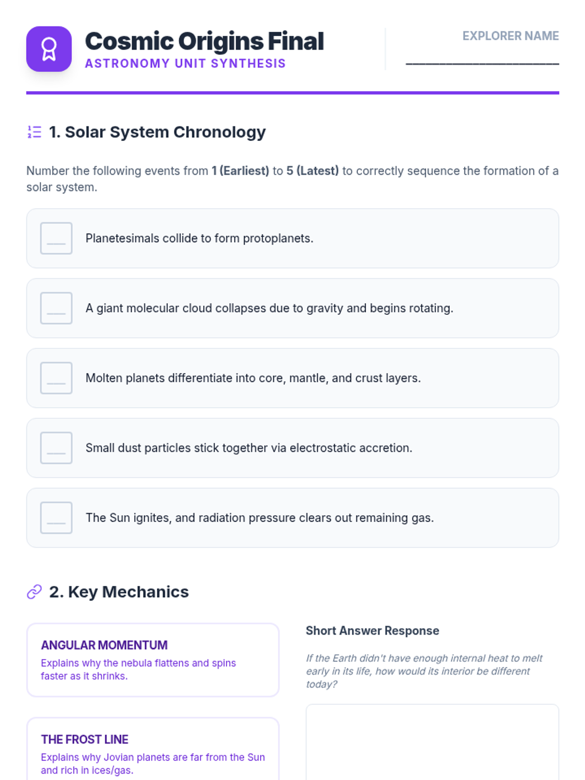 A comprehensive 9th-grade astronomy sequence exploring the Nebular Hypothesis, planetary accretion, the frost line, and the differentiation of planetary layers. Students move from the initial collapse of a nebula to comparing our solar system with distant exoplanetary systems.