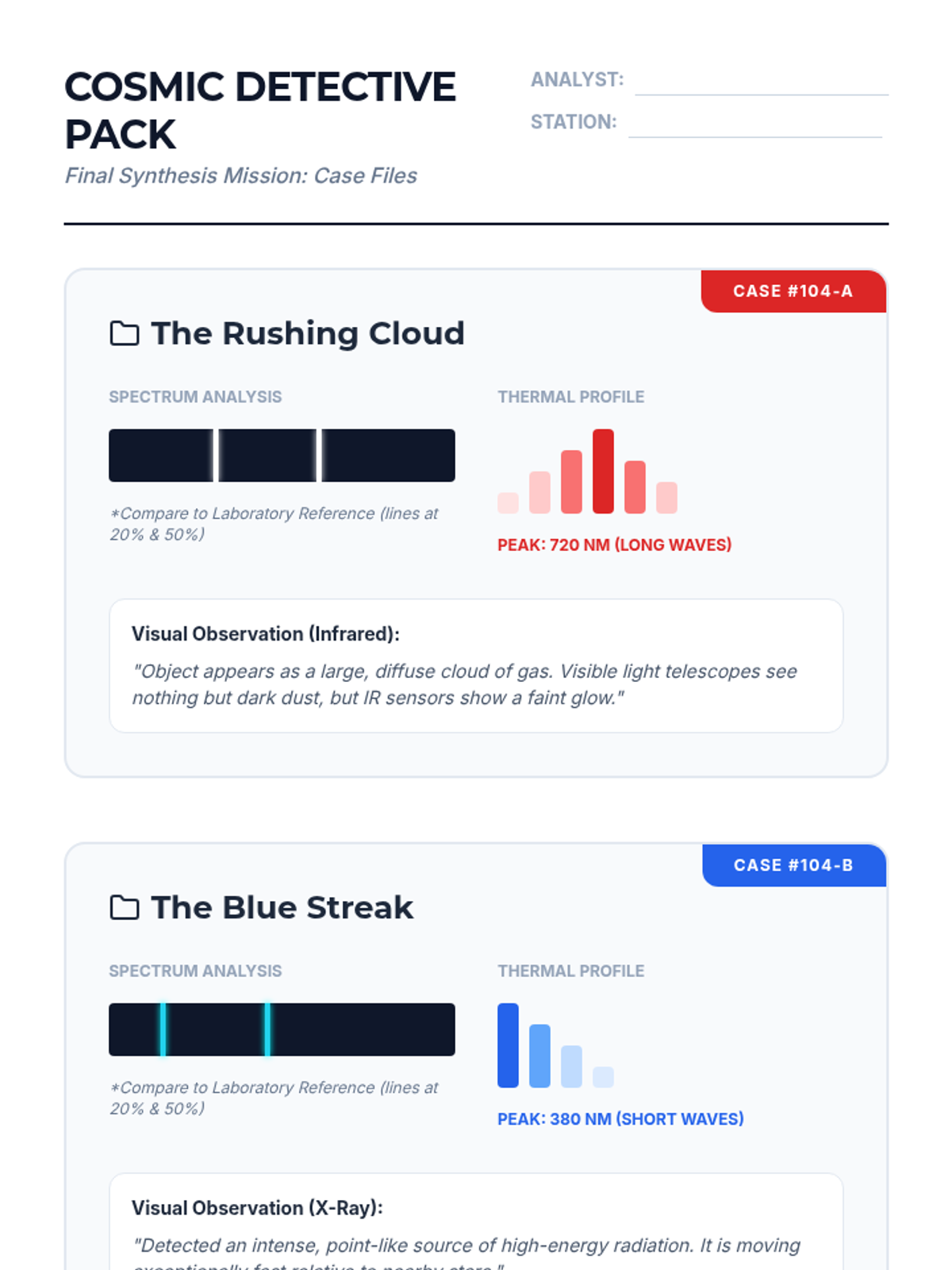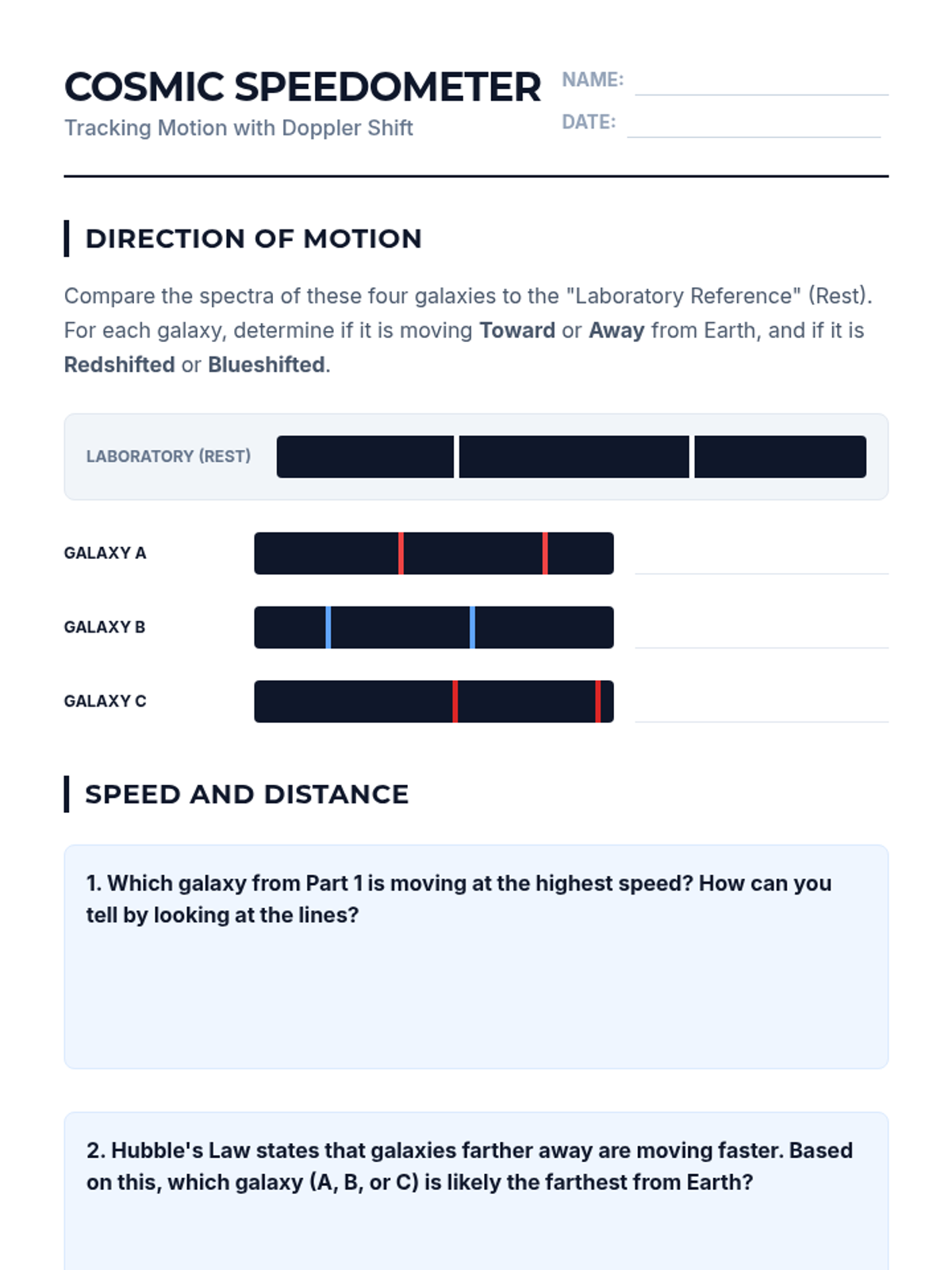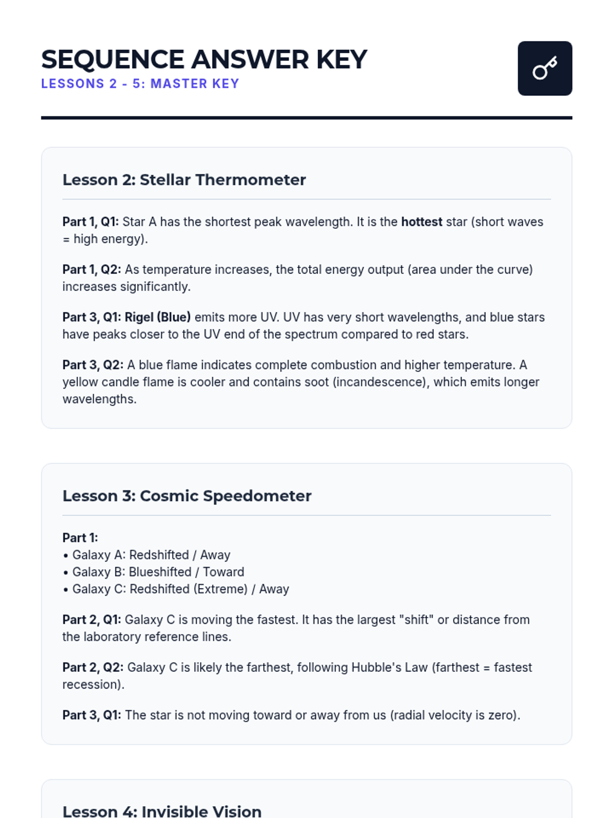 A comprehensive 8th-grade physics sequence exploring how astronomers use electromagnetic waves and spectroscopy to analyze the composition, temperature, and motion of celestial objects millions of light-years away.