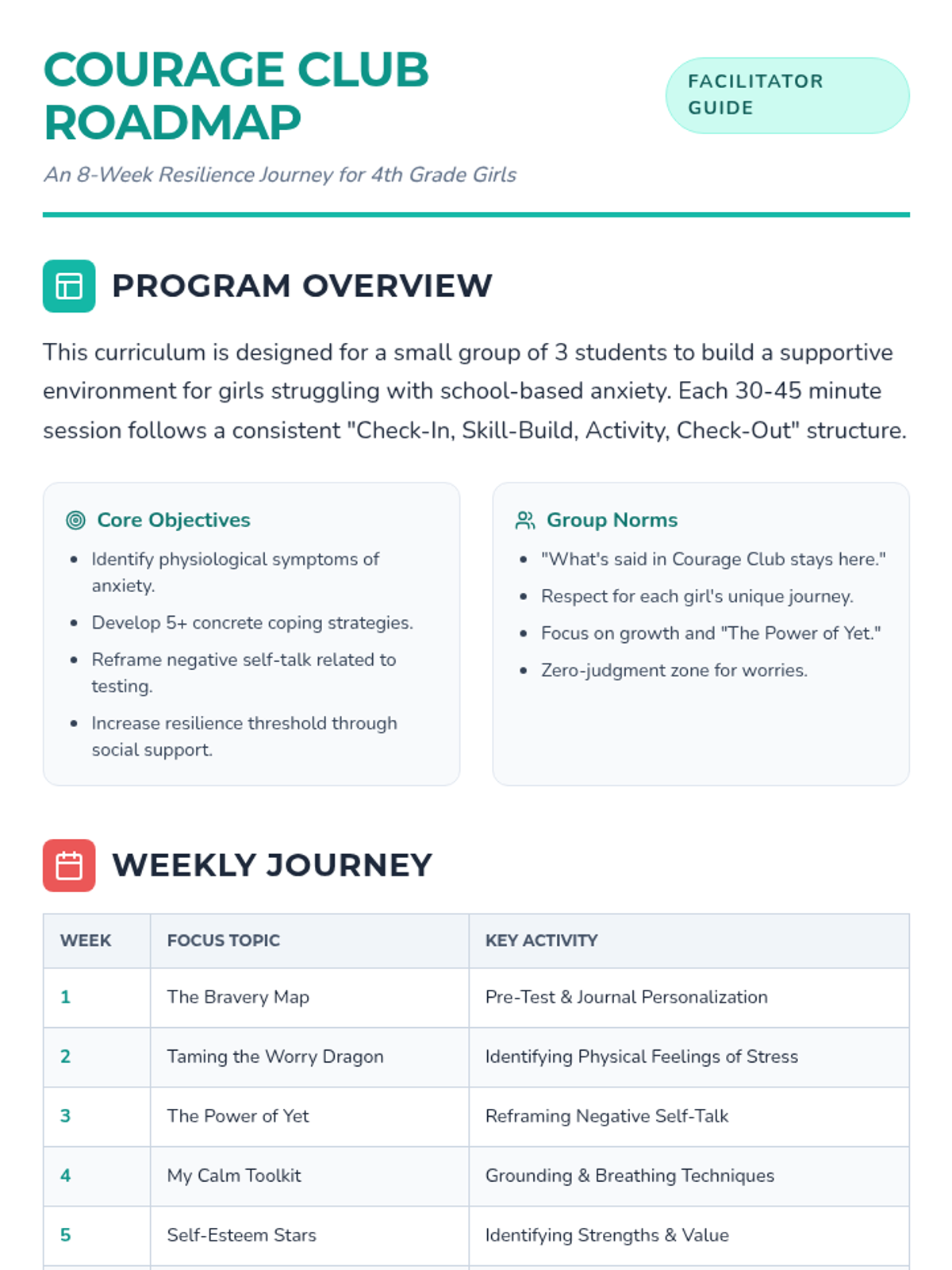 An 8-week small group counseling program designed for 4th-grade girls to manage school and testing anxiety while building resilience and self-esteem. The sequence follows a journey from identifying worries to mastering coping strategies and celebrating growth.