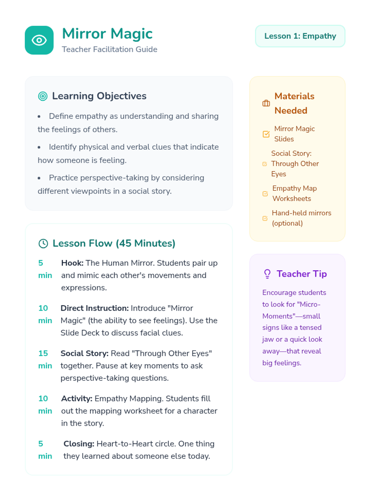 A comprehensive Social Emotional Learning sequence designed to equip students with essential life skills. This sequence covers empathy, conflict resolution, self-regulation, and relationship-building through engaging activities, visual aids, and interactive role-plays.
