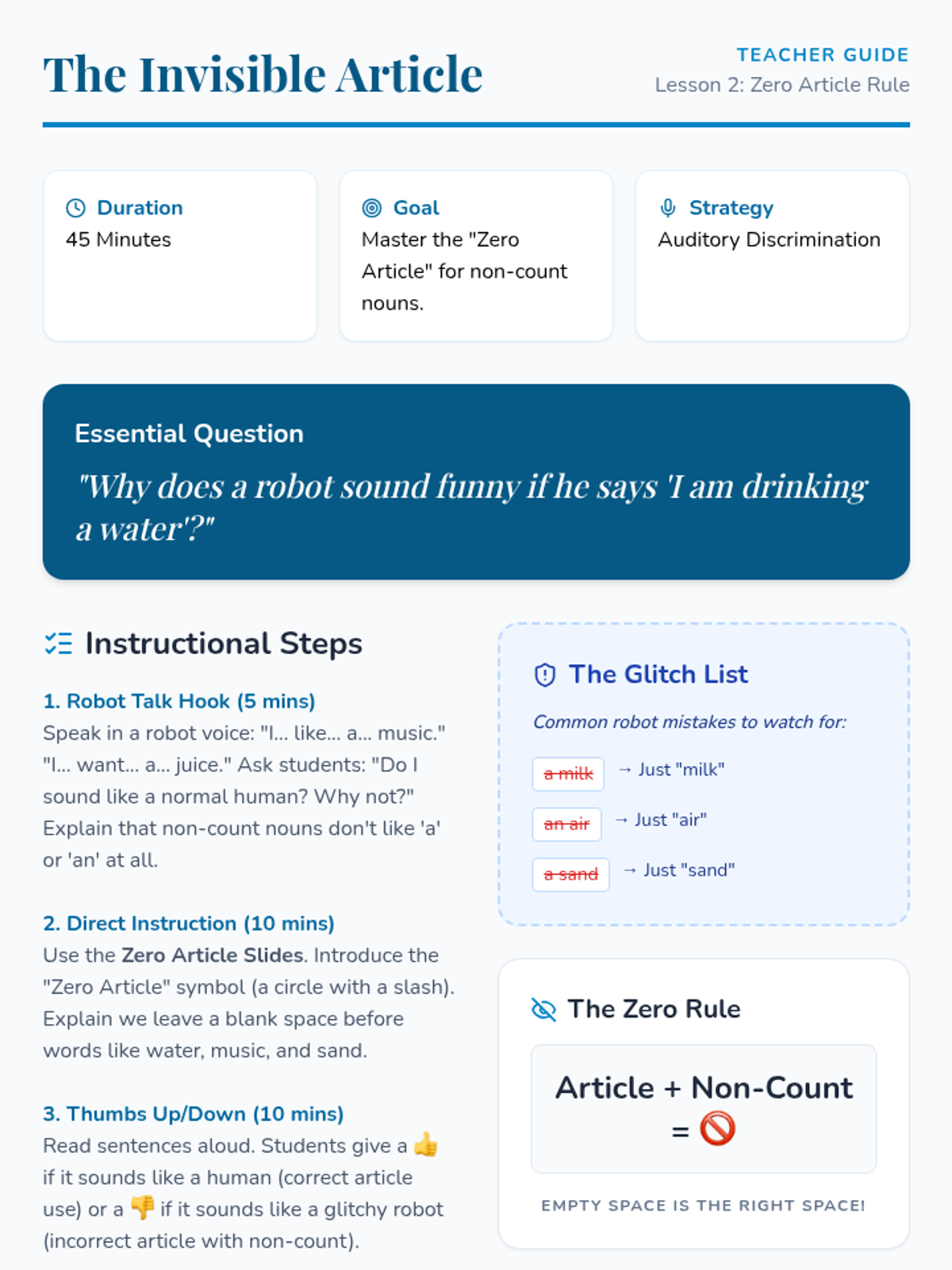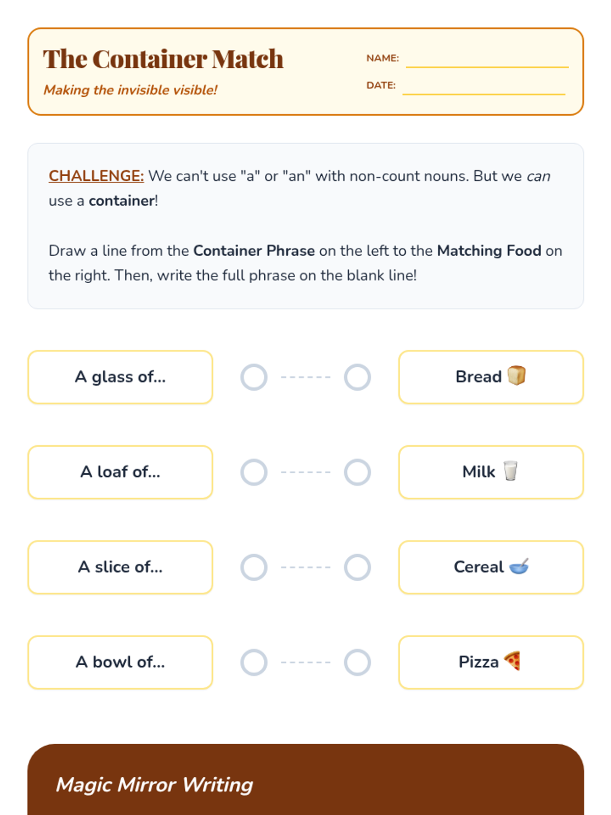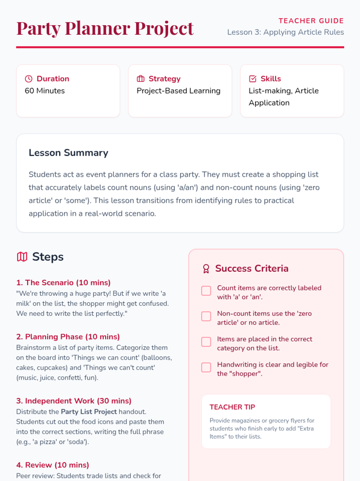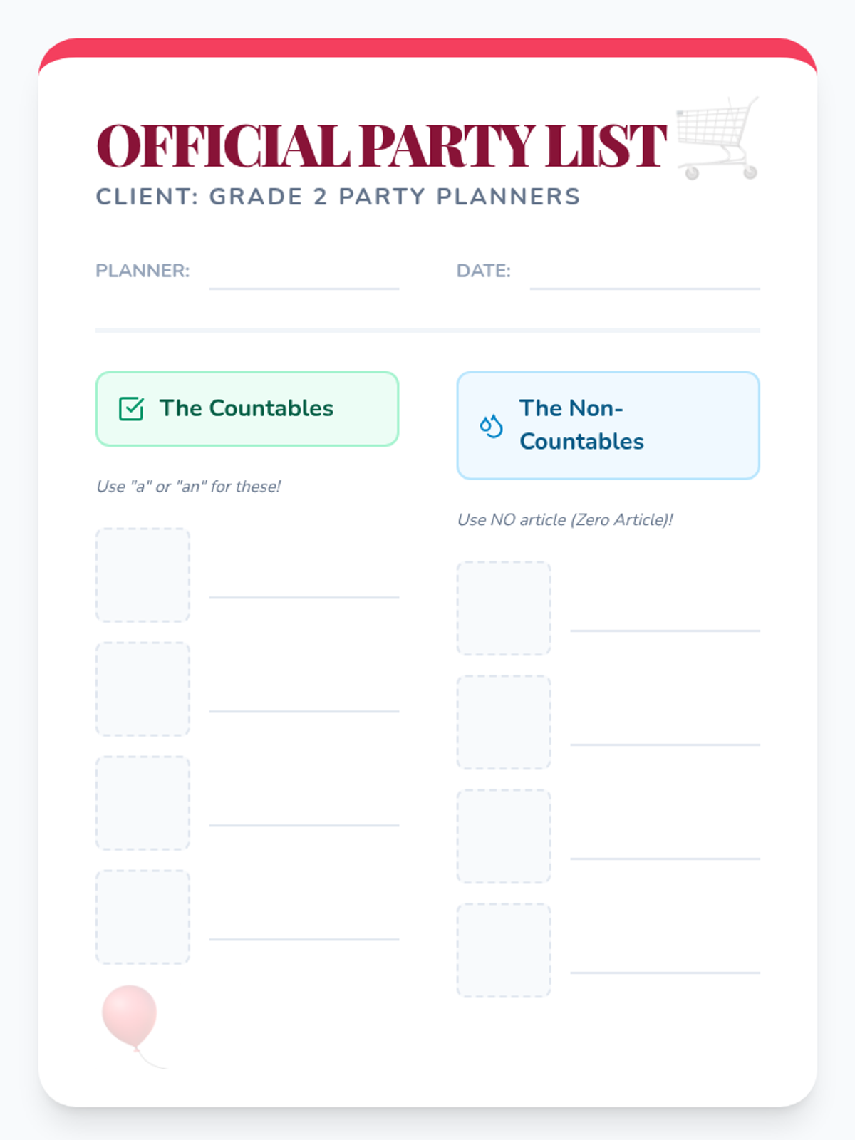 A comprehensive 2nd-grade sequence focusing on the distinction between count and non-count nouns and how they dictate article usage ('a', 'an', or 'zero article'). Using a grocery and food theme, students move from basic categorization to creating complex phrases with quantifiers and designing their own restaurant menus.