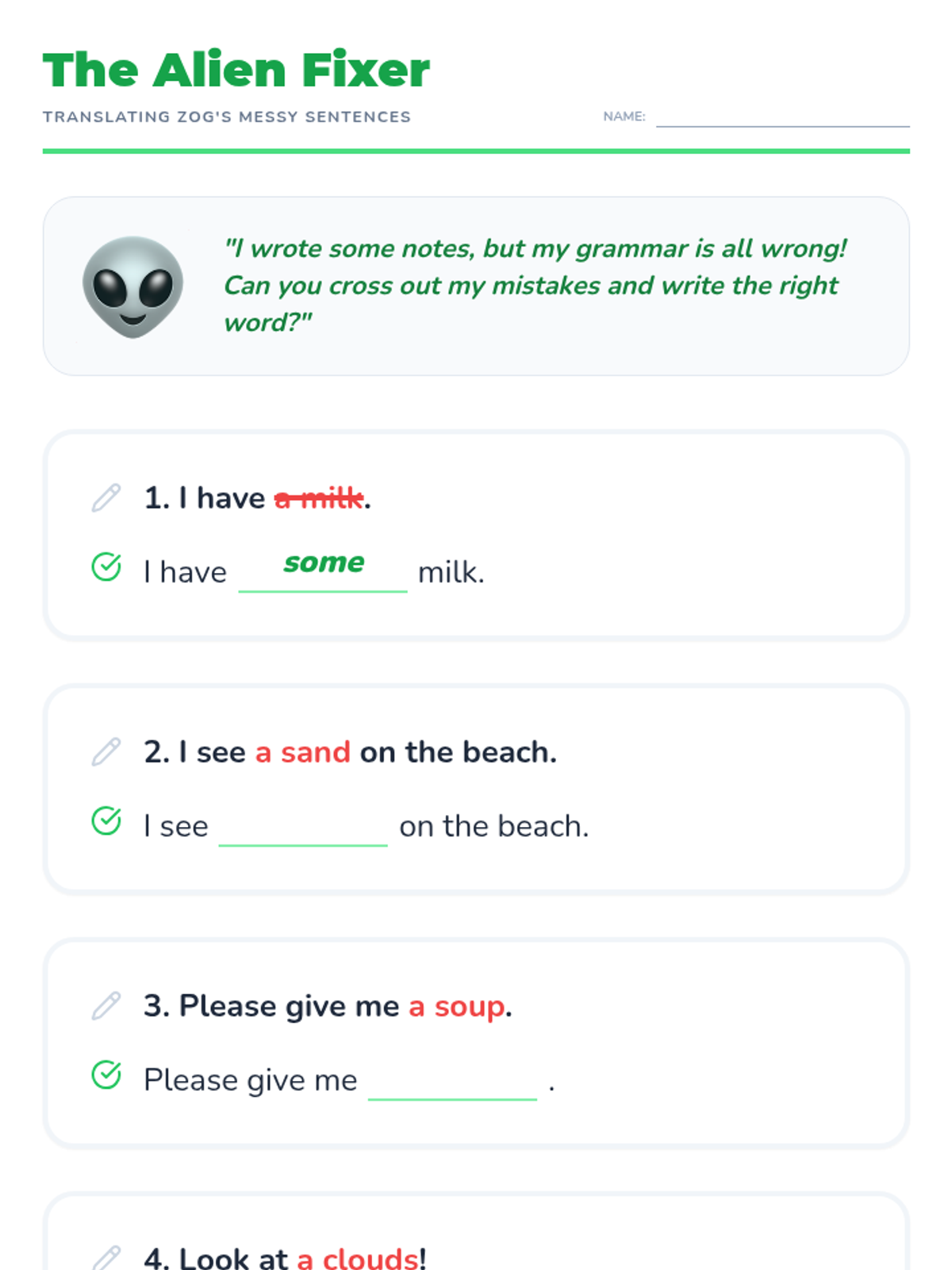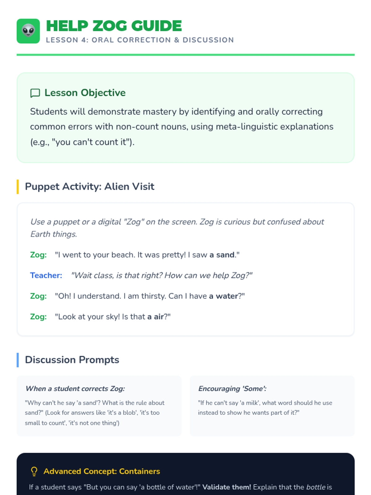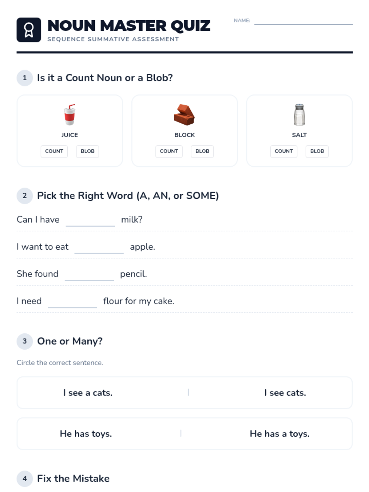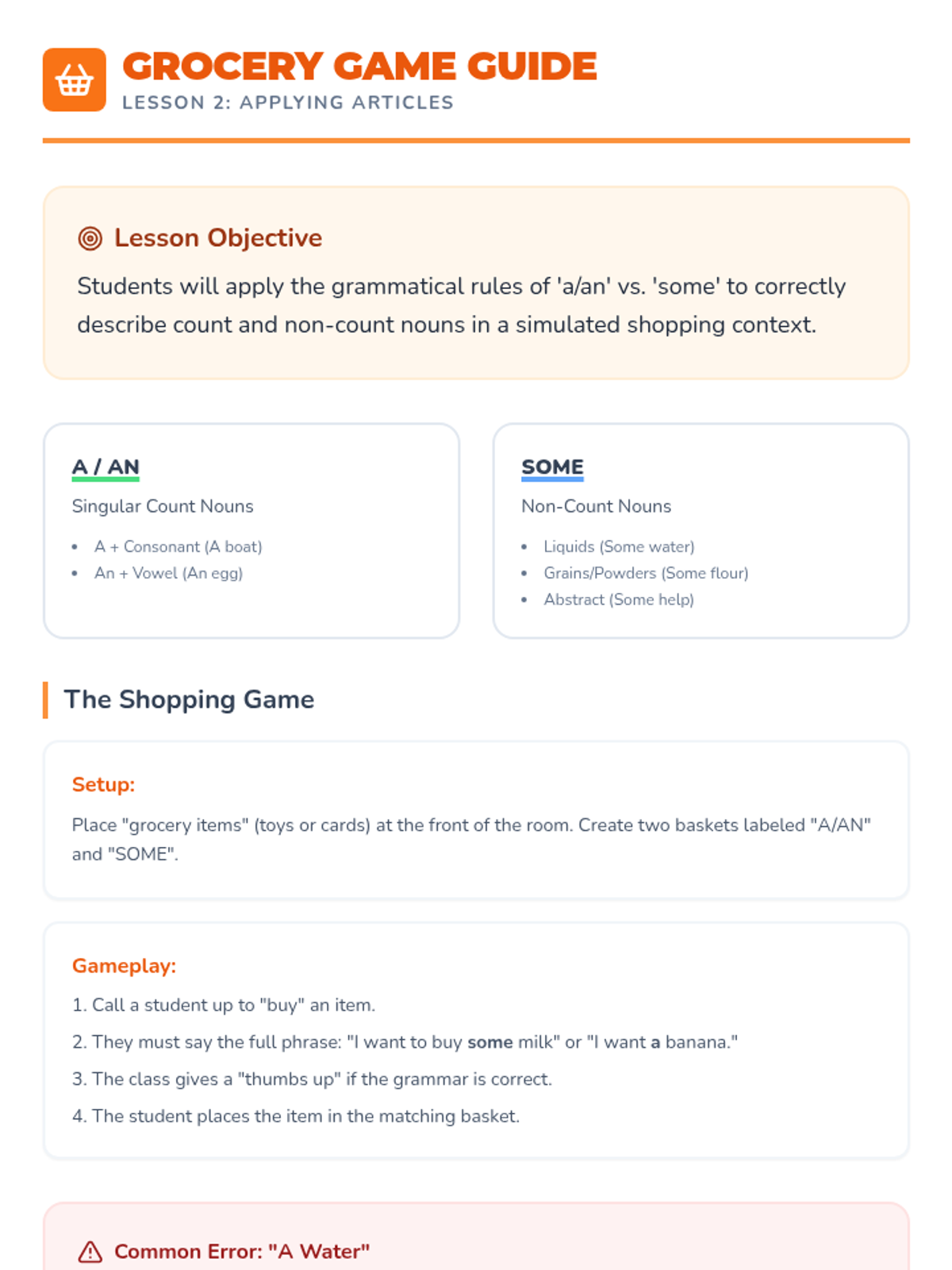 This sequence introduces 1st-grade students to the concepts of count and non-count nouns and the appropriate use of articles (a, an, some). Students will move from physical sorting to constructing descriptive sentences, helping them master the grammatical nuances of different noun types.
