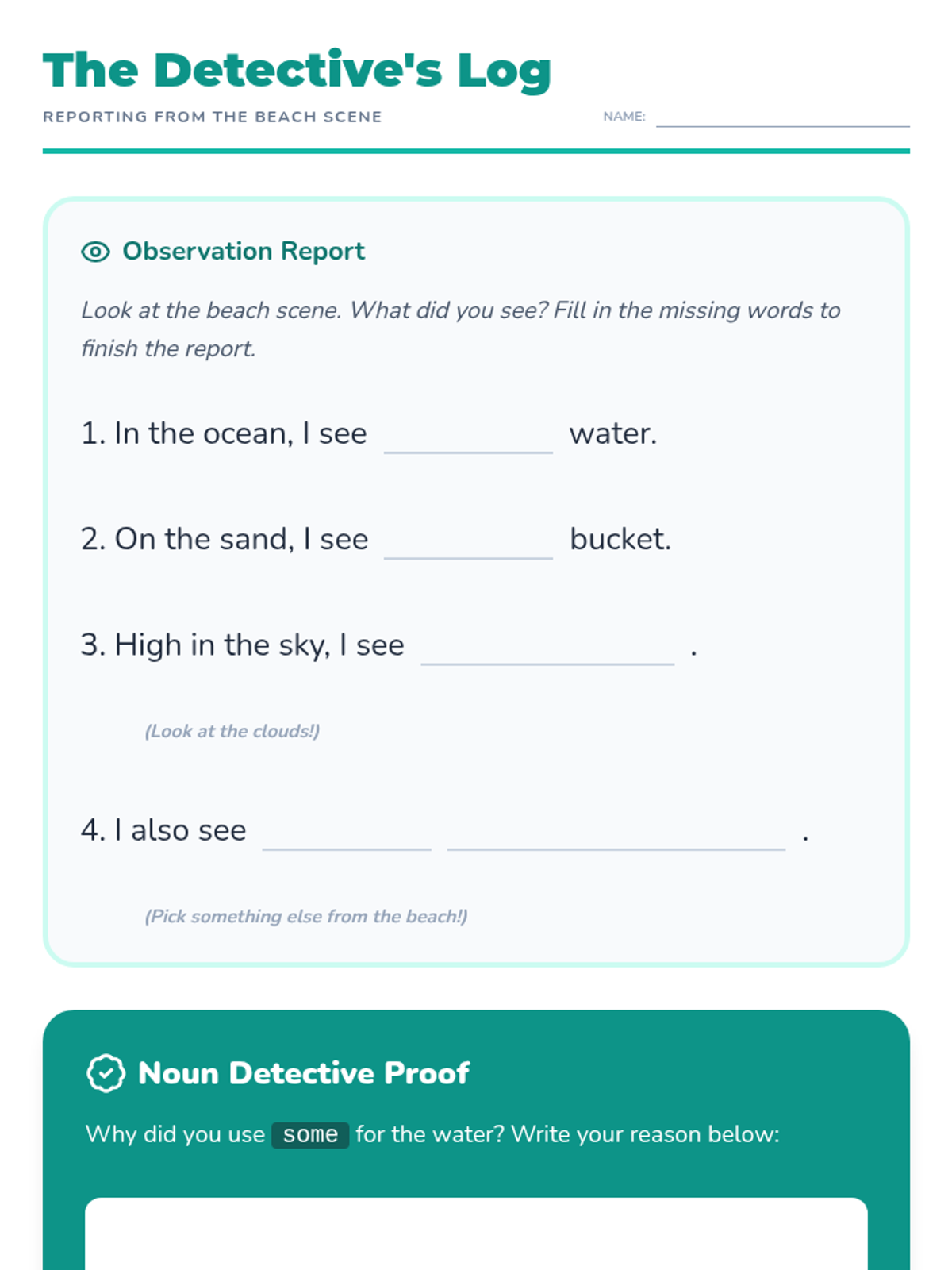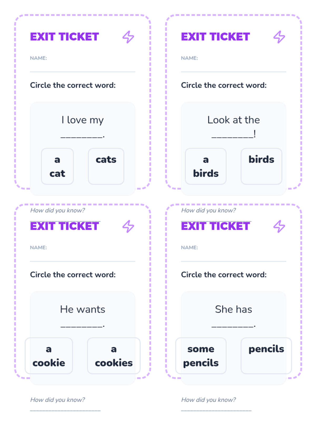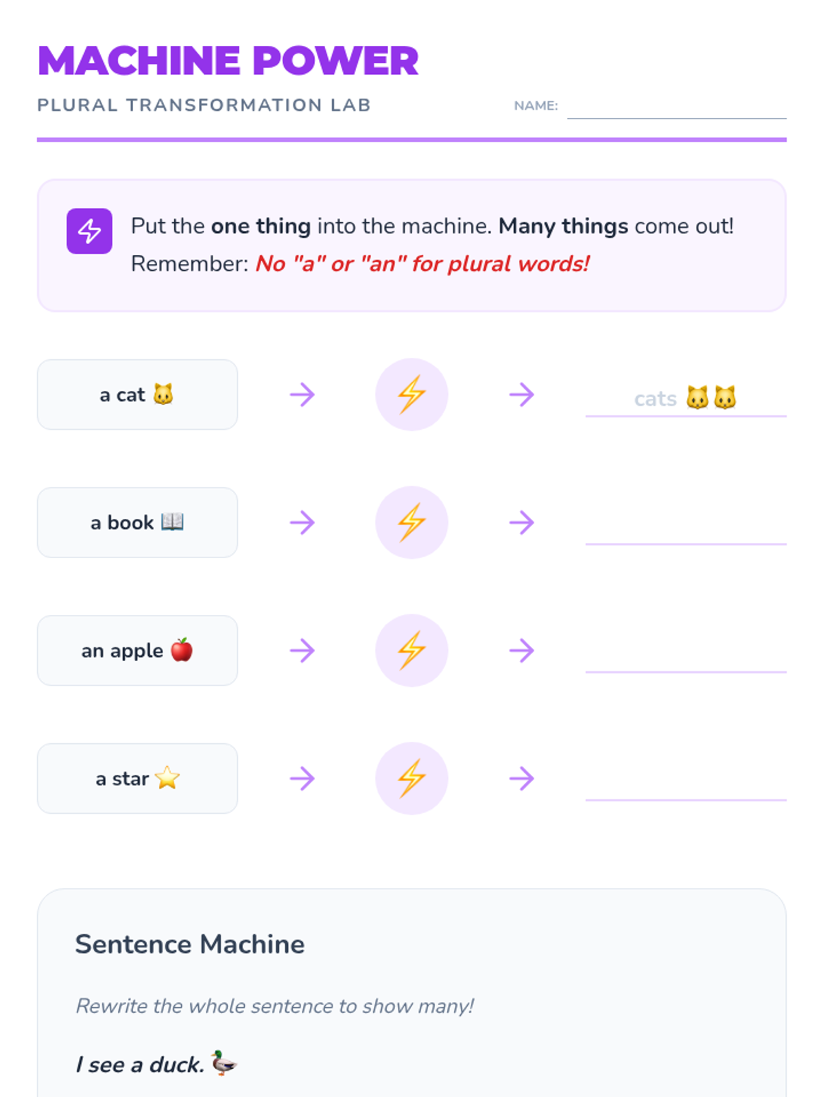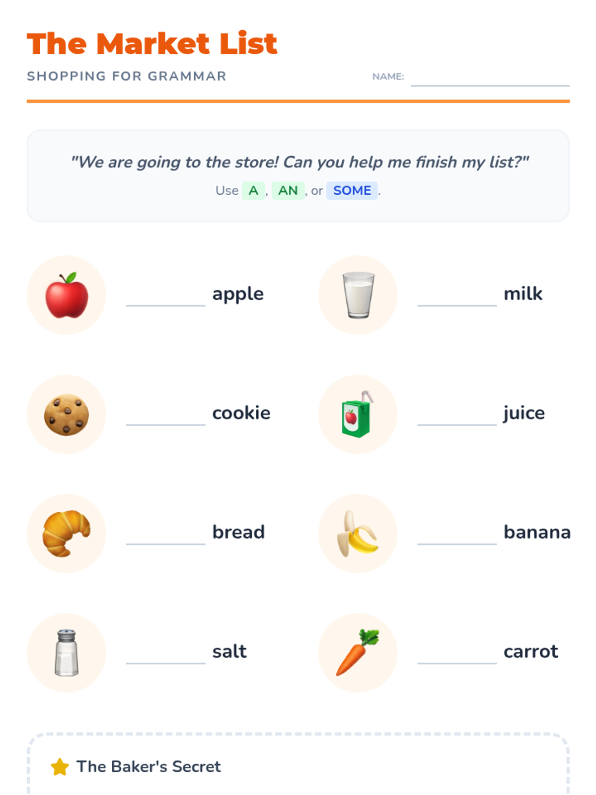 This sequence introduces 1st-grade students to the concepts of count and non-count nouns and the appropriate use of articles (a, an, some). Students will move from physical sorting to constructing descriptive sentences, helping them master the grammatical nuances of different noun types.