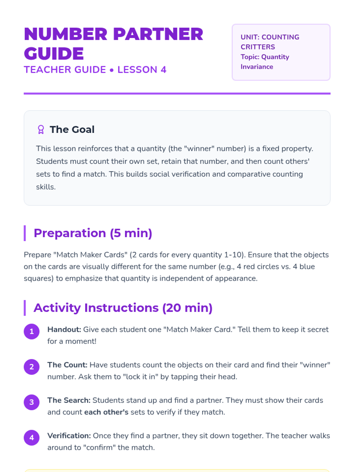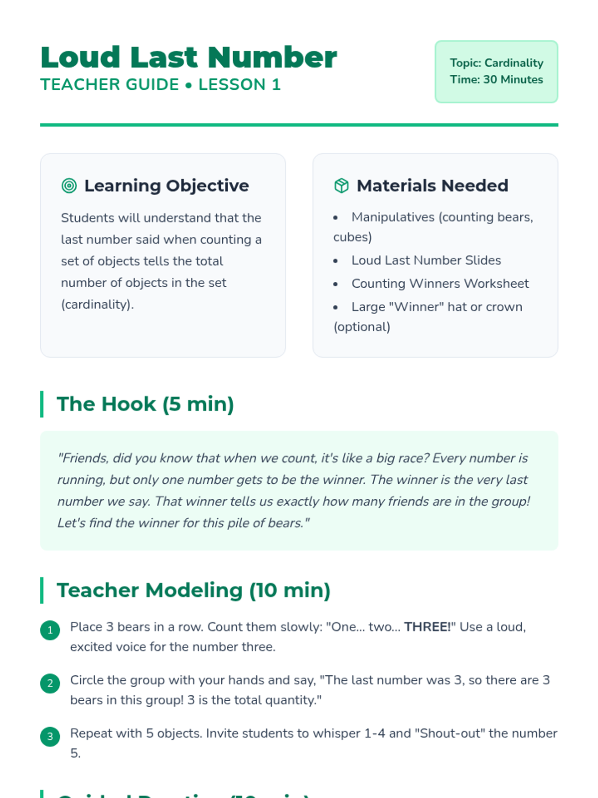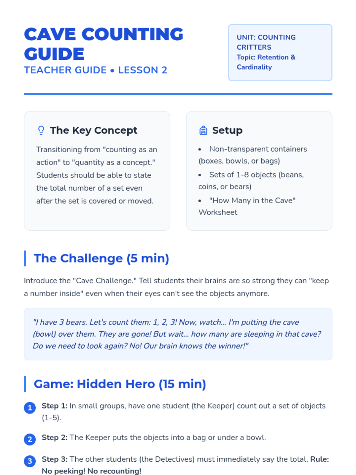 A Kindergarten math sequence focusing on cardinality—the understanding that the last number counted represents the total quantity. Students move from counting as a process to recognizing total amounts through games, set production, and social verification.