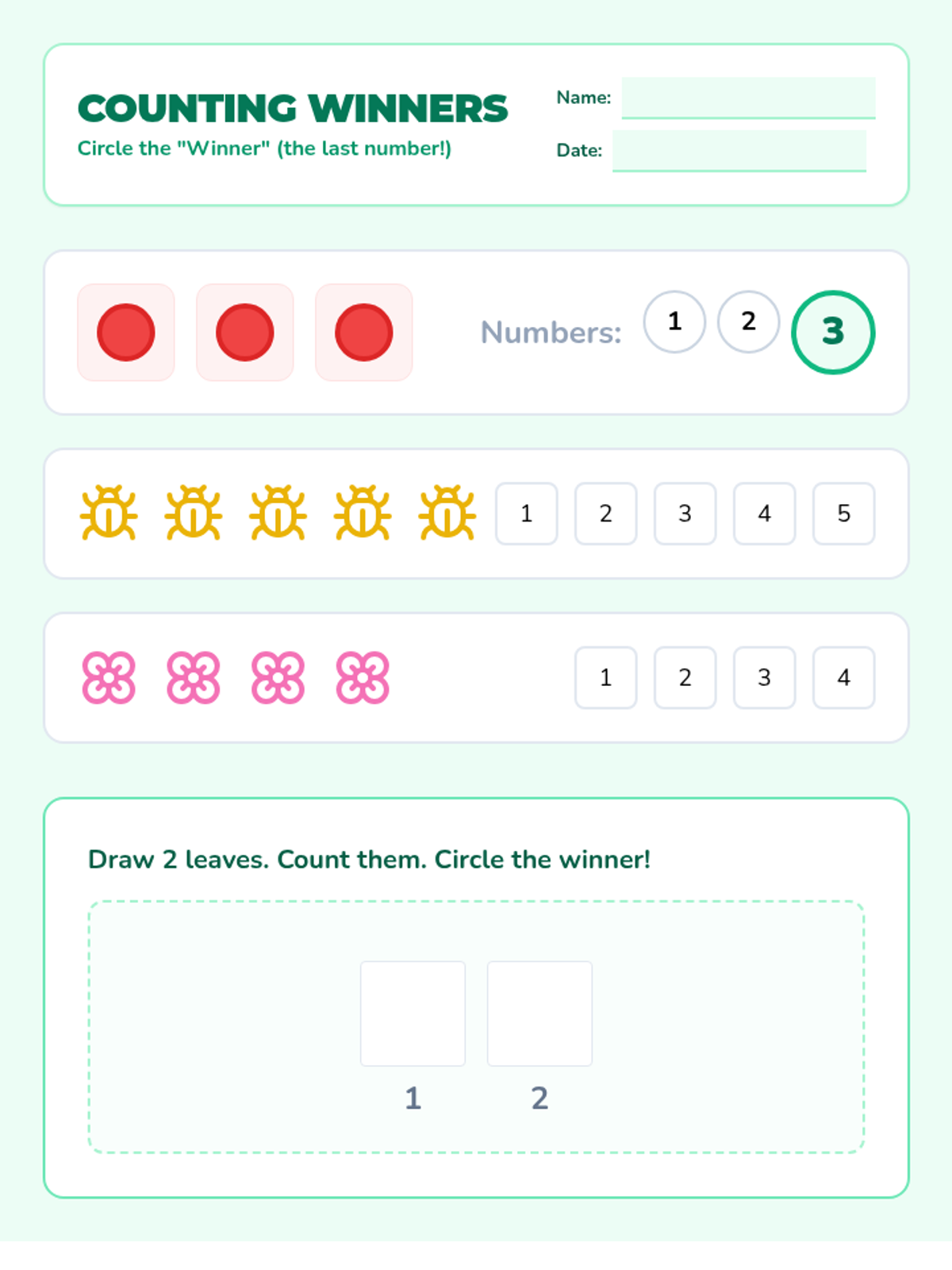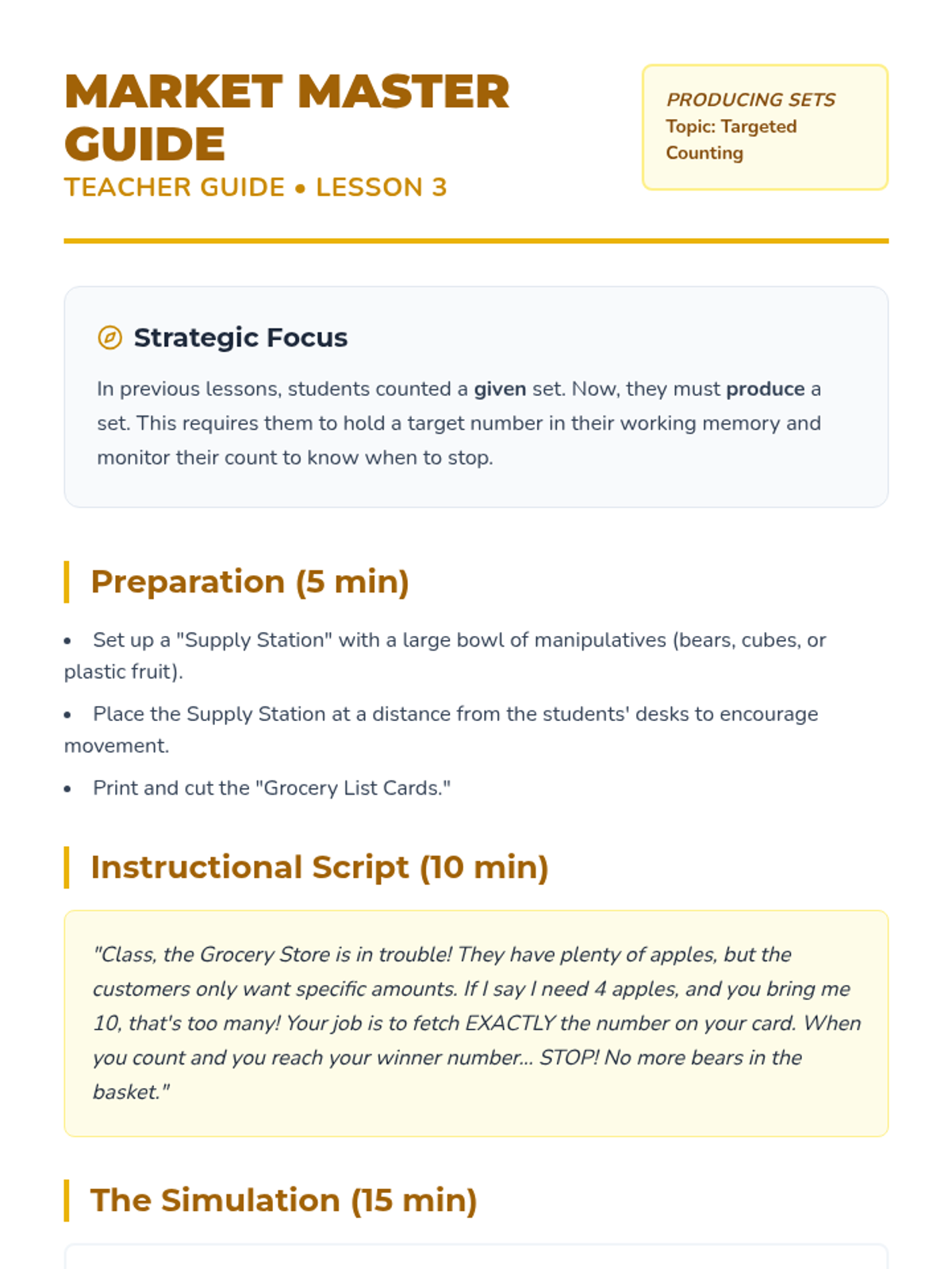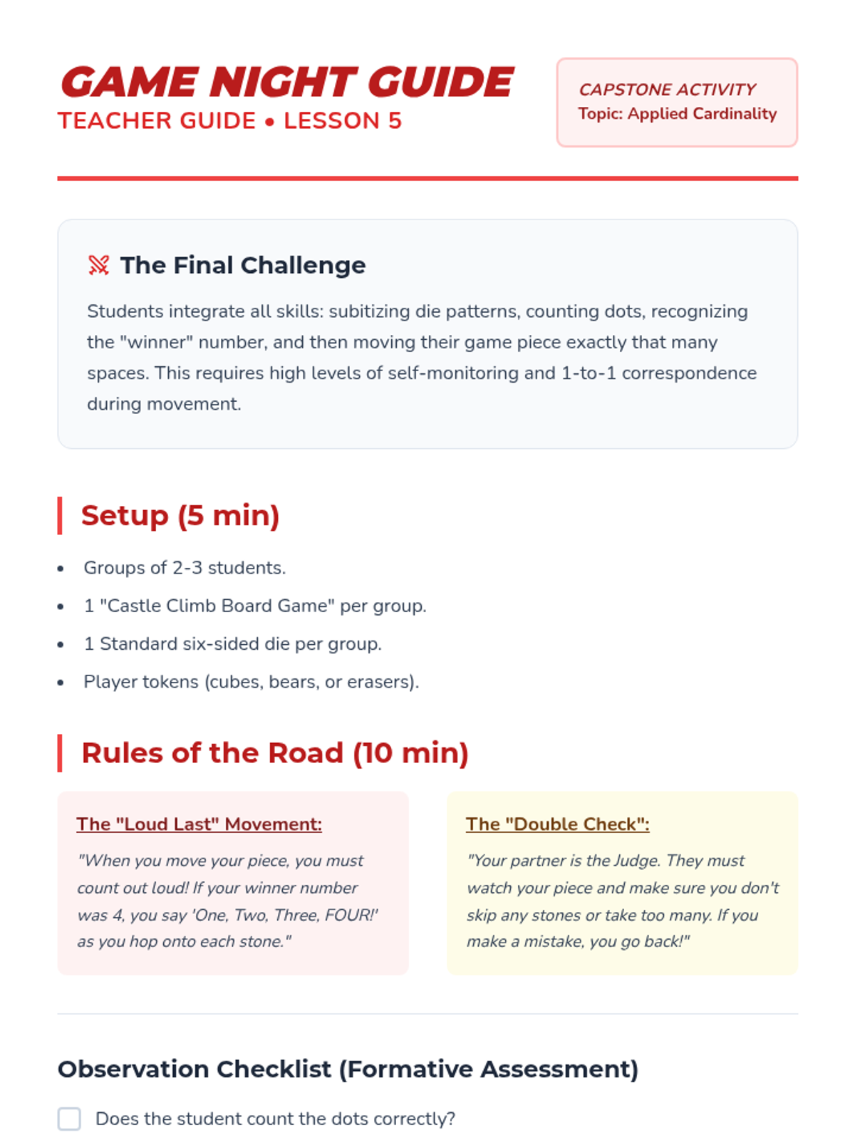 A Kindergarten math sequence focusing on cardinality—the understanding that the last number counted represents the total quantity. Students move from counting as a process to recognizing total amounts through games, set production, and social verification.