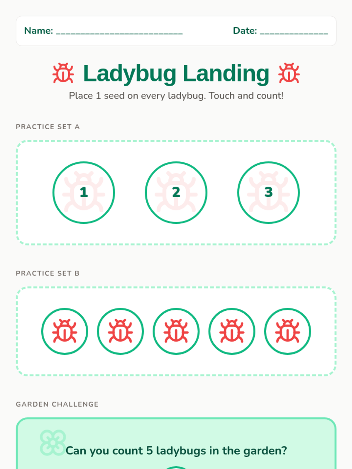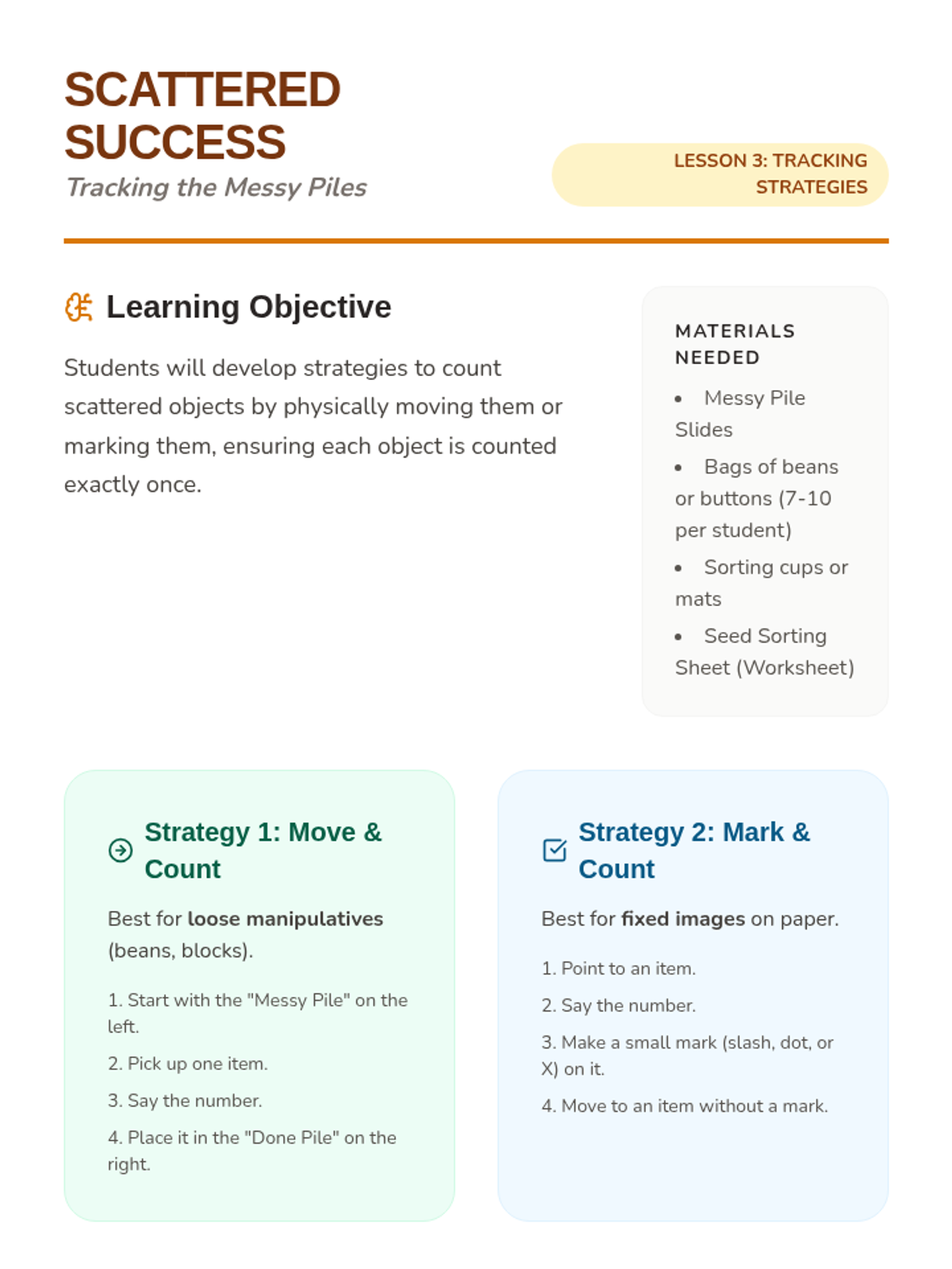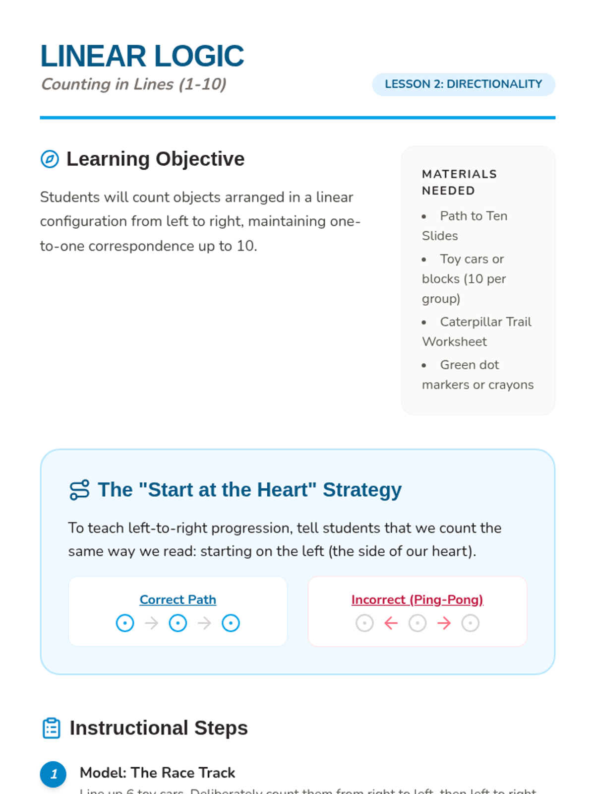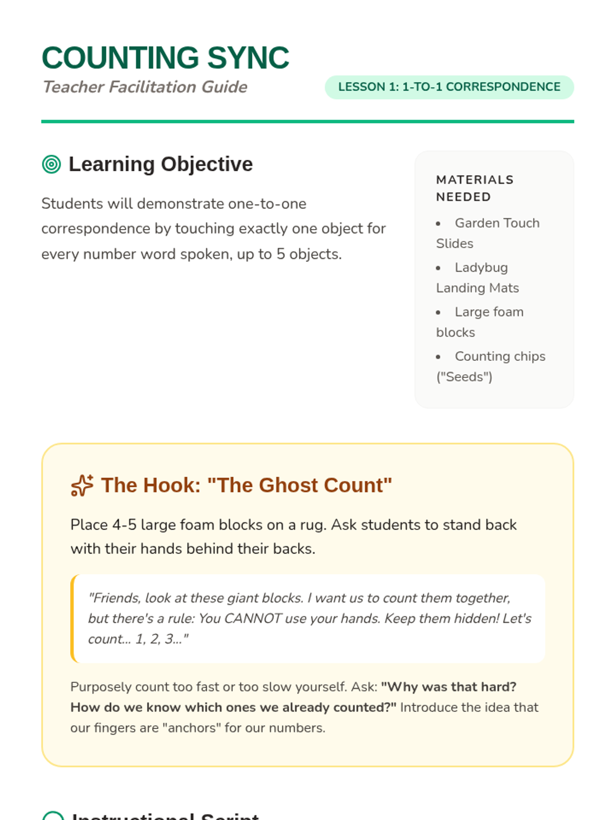 This sequence establishes the foundational principles of counting from 1 to 10 using a workshop approach. Students begin by exploring one-to-one correspondence using concrete manipulatives, ensuring they touch one object for each number word spoken. The learning arc progresses from counting in linear arrangements to scattered configurations, culminating in the understanding of cardinality\u2014that the last number spoken represents the total quantity. By the end, students will confidently count and identify sets up to 10 objects.