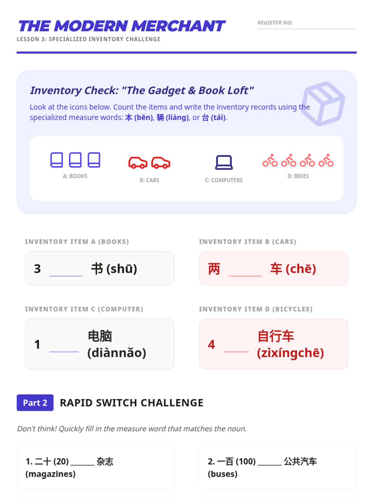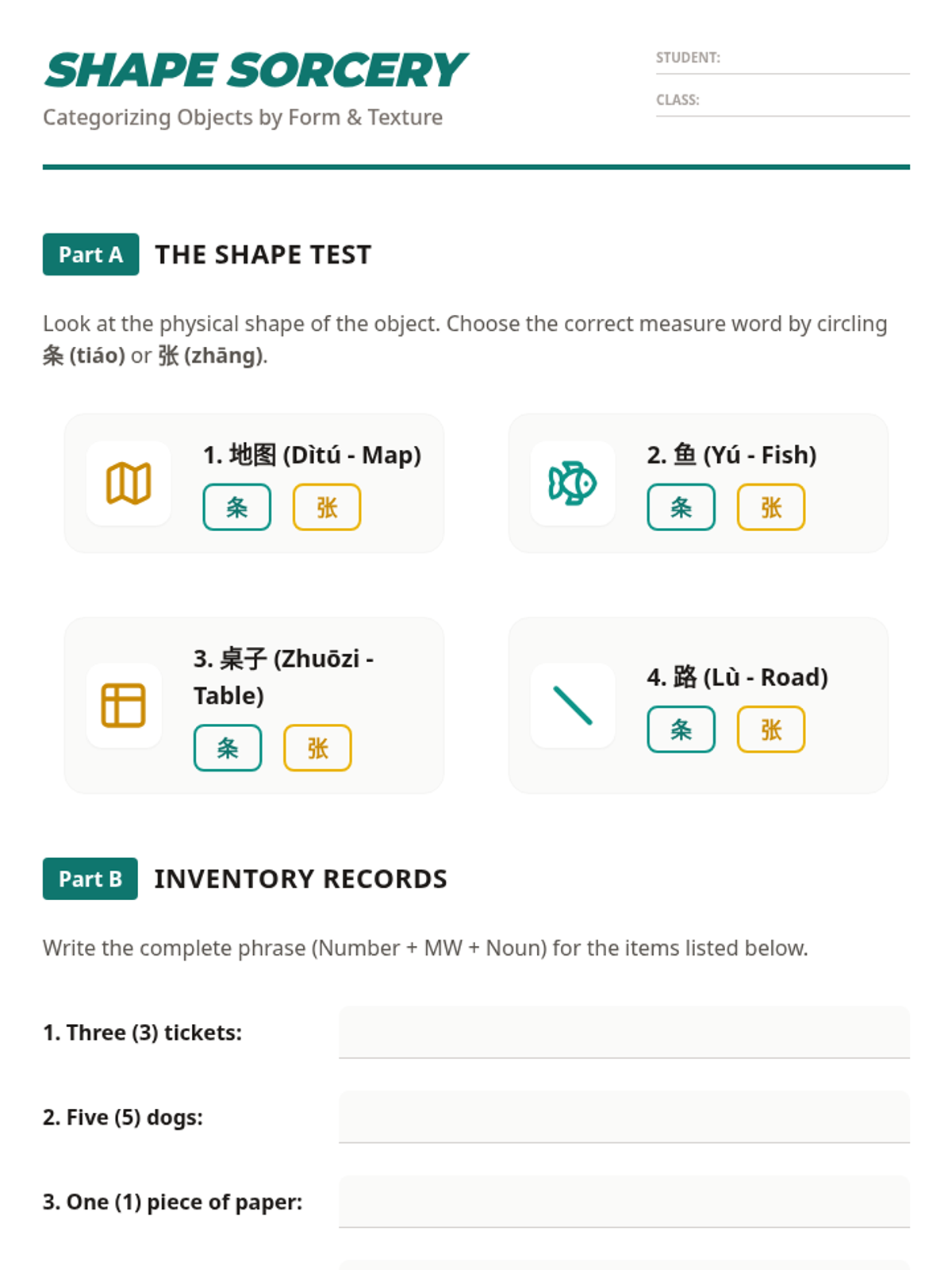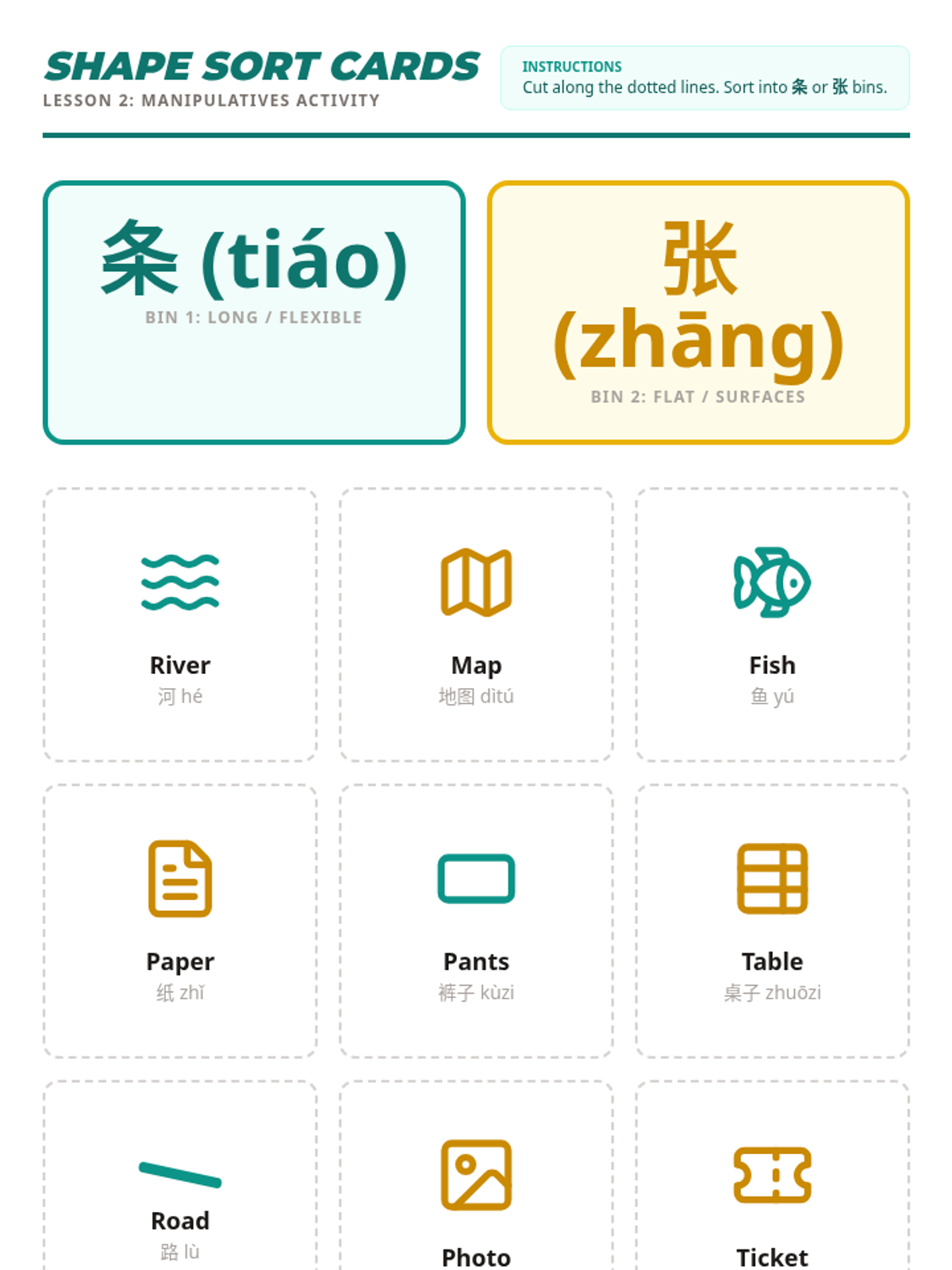 This sequence explores the essential role of measure words in Mandarin Chinese, progressing from basic conceptual understanding to shape-based categorization and finally to real-world application in a market simulation. Students move beyond the generic 'gè' to master specific classifiers for various object types.