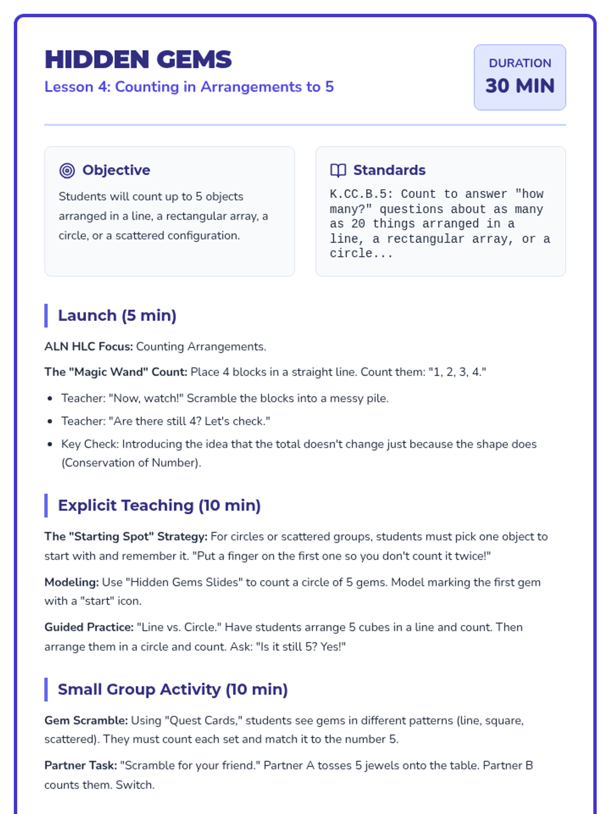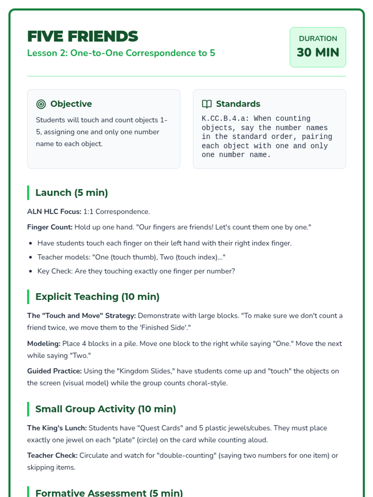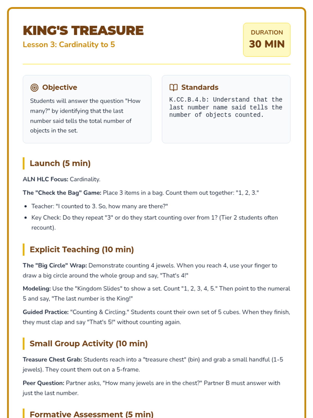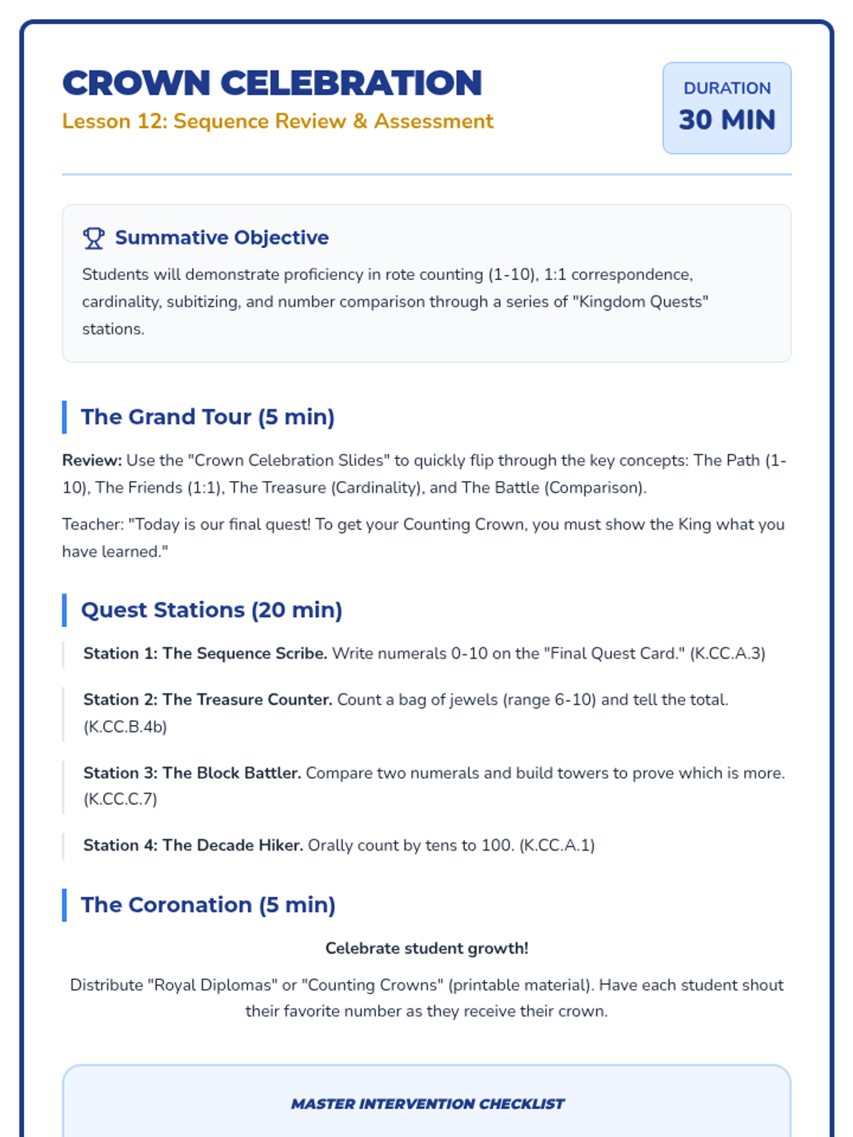 A 12-lesson Tier 2 intervention sequence for Kindergarten focusing on counting, cardinality, and comparison. Based on ALN High Leverage Concepts and IM methods, it uses the 'Counting Kingdom' theme to engage young learners with manipulatives and visual models.
