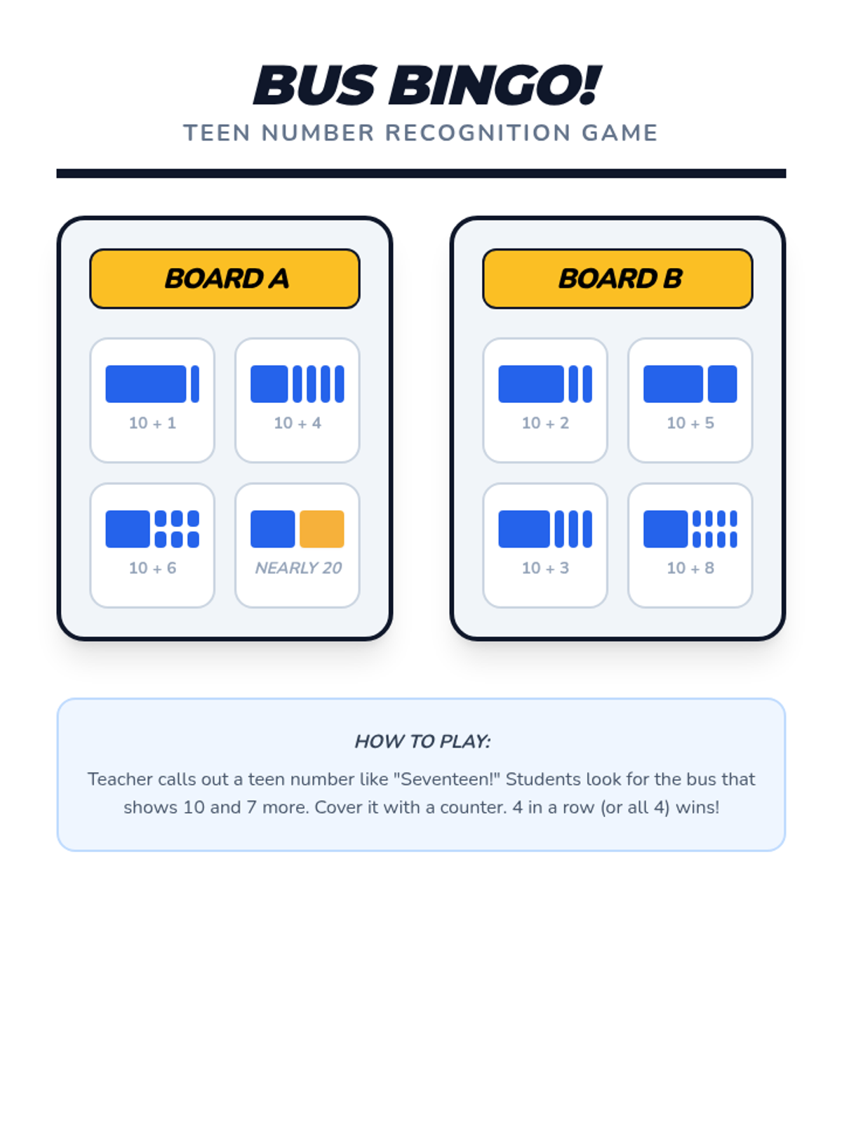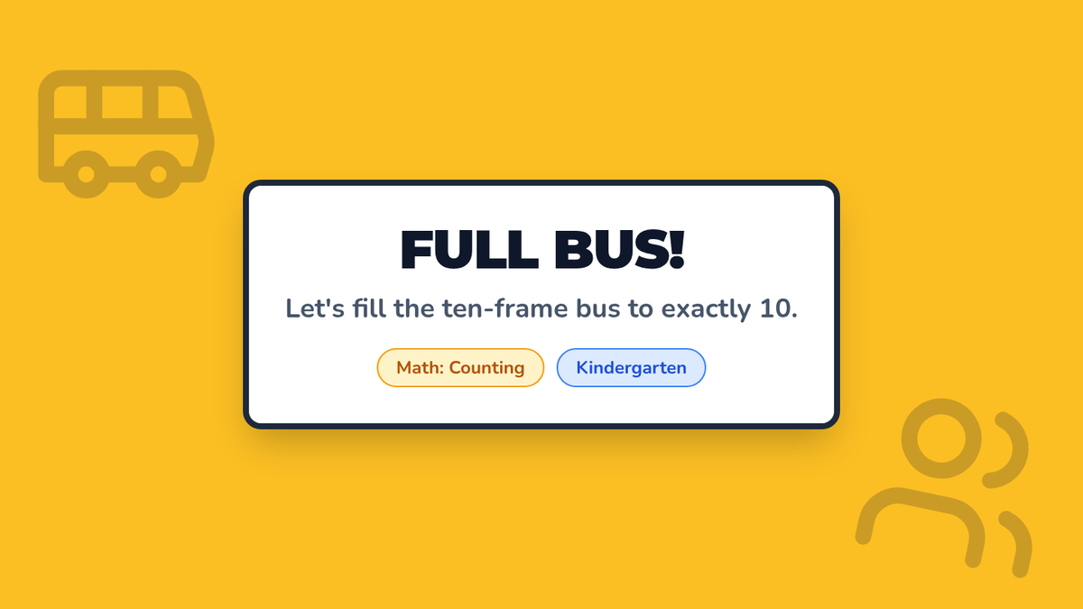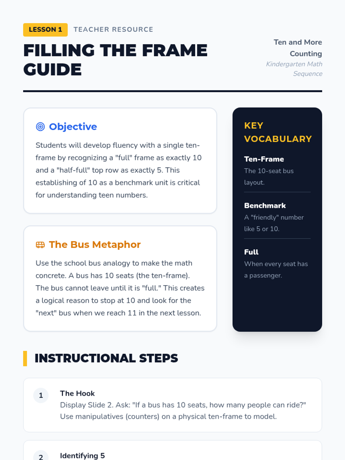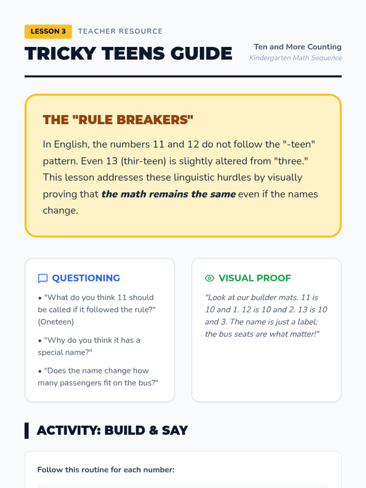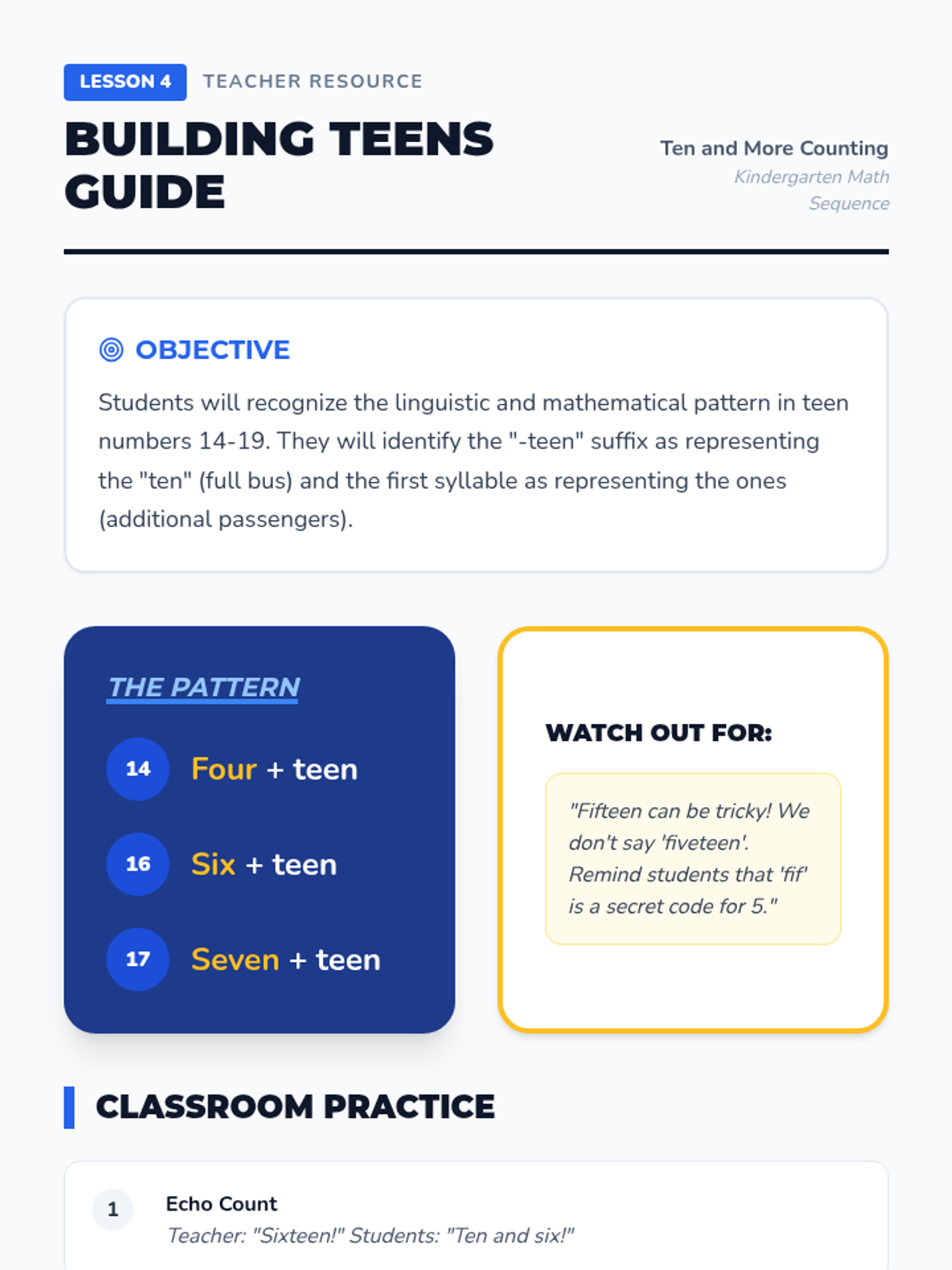 A Kindergarten sequence focused on the transition from counting 1-10 to mastering teen numbers (11-19) using the 'ten and some more' concept. Students use a school bus/ten-frame visual theme to build base-ten understanding.