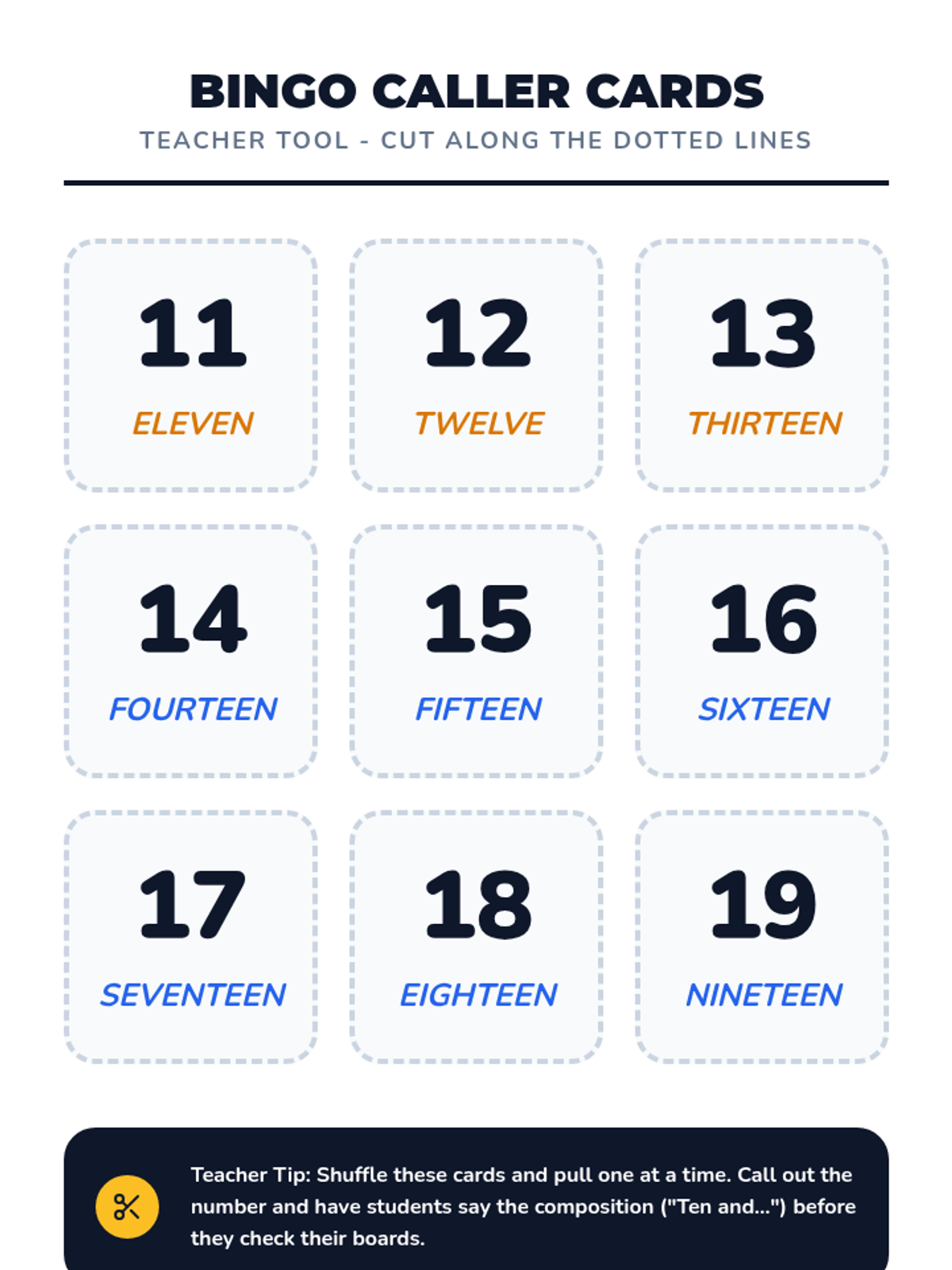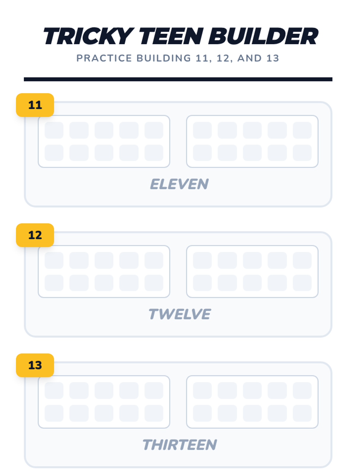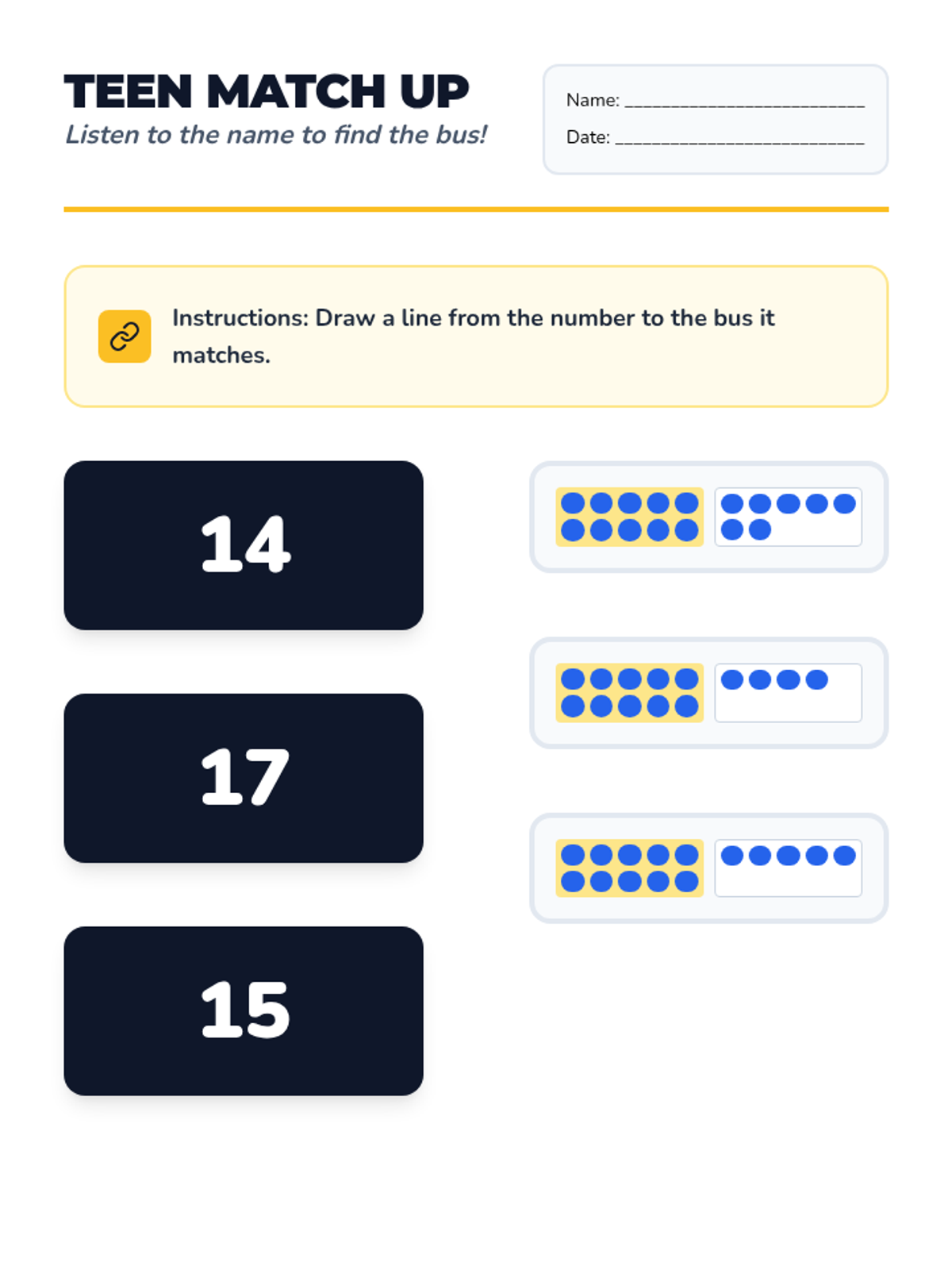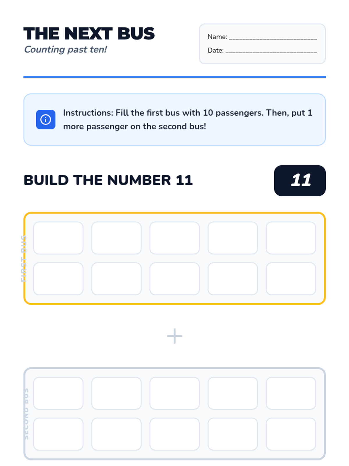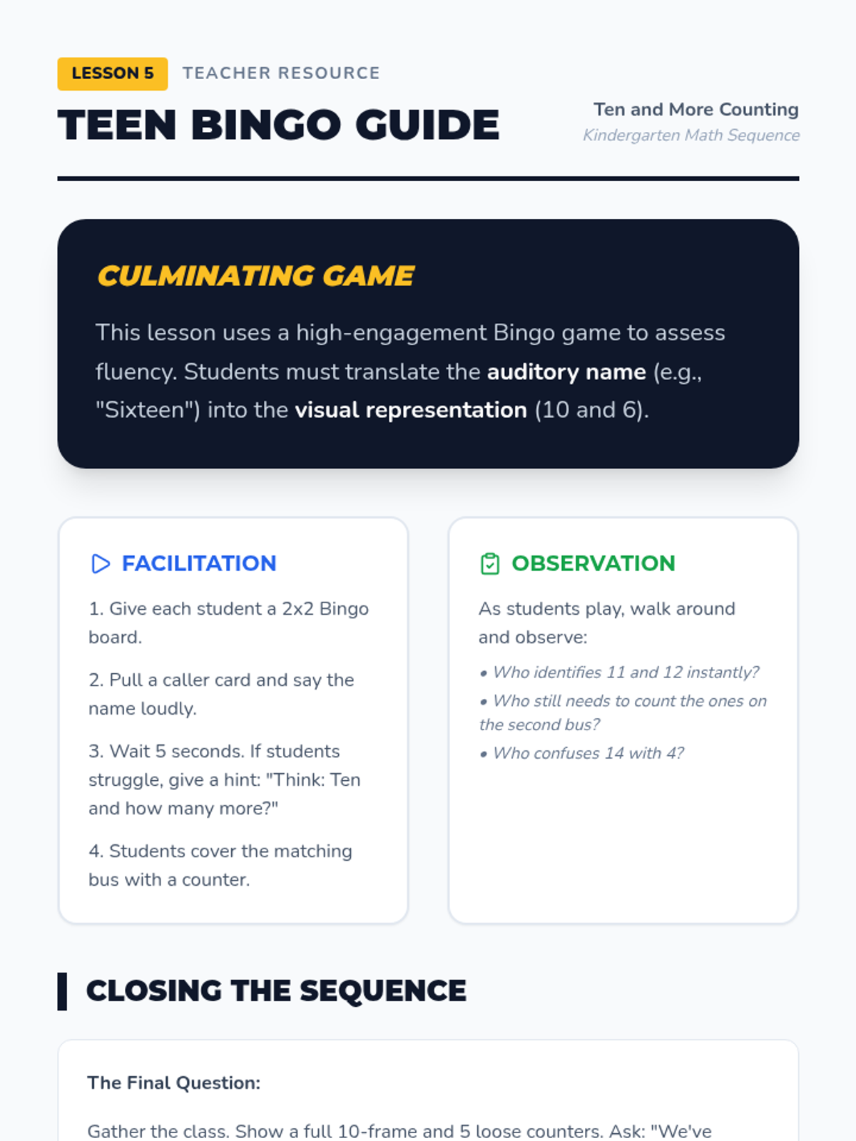 A Kindergarten sequence focused on the transition from counting 1-10 to mastering teen numbers (11-19) using the 'ten and some more' concept. Students use a school bus/ten-frame visual theme to build base-ten understanding.
