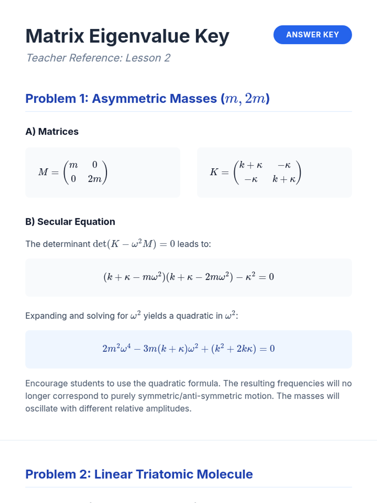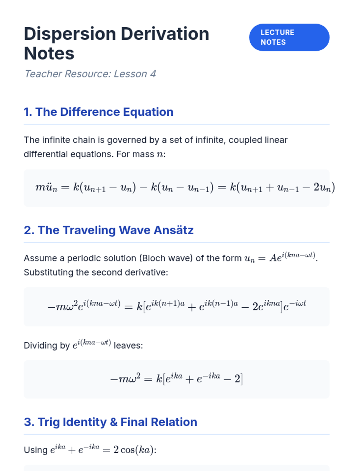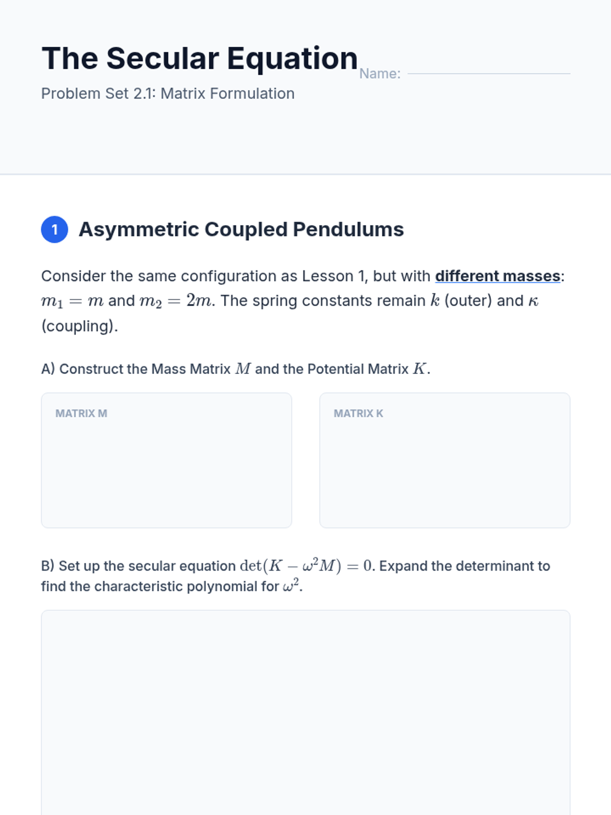 A graduate-level exploration of coupled oscillators, eigenmode analysis, and the transition from discrete systems to continuum wave mechanics. Students master the mathematical tools of linear algebra and Lagrangian mechanics to describe collective physical behaviors.