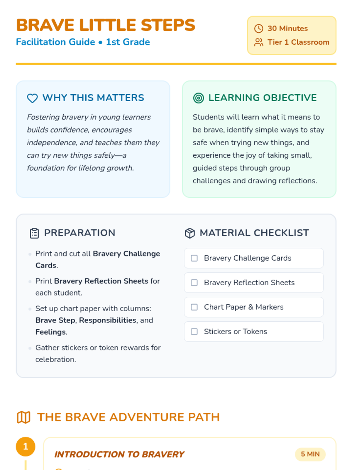 A sequence of lessons exploring bravery and responsible risk-taking for primary and upper elementary students, focusing on building confidence through safe challenges and reflection.
