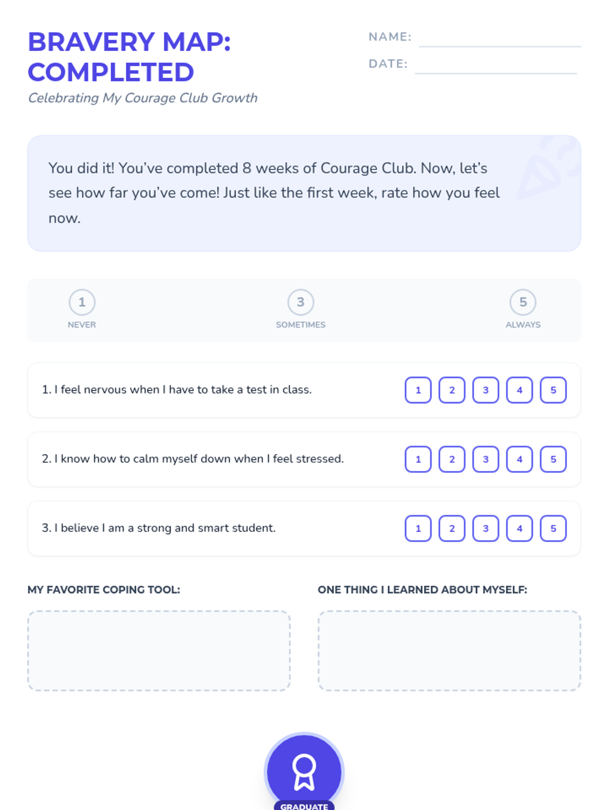 An 8-week small group counseling program designed for 4th-grade girls to manage school and testing anxiety while building resilience and self-esteem. The sequence follows a journey from identifying worries to mastering coping strategies and celebrating growth.