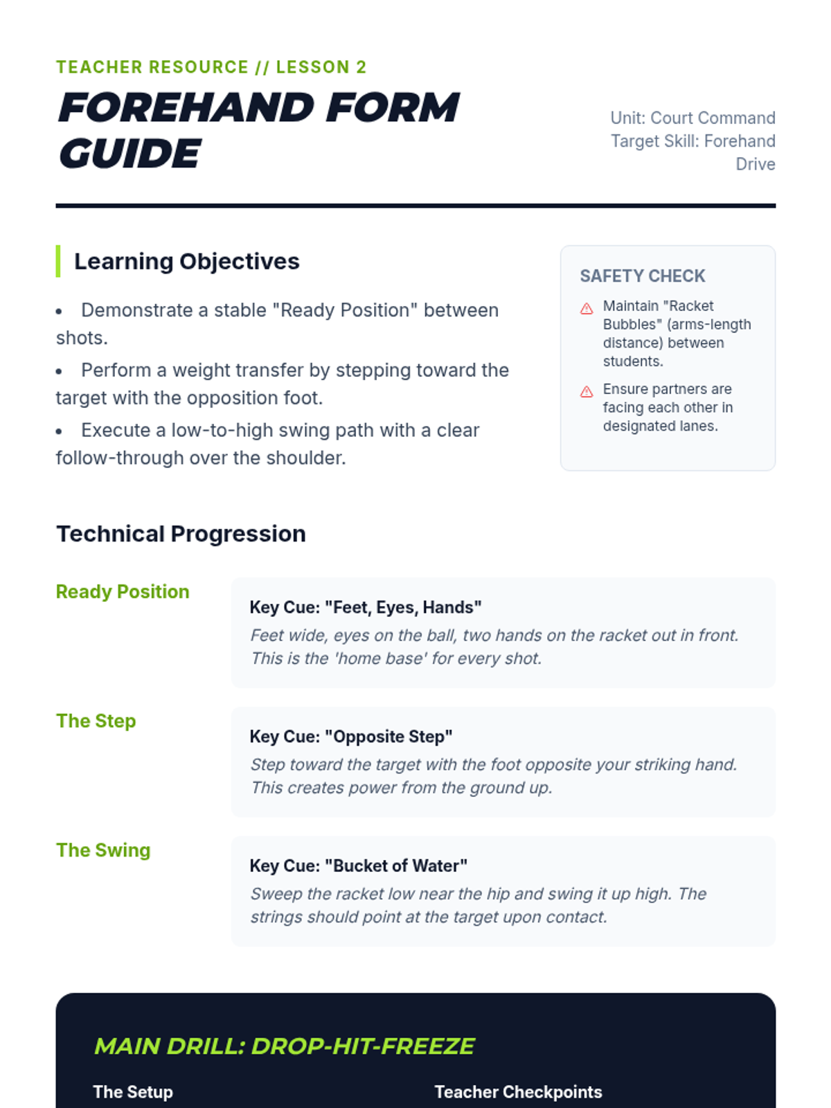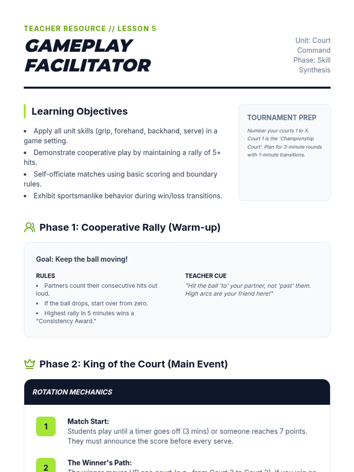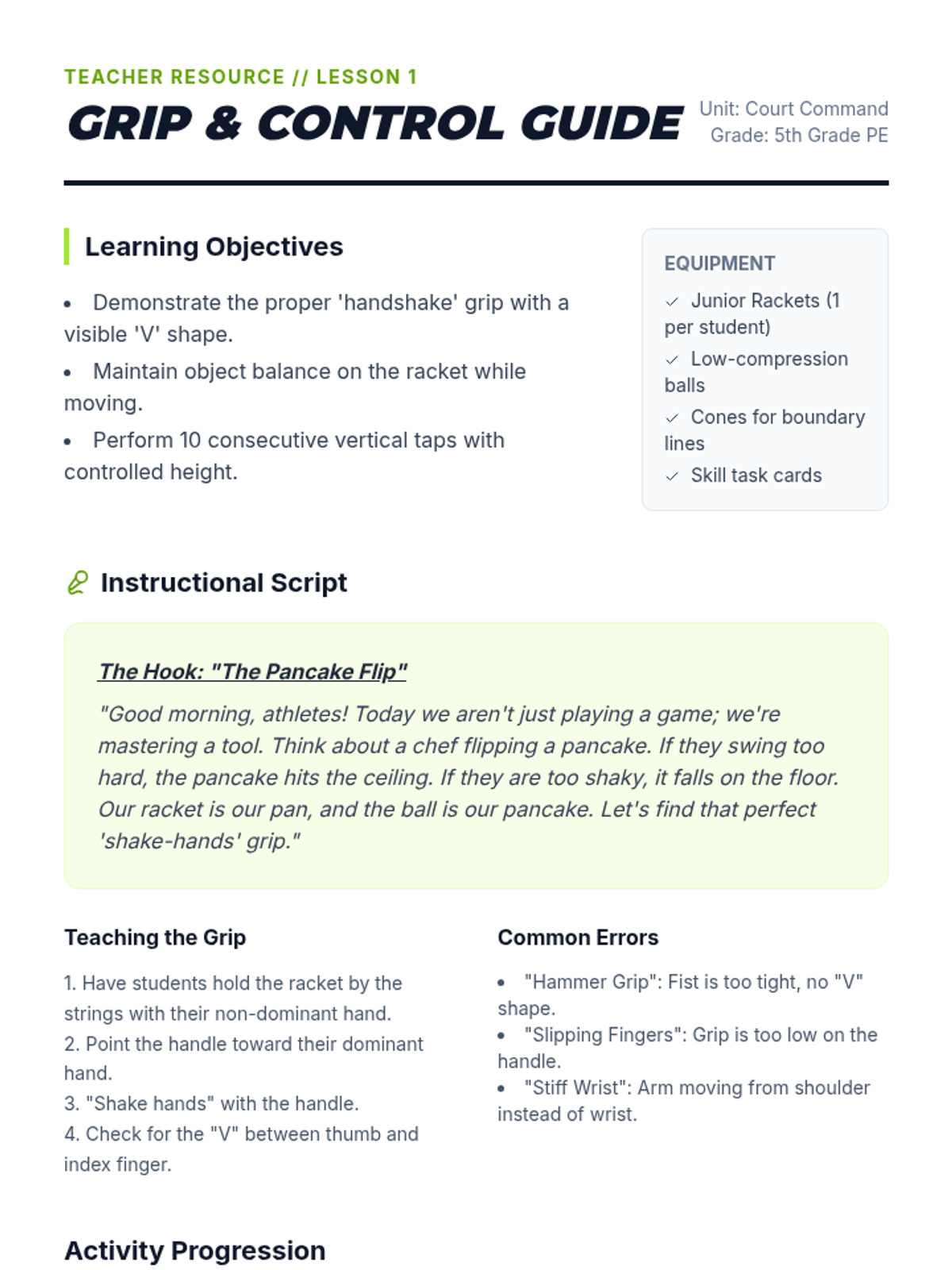 A 5th-grade physical education unit focused on the fundamental mechanics of racket sports, including grip, forehand, backhand, serving, and basic gameplay tactics. Students progress from individual object control to cooperative rallying and competitive modified games.