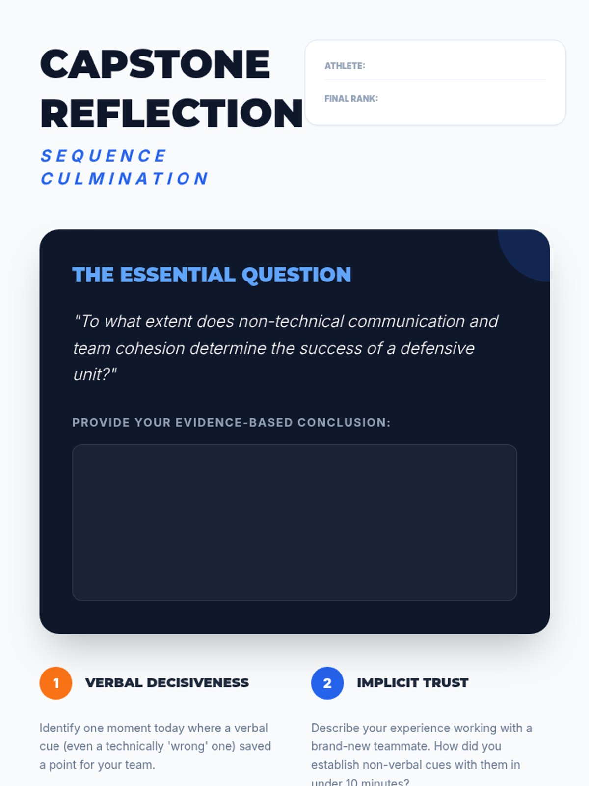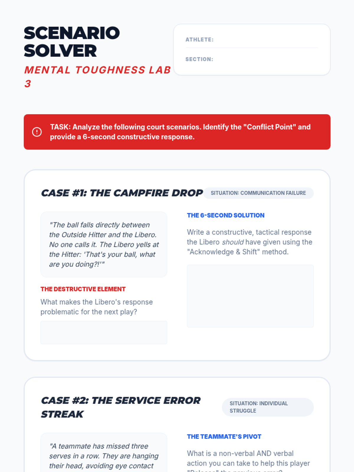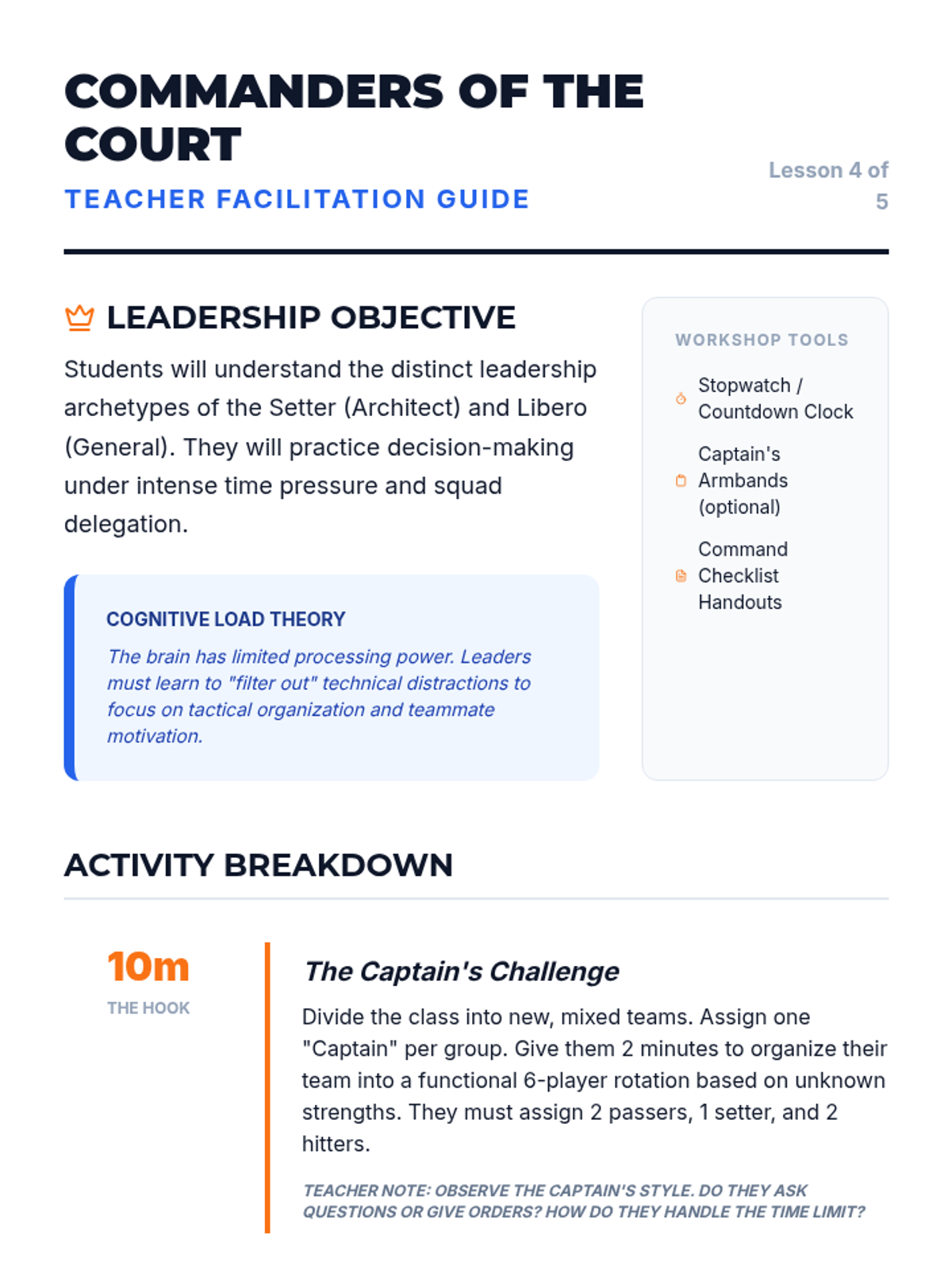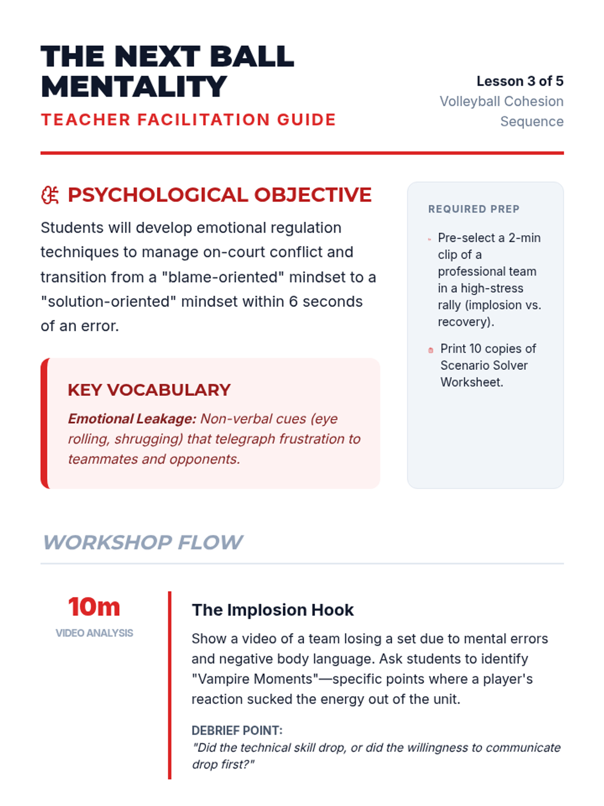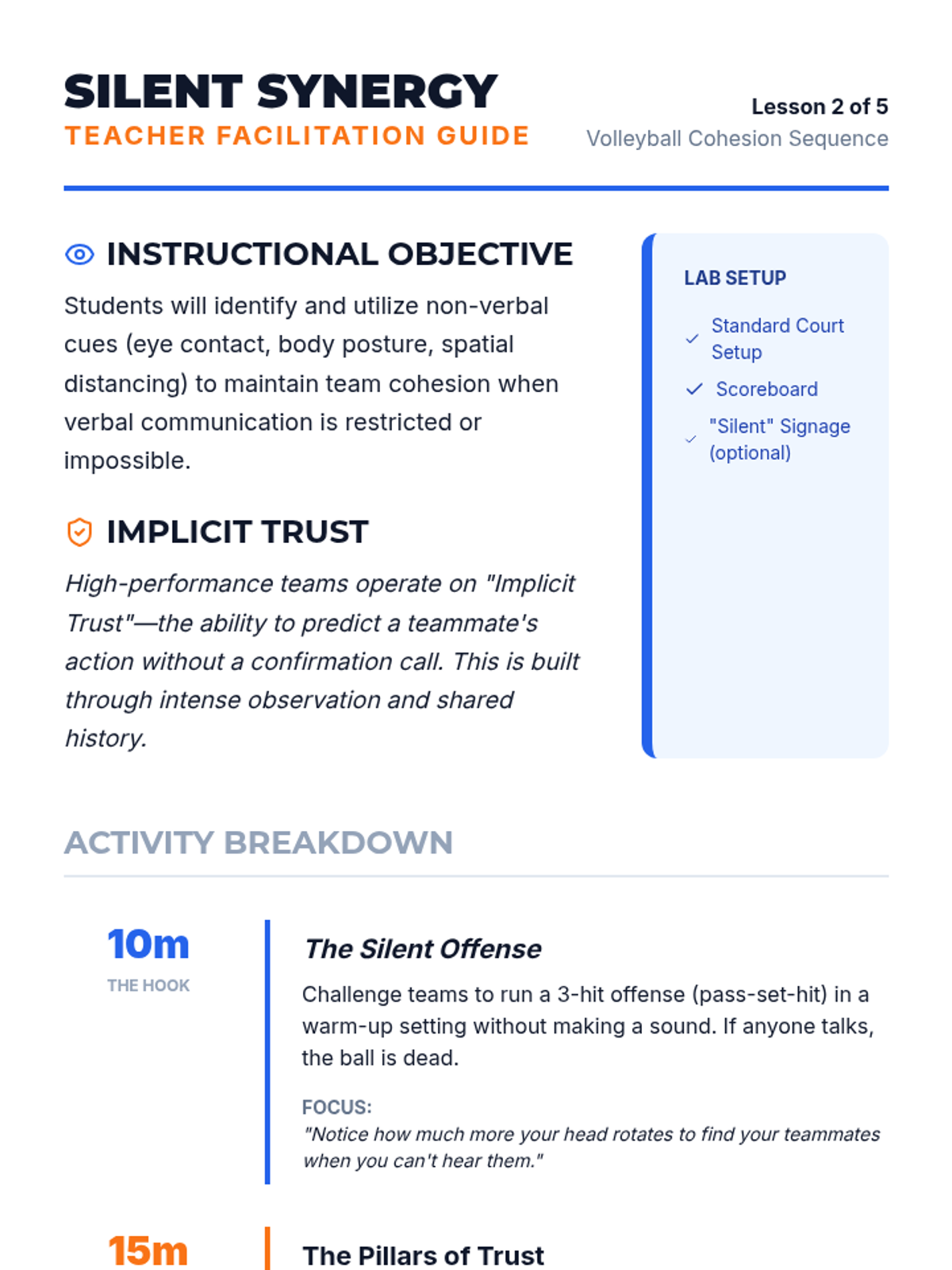 This sequence for undergraduate students focuses on the interpersonal and psychological dimensions of volleyball, emphasizing verbal and non-verbal communication, leadership, and conflict resolution to build cohesive, high-performing defensive units.