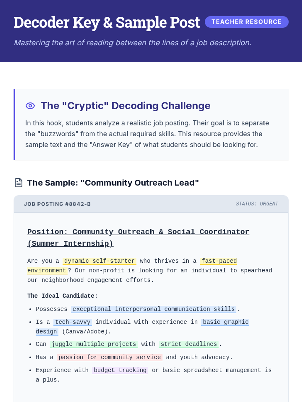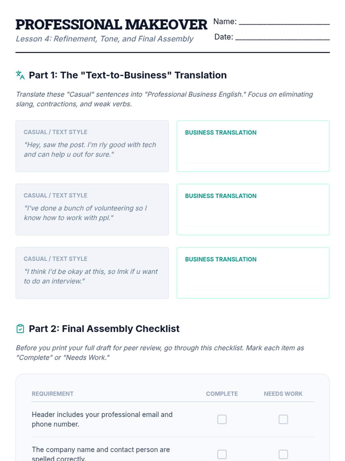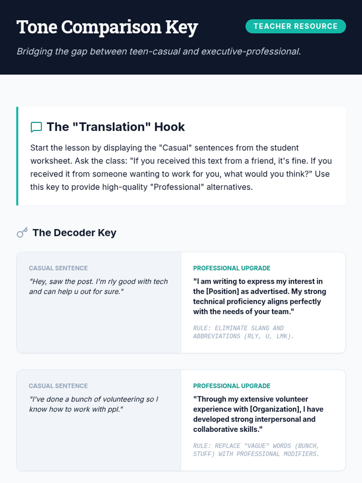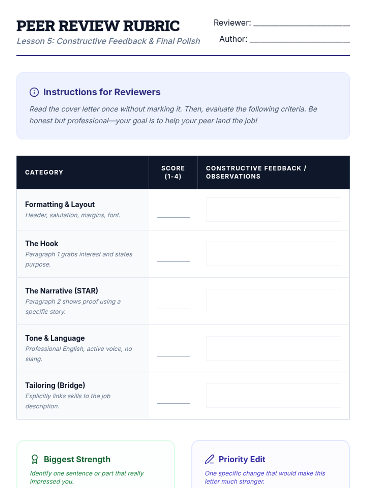 This comprehensive sequence guides 11th-grade students through the strategic process of writing effective, professional cover letters. Students transition from analyzing document anatomy and decoding job descriptions to drafting persuasive narratives and refining professional tone, culminating in a polished, peer-reviewed document.