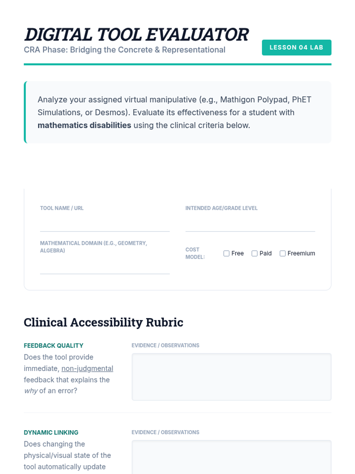 This advanced graduate sequence focuses on the design and implementation of the Concrete-Representational-Abstract (CRA) framework for learners with mathematics disabilities. Students will move from diagnostic error analysis to the creation of comprehensive, evidence-based intervention plans.