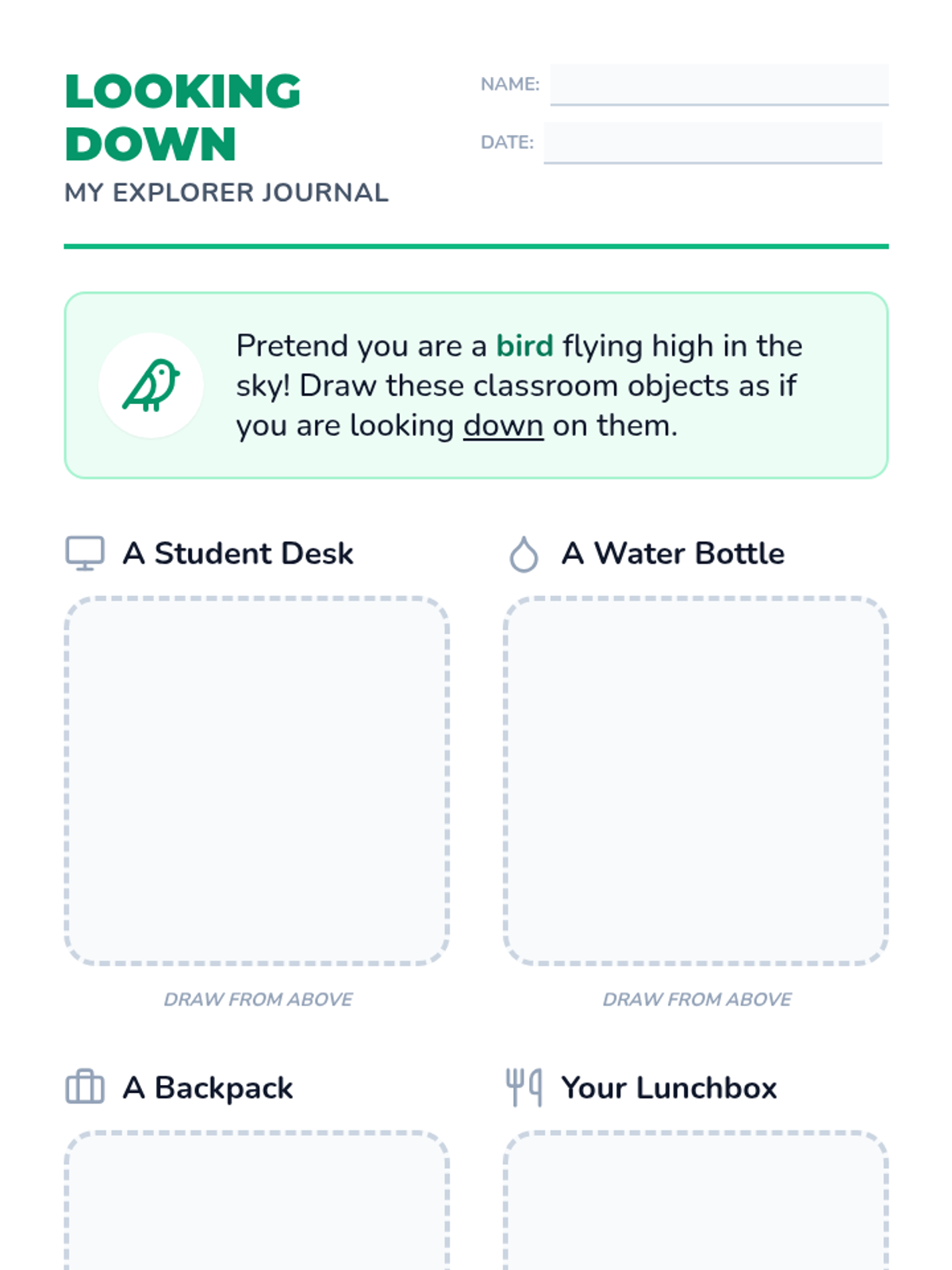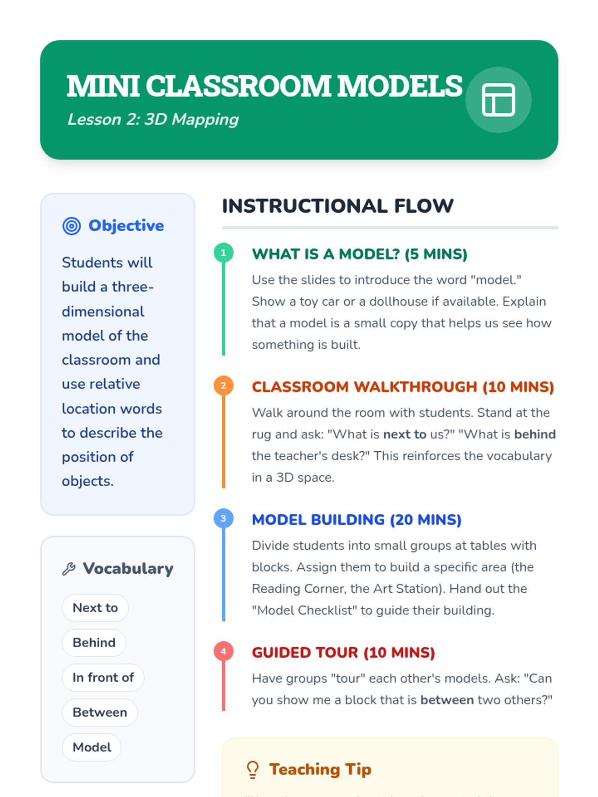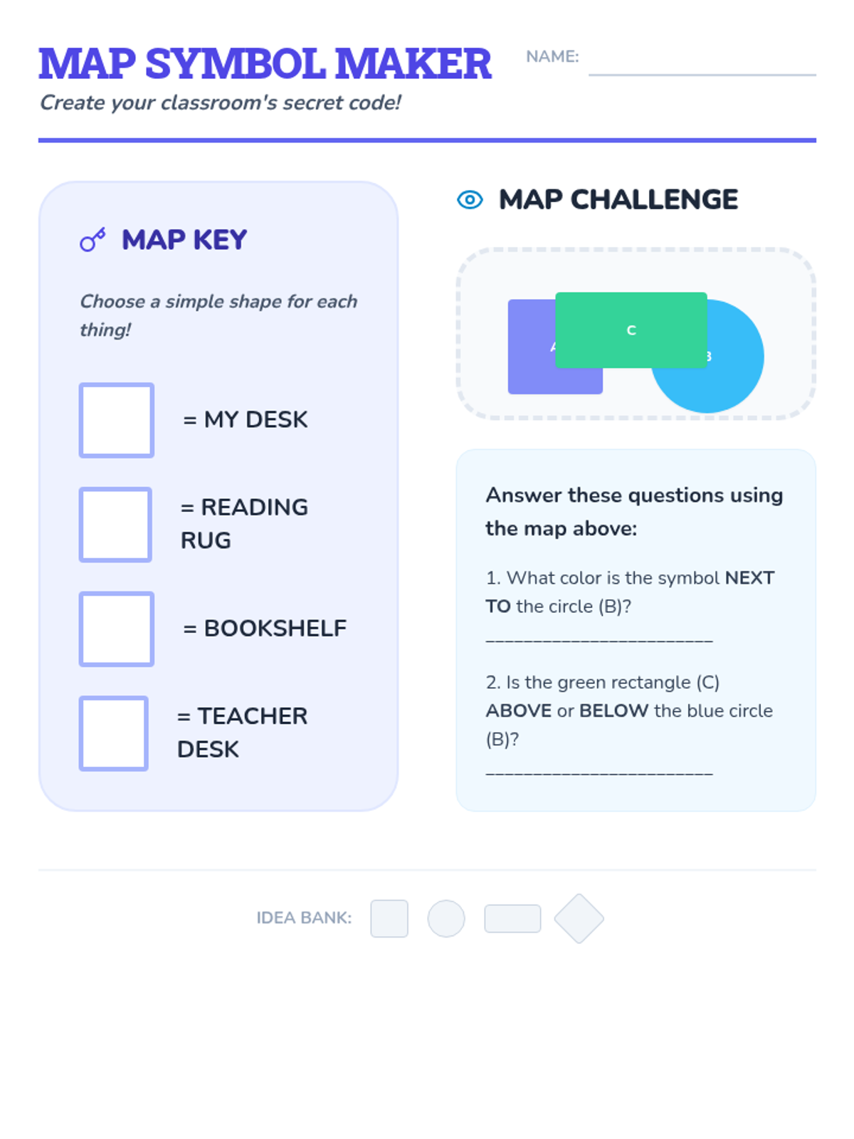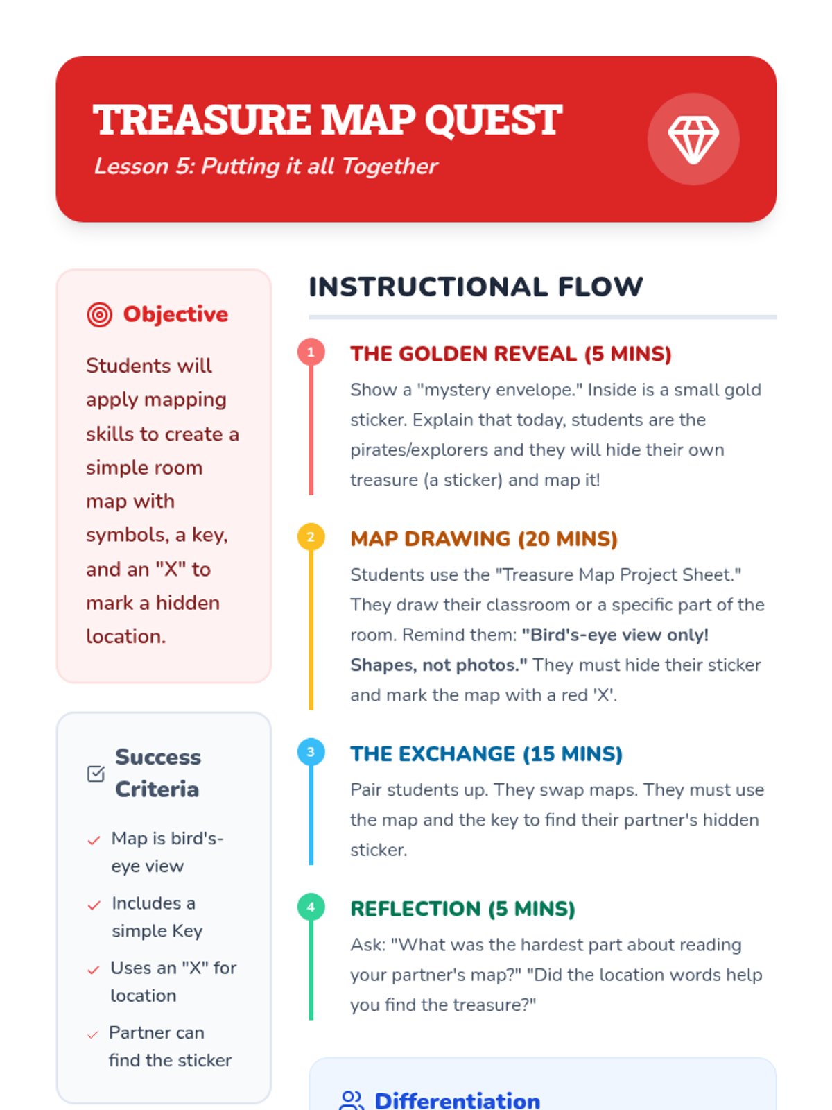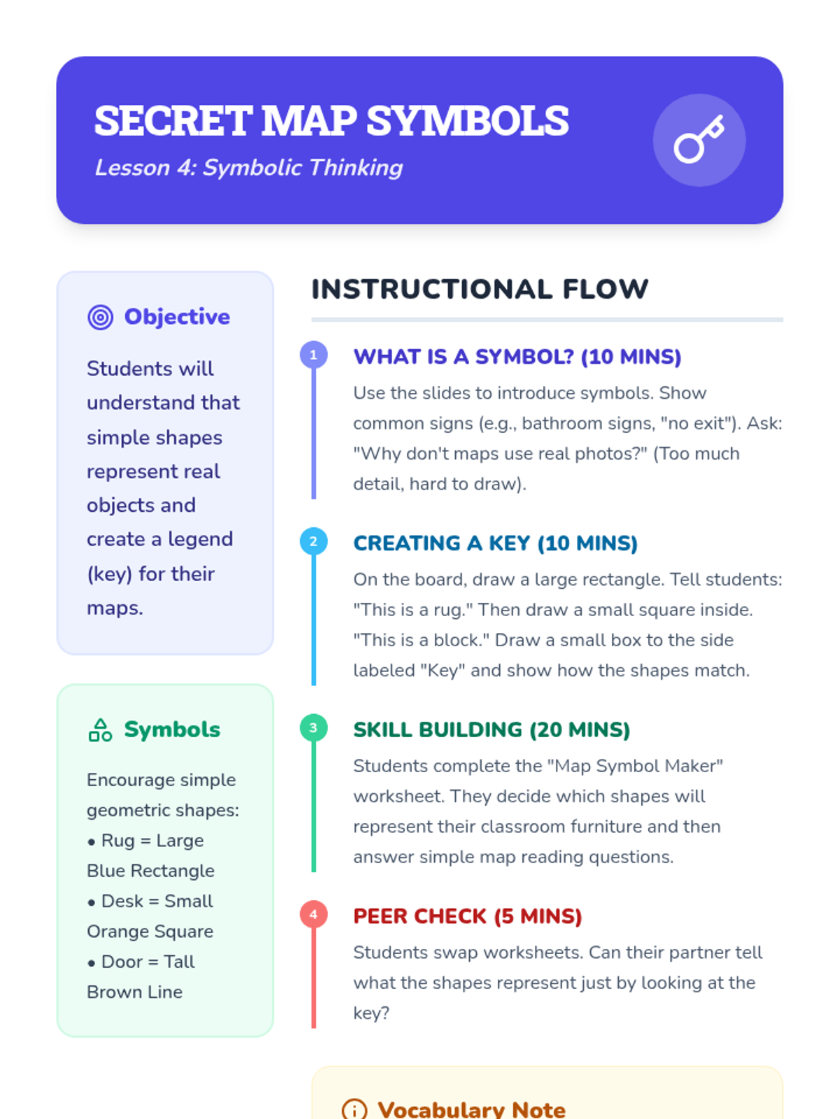 This sequence introduces Kindergarten students to mapping and relative location. Students explore perspective through bird's-eye views, create 3D models of their environment, transition to 2D representations, and learn to use symbols and keys to communicate spatial information, culminating in a treasure map project.