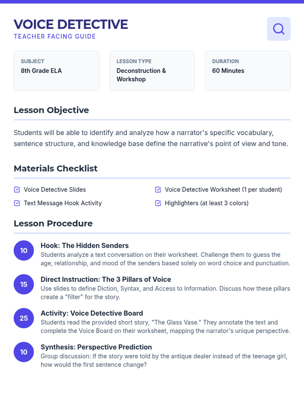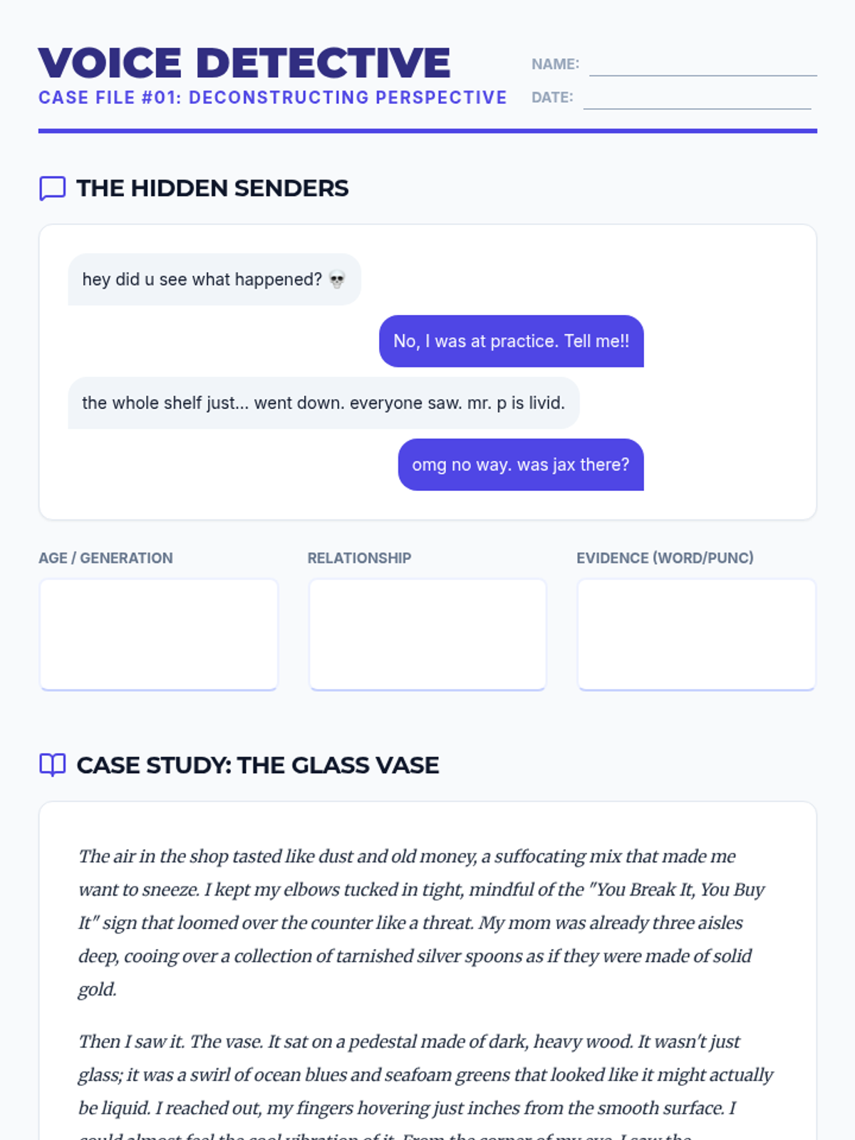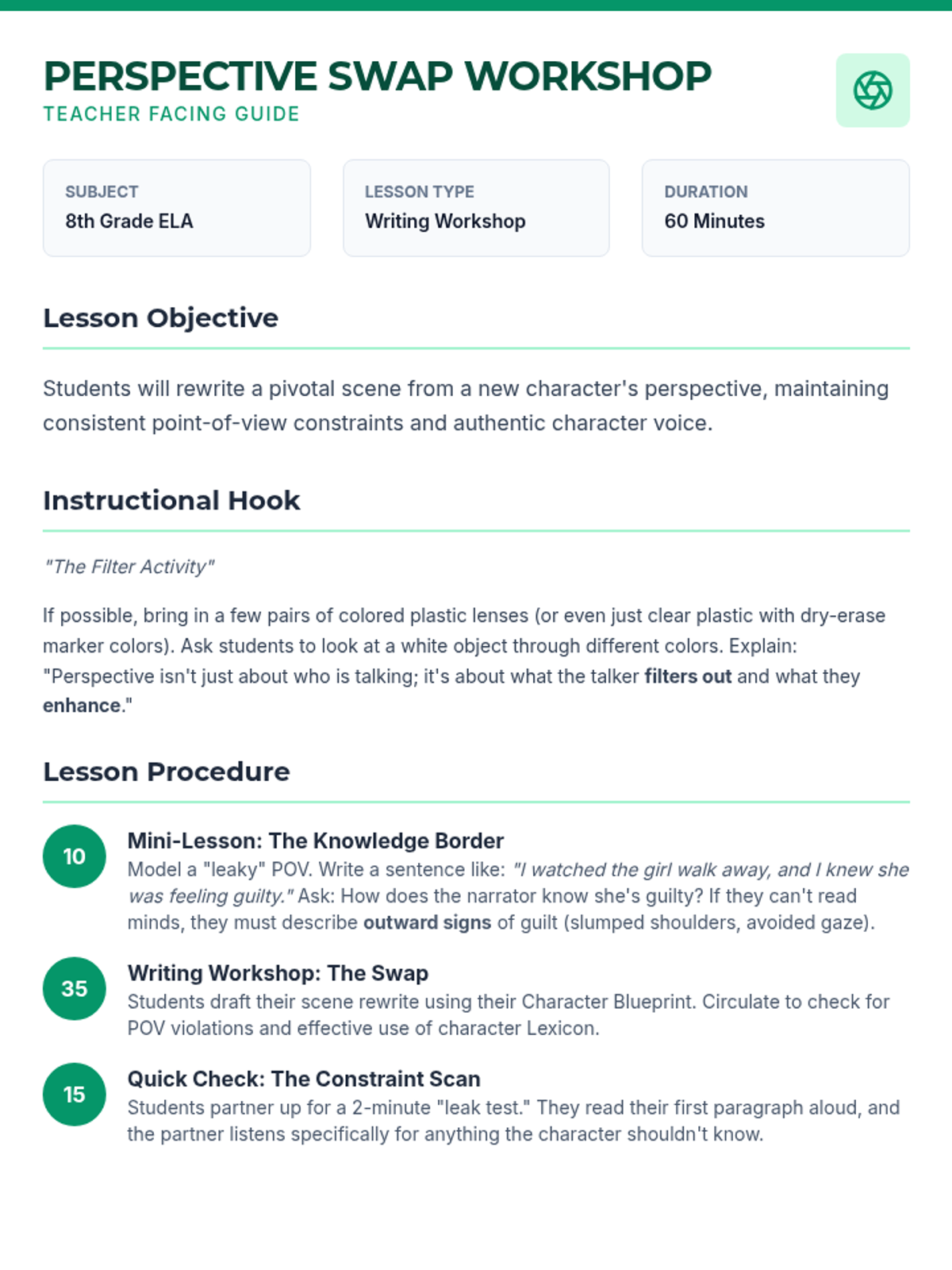 Students explore how shifting a narrative's point of view transforms its meaning, tone, and character dynamics. Through analysis and creative rewriting, they master the mechanics of different narrative perspectives.