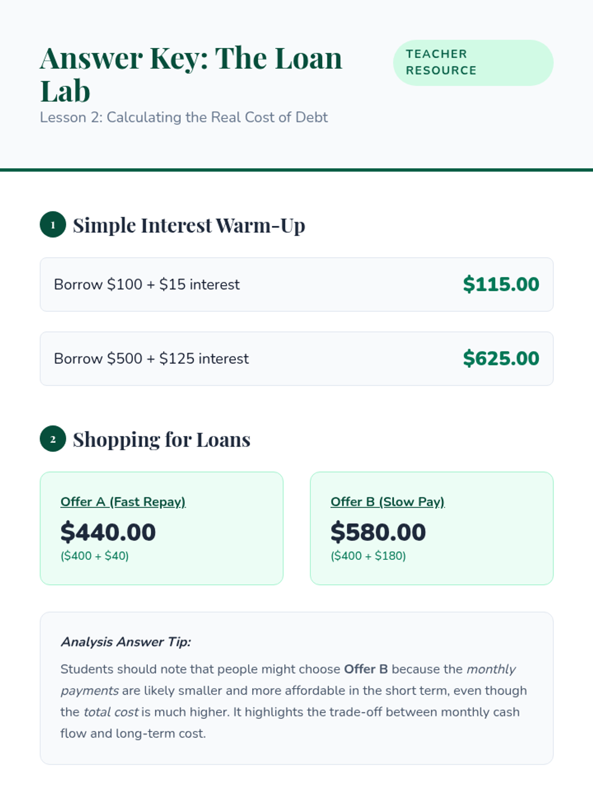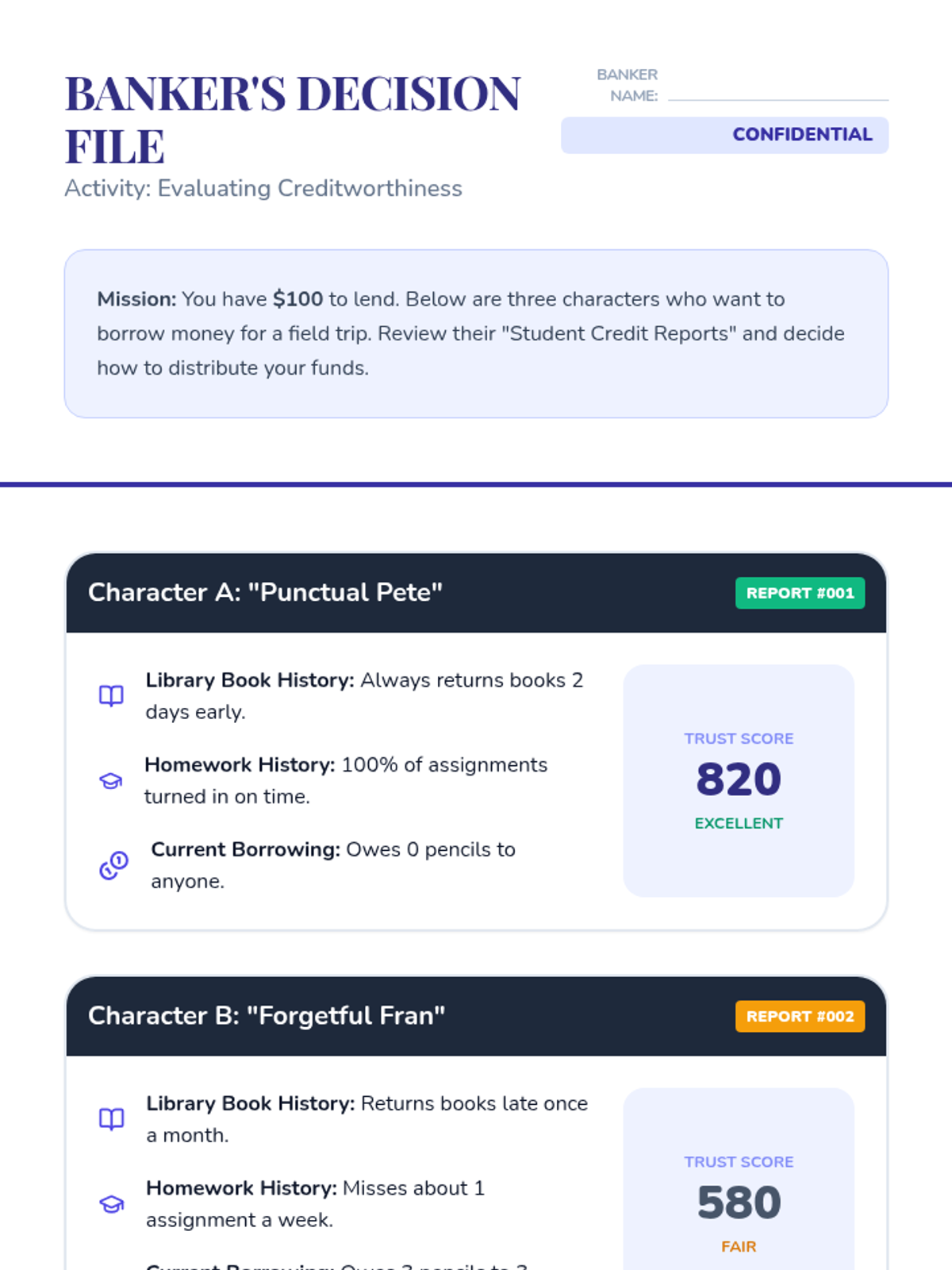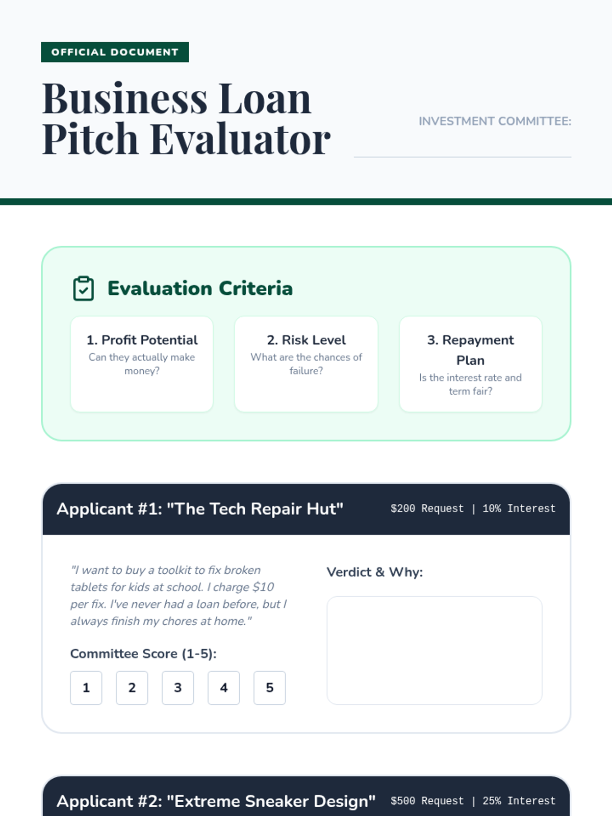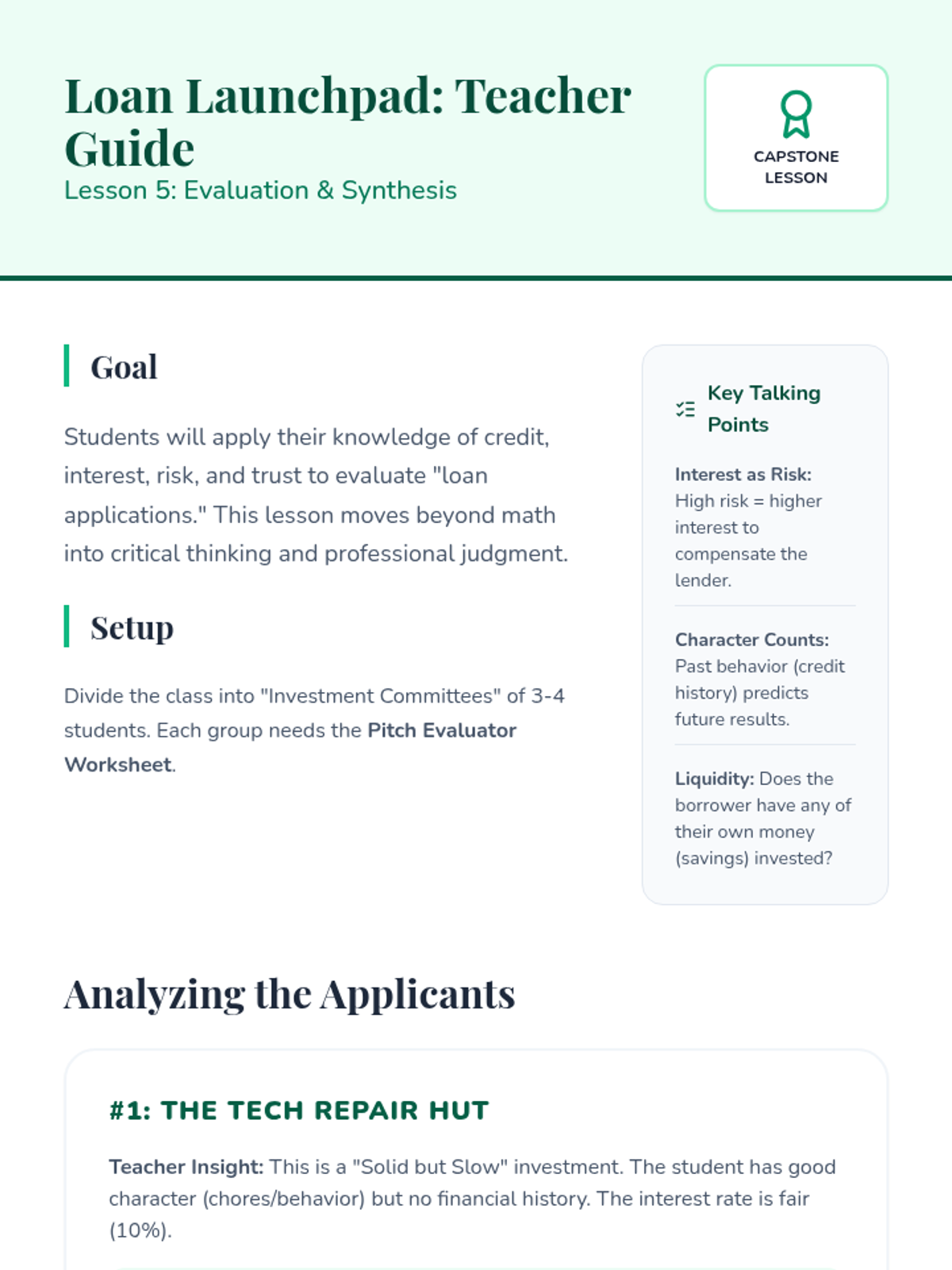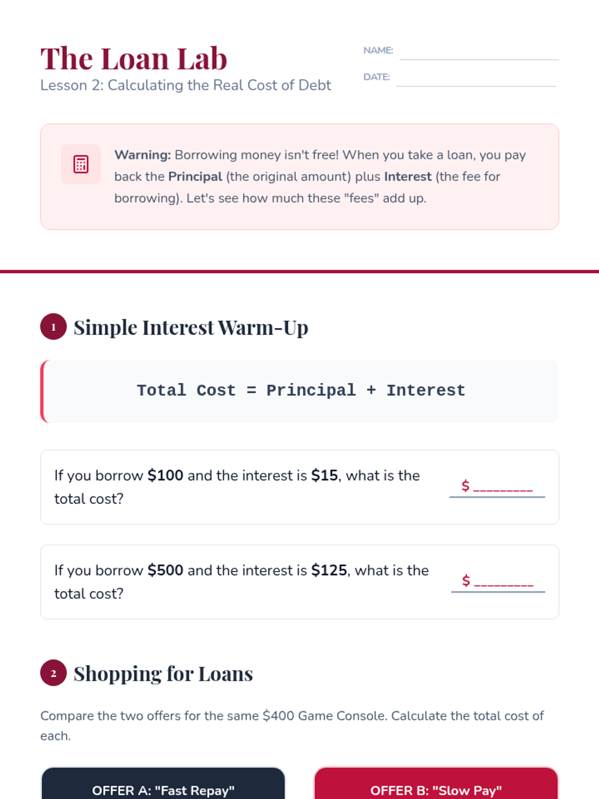This sequence explores the mechanics of credit, the actual cost of debt through interest, the importance of creditworthiness, and the basics of investment risk. Students culminate their learning by evaluating business loan proposals in a 'Shark Tank' style simulation.