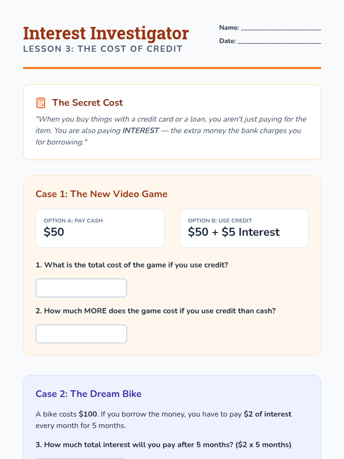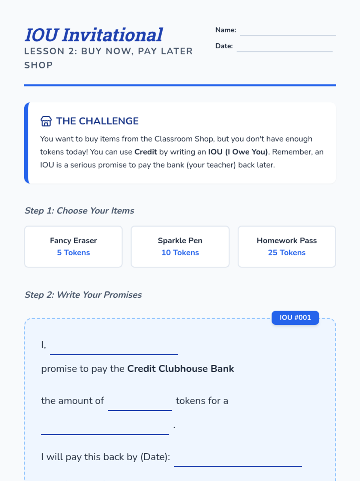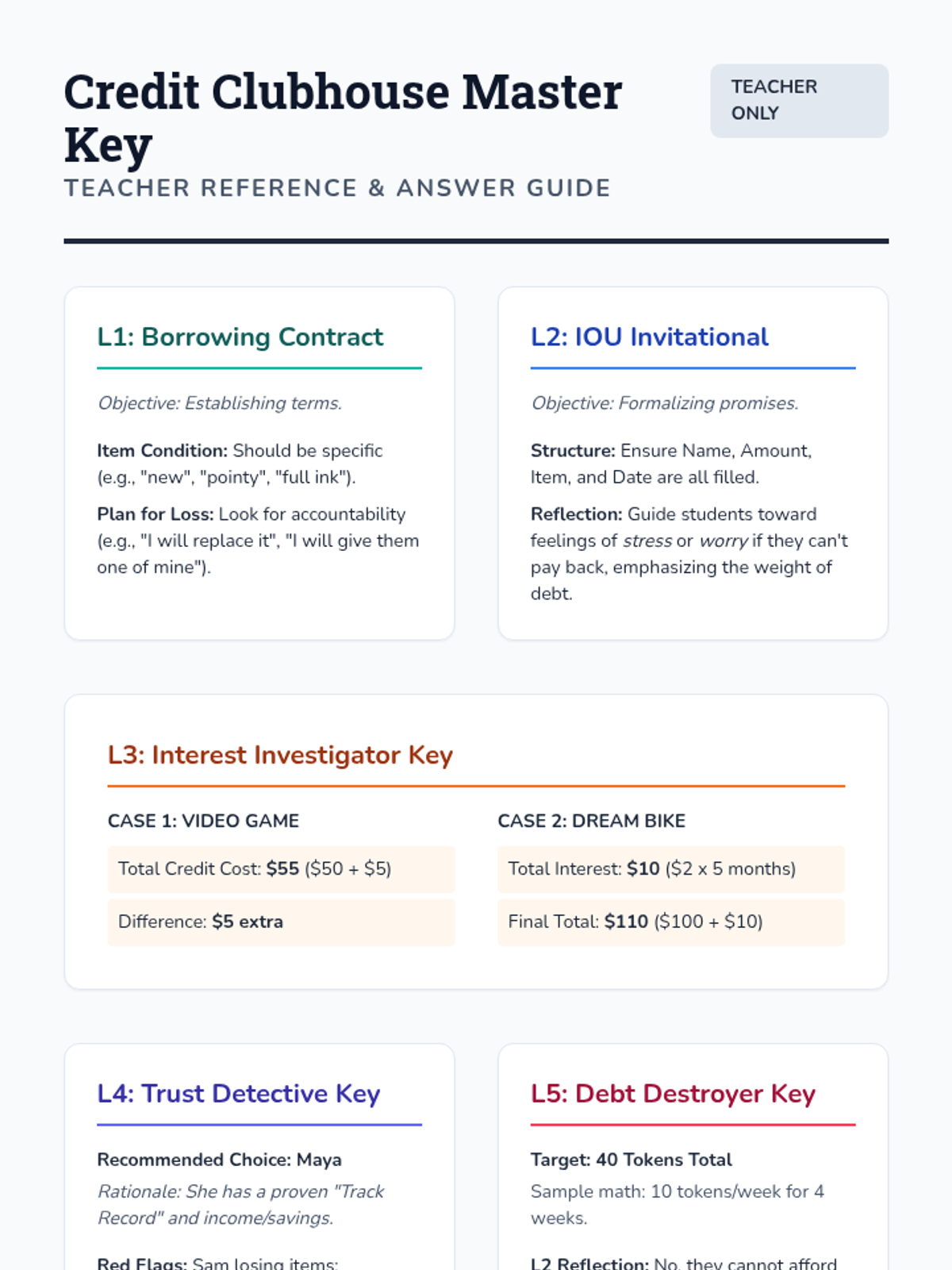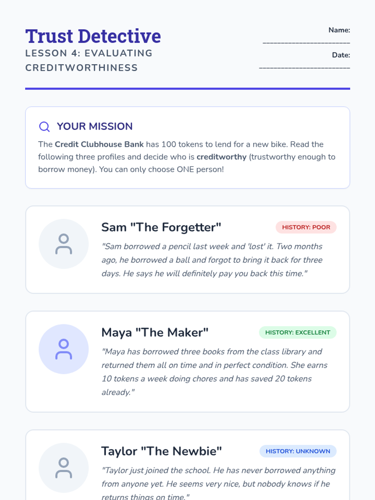 This sequence introduces 3rd-grade students to the concepts of credit, borrowing, and debt. Students move from basic borrowing of items to understanding financial credit, interest, and creditworthiness through engaging activities and case studies.