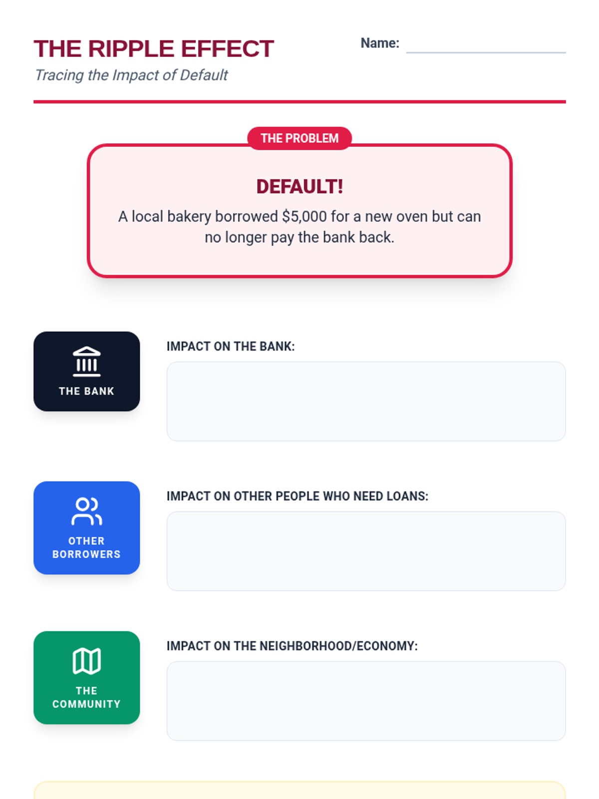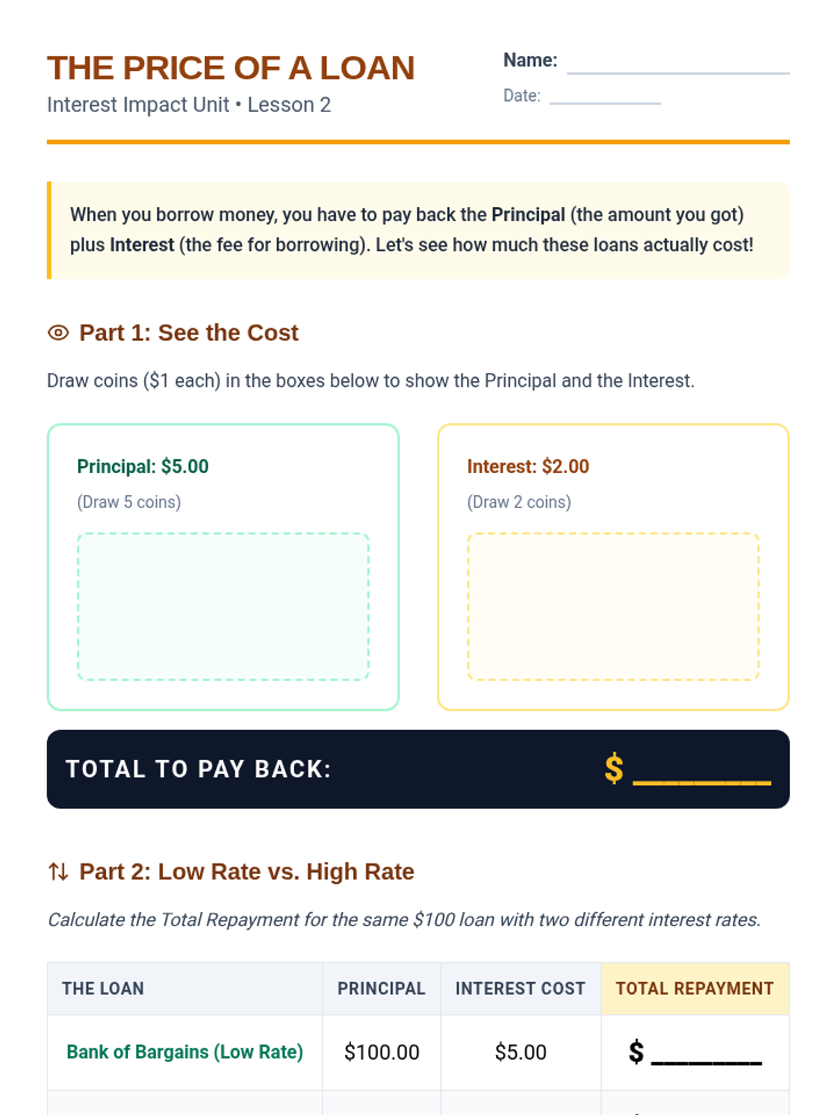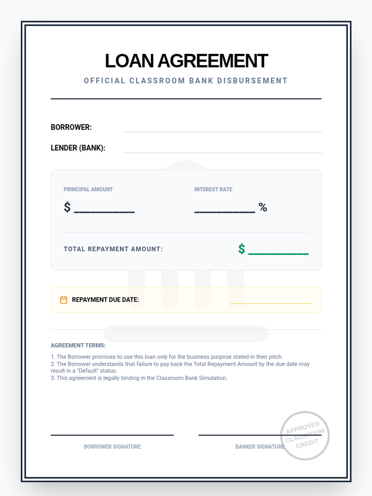 A 4th-grade economics simulation exploring the mechanics of borrowing, lending, and credit. Students transition from savers to lenders and borrowers, learning about interest rates, creditworthiness, and the responsibilities of financial agreements.