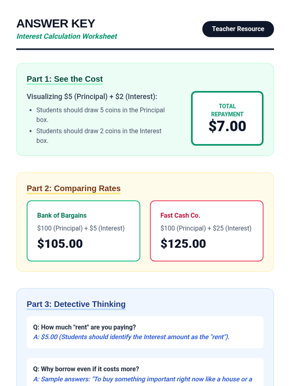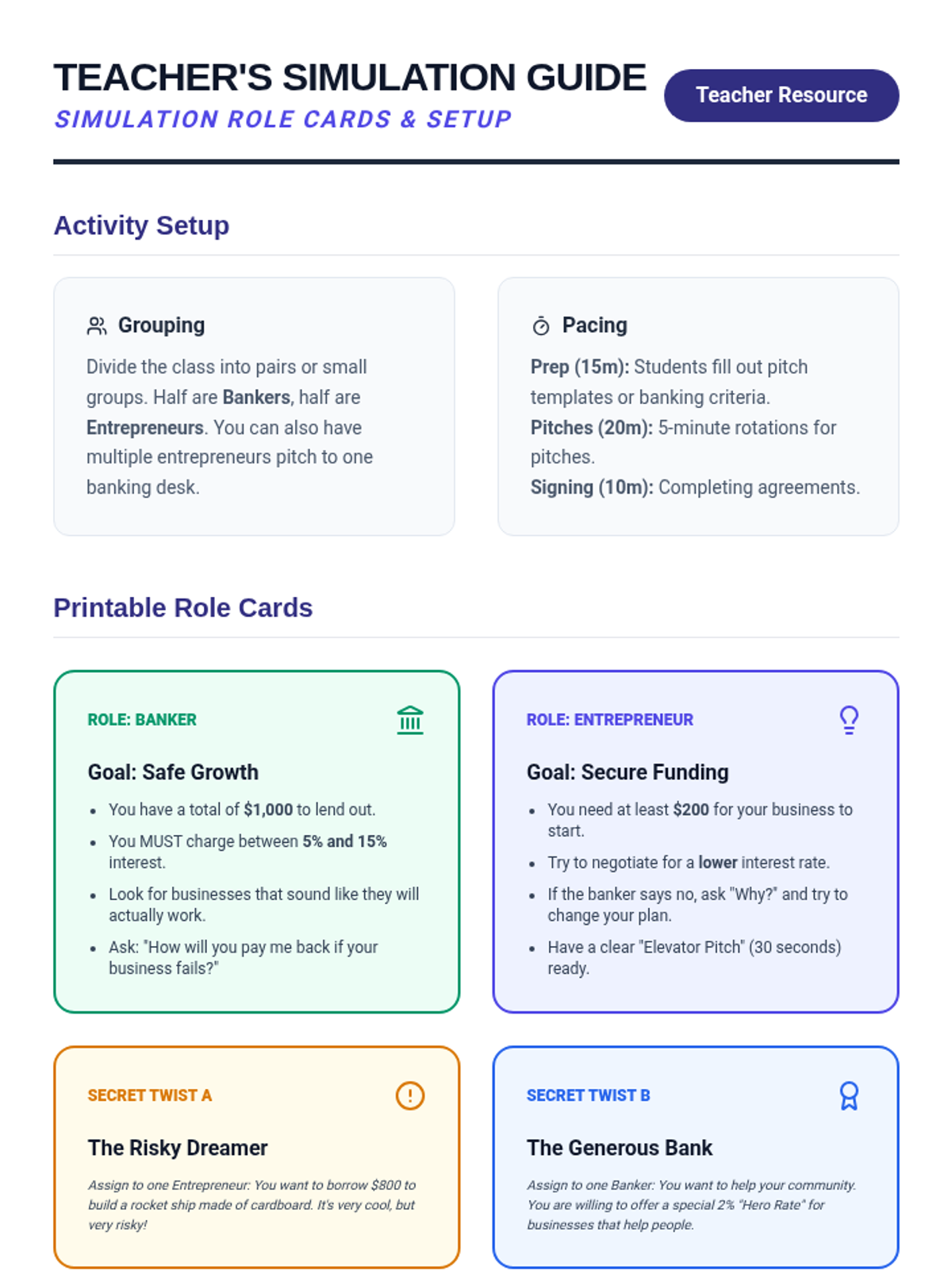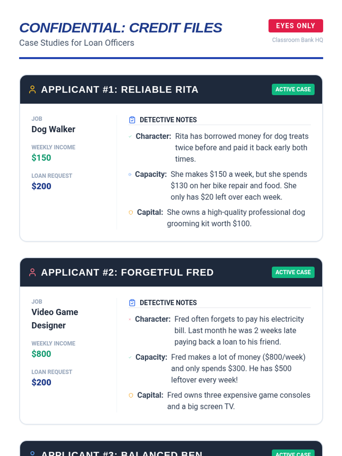 A 4th-grade economics simulation exploring the mechanics of borrowing, lending, and credit. Students transition from savers to lenders and borrowers, learning about interest rates, creditworthiness, and the responsibilities of financial agreements.