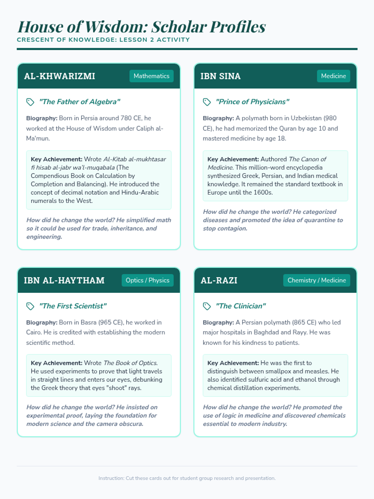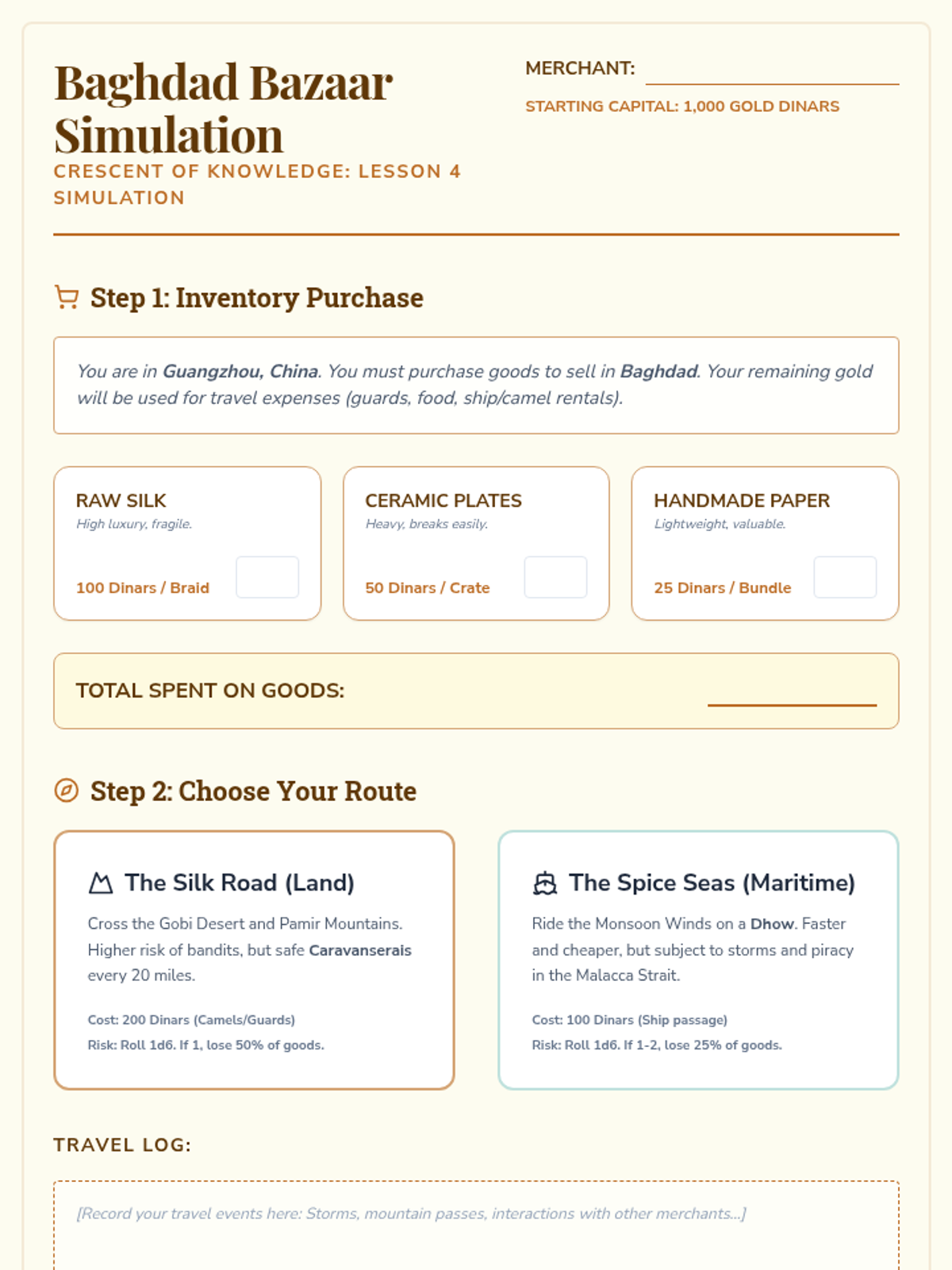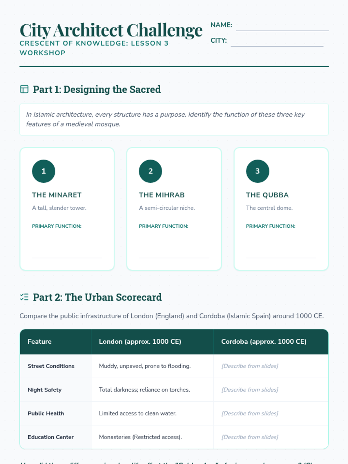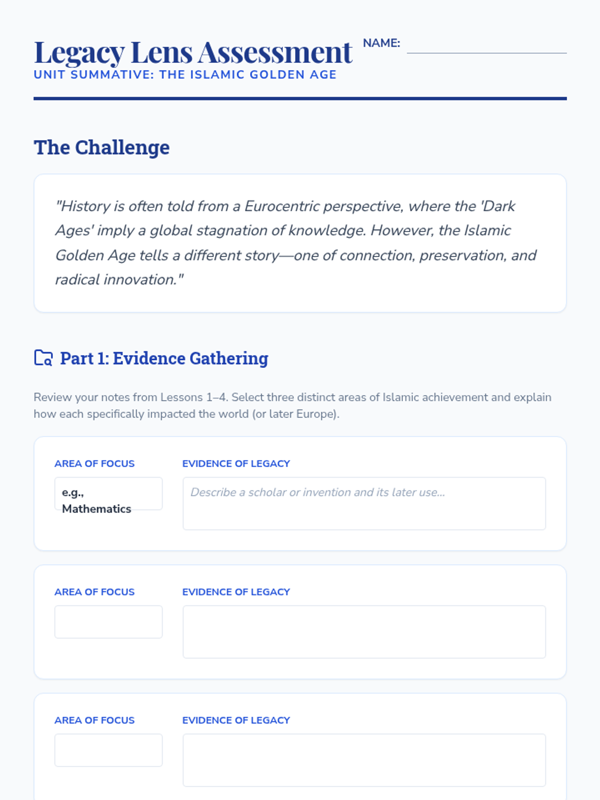 An inquiry-based exploration of the Islamic Golden Age, challenging Eurocentric 'Dark Ages' narratives by investigating advancements in science, trade, and governance across the Umayyad and Abbasid Caliphates. Students analyze how intellectual hubs like Baghdad and Cordoba preserved ancient knowledge and fueled global progress.