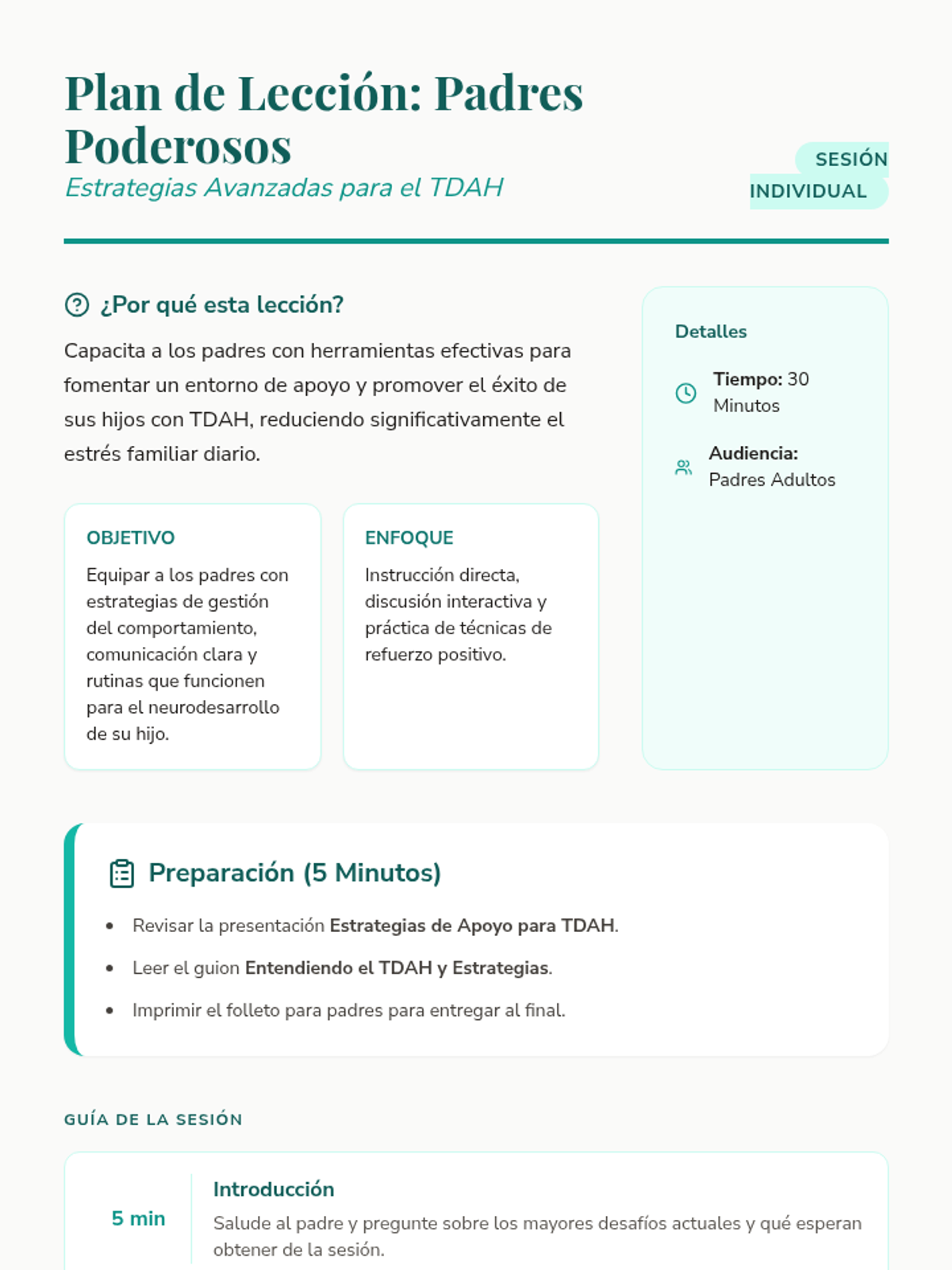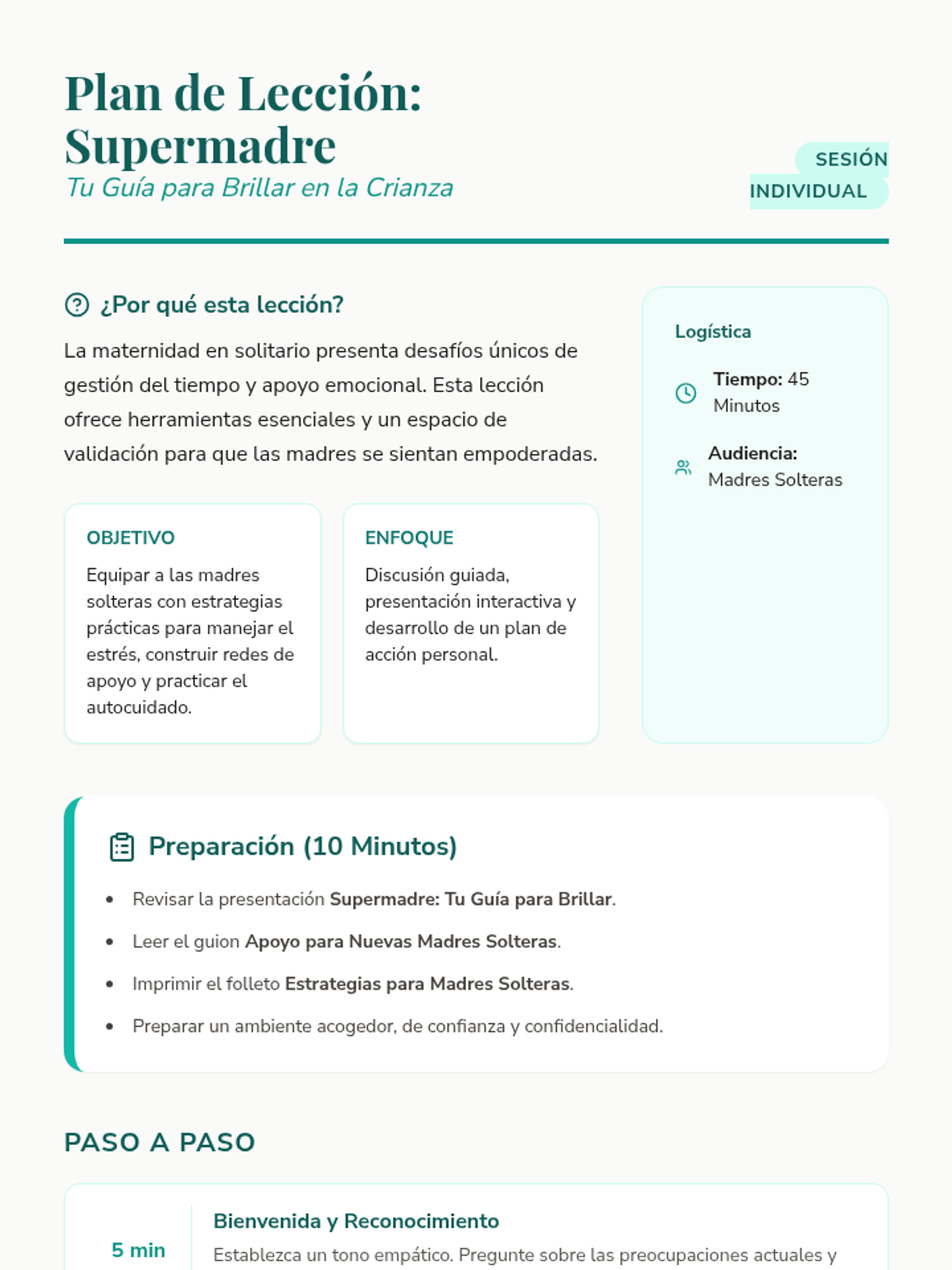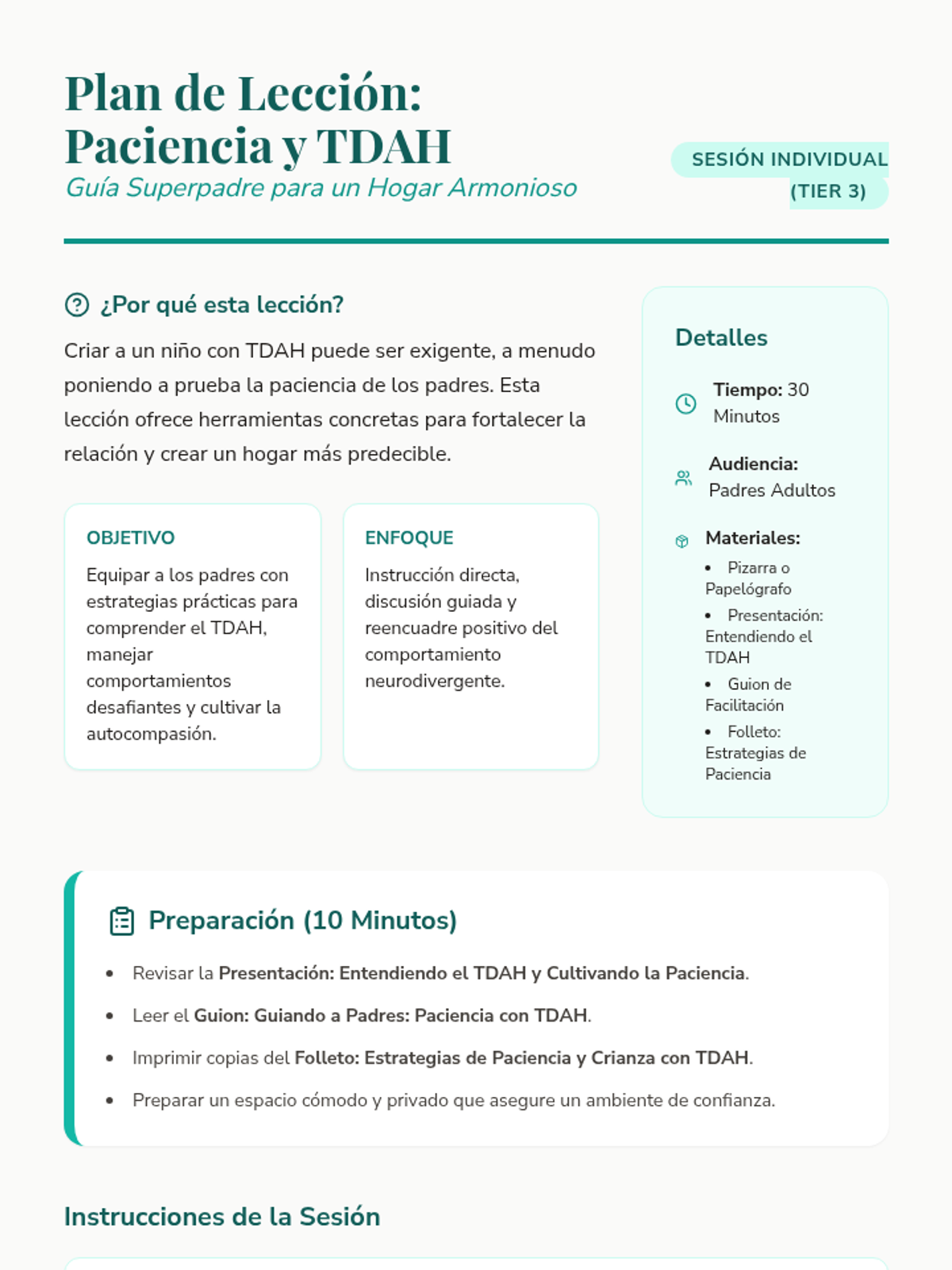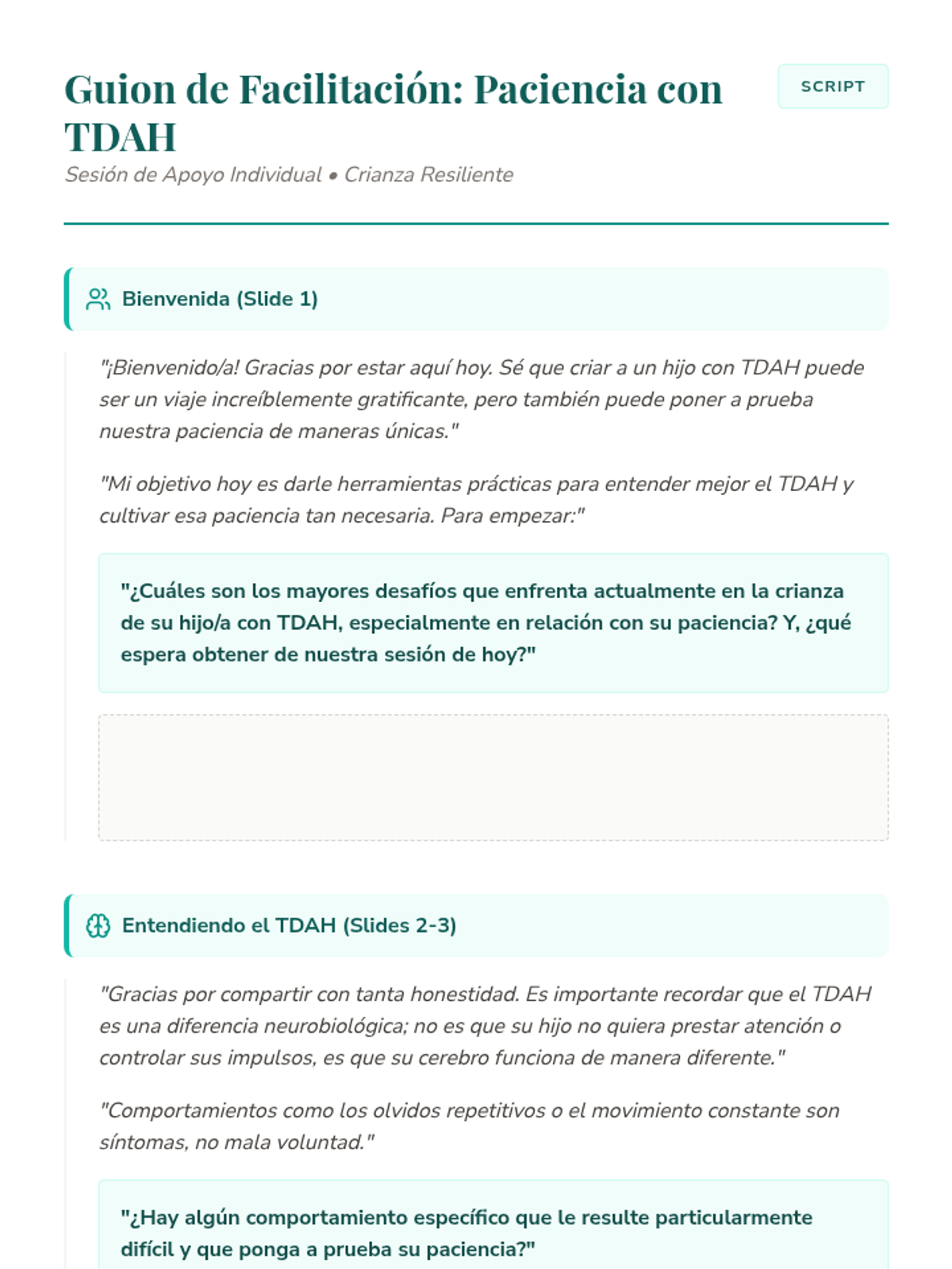 Una serie de sesiones de apoyo individual para padres que enfrentan desafíos específicos en la crianza, desde el perfeccionismo y el TDAH hasta la inmigración y el autocuidado. Cada lección proporciona herramientas prácticas y un espacio de validación emocional.
