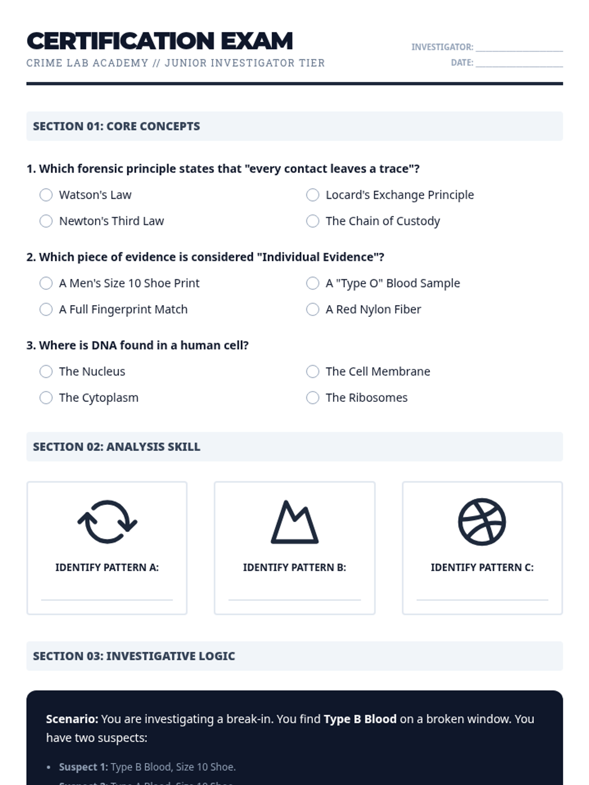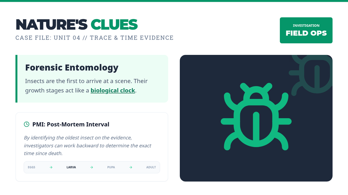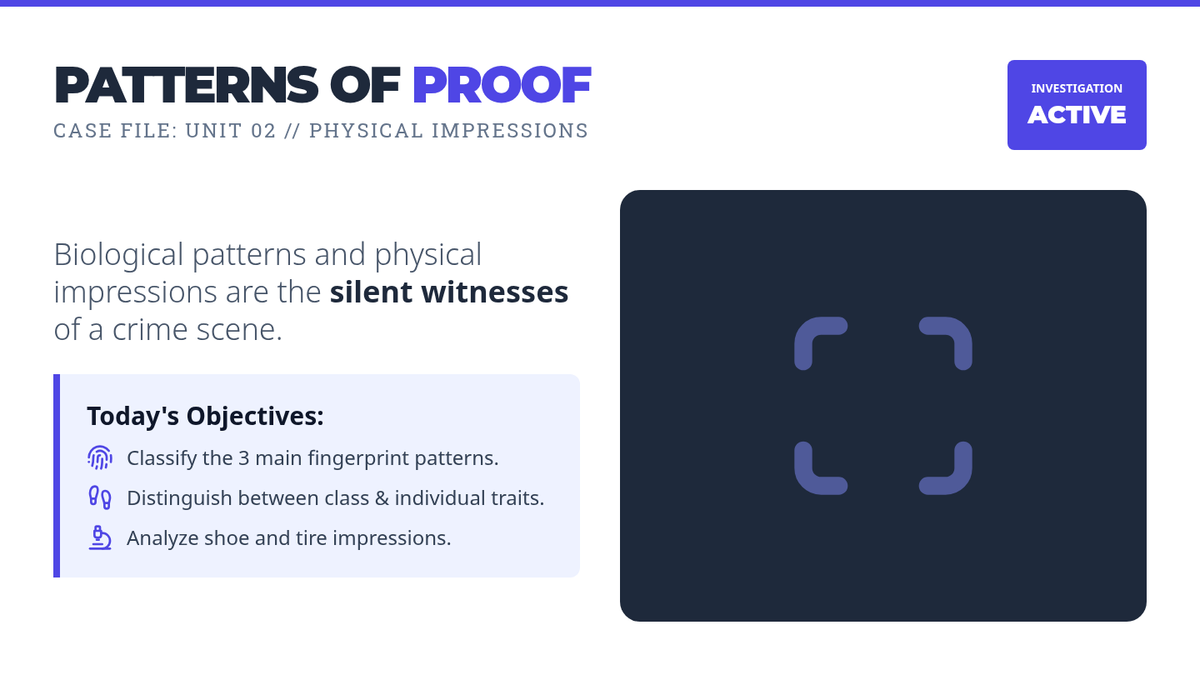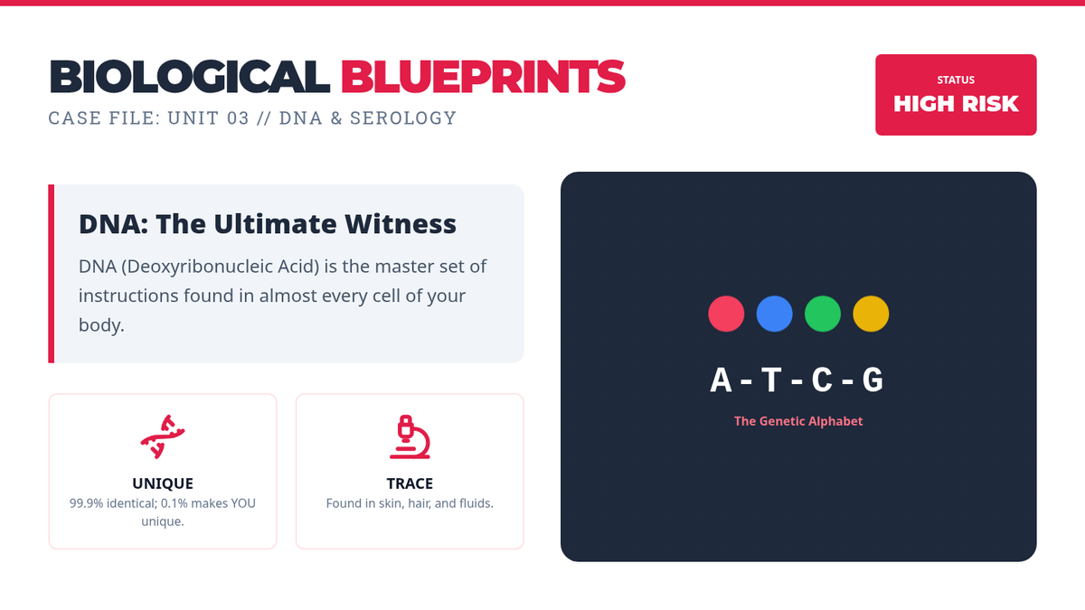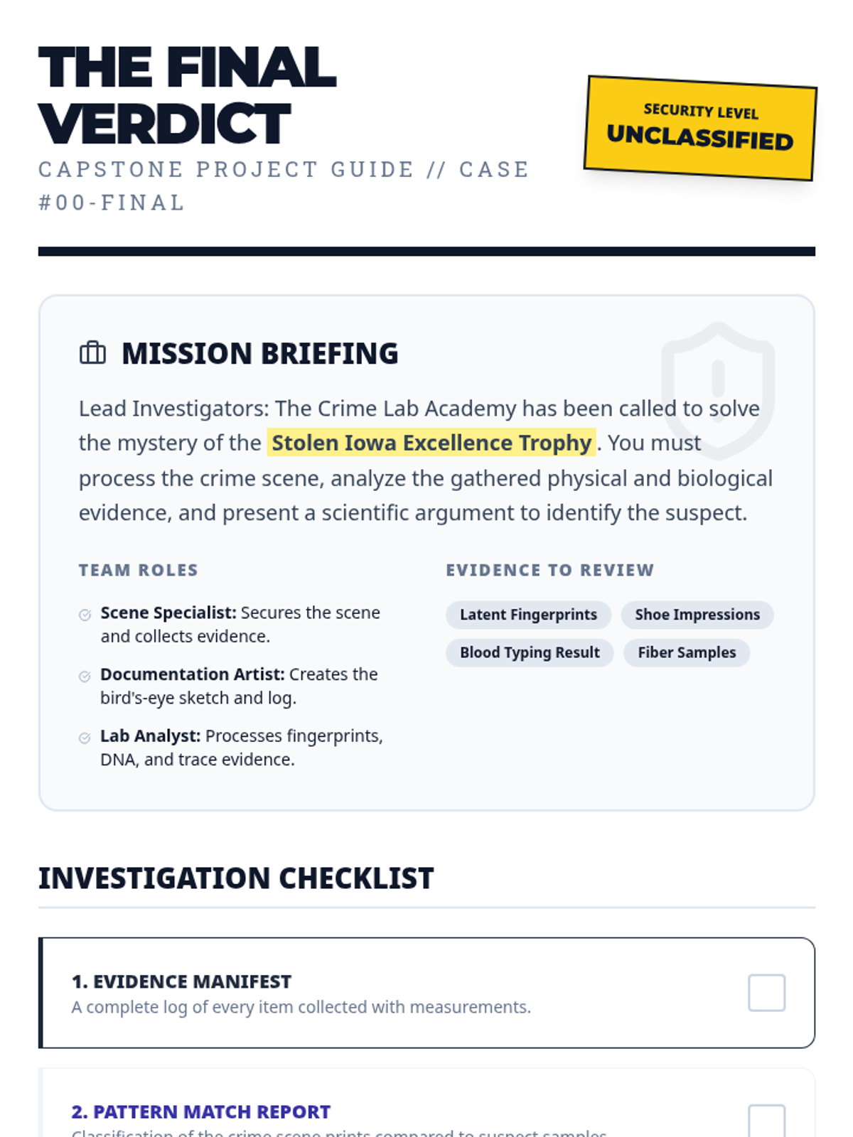 A project-based 6th-grade forensics course where students act as lead investigators to solve a campus mystery using scientific evidence, biology, and engineering principles. The course aligns with Iowa Science Standards covering cell theory, inheritance, and the engineering design process.