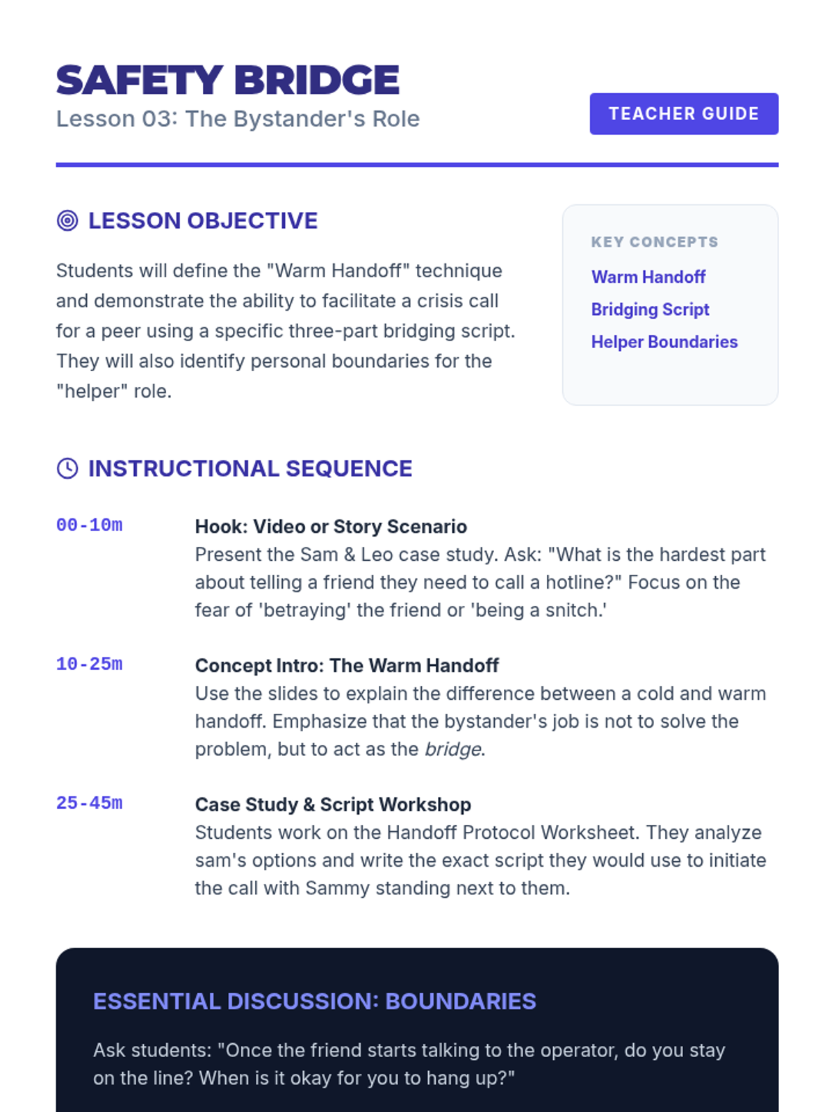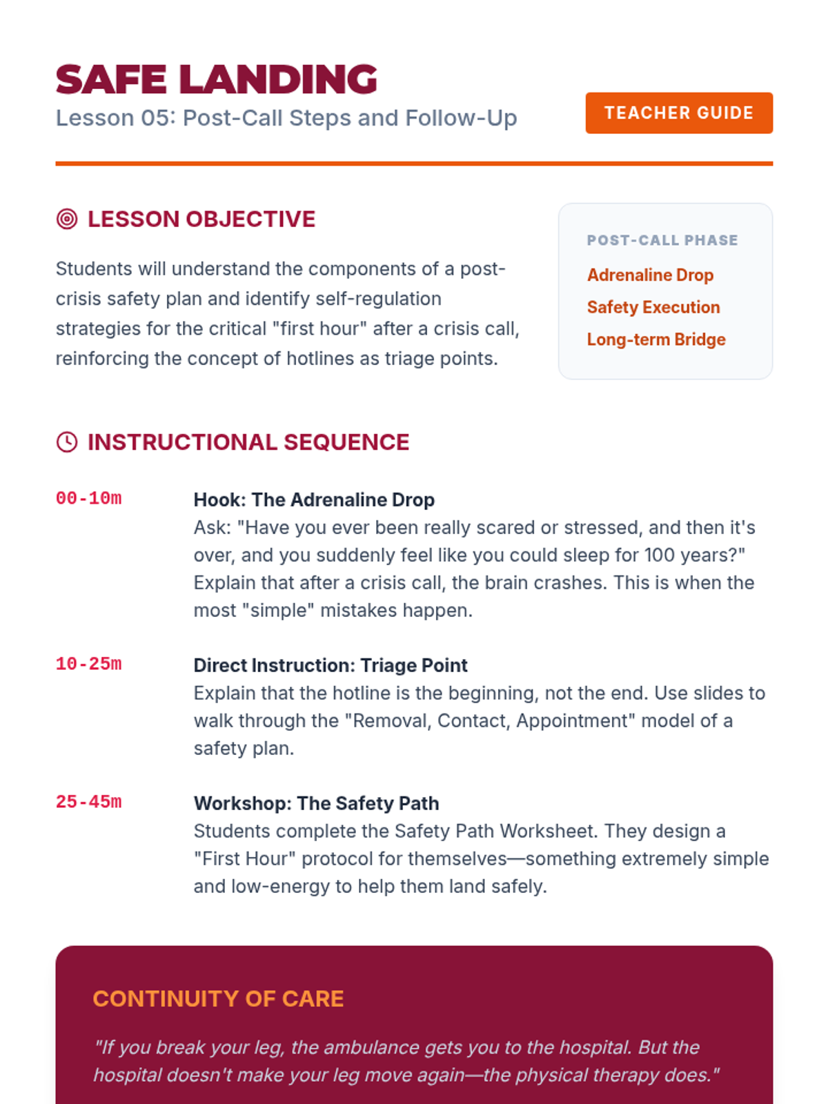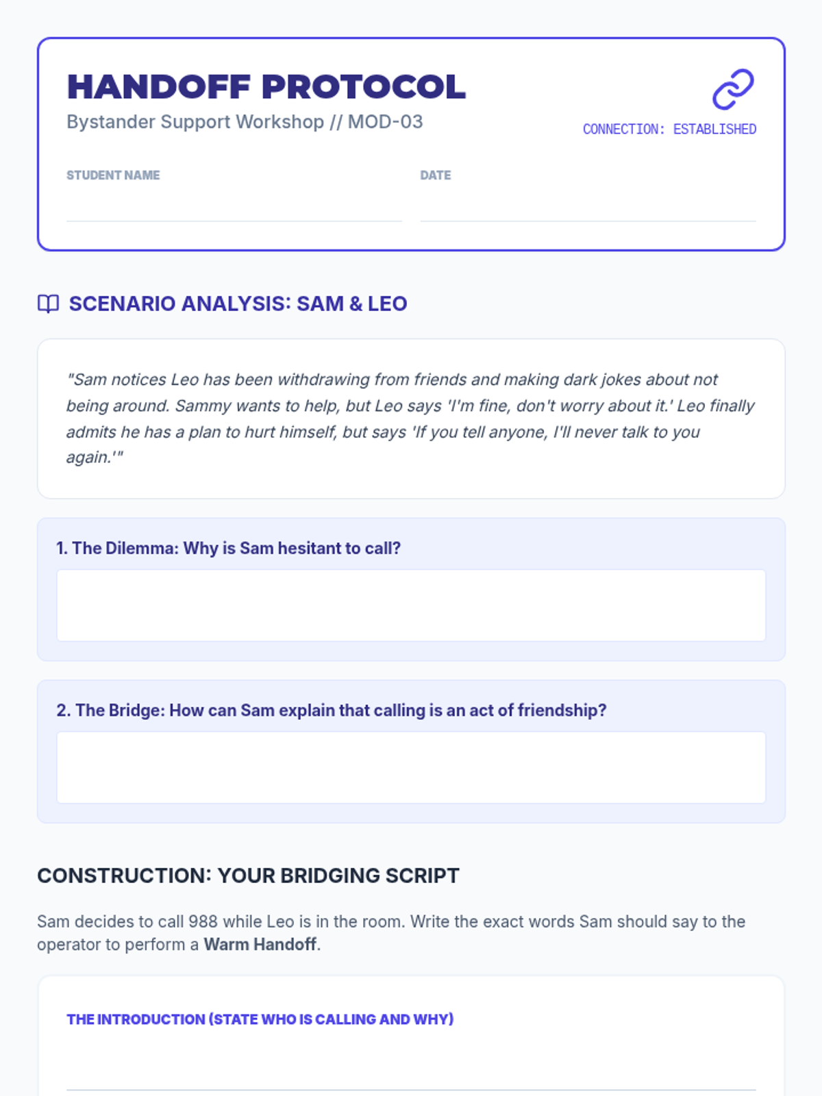 This skill-building sequence focuses on communication strategies for seeking crisis support, moving beyond just knowing phone numbers to practicing the specific scripts and techniques needed to facilitate help for oneself or others. Students learn to articulate urgent needs, overcome physiological stress responses, perform 'warm handoffs' as bystanders, and navigate the follow-up steps after a crisis call.
