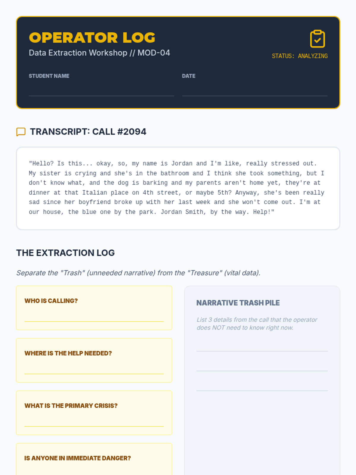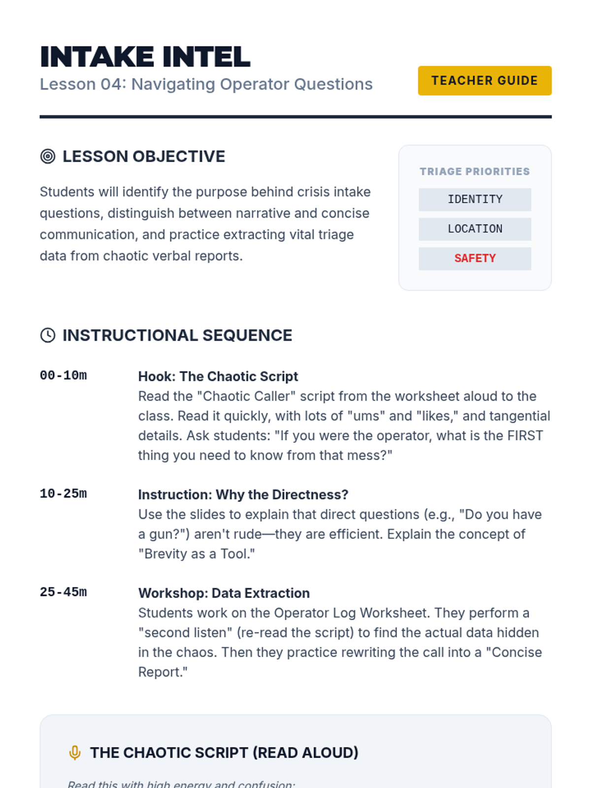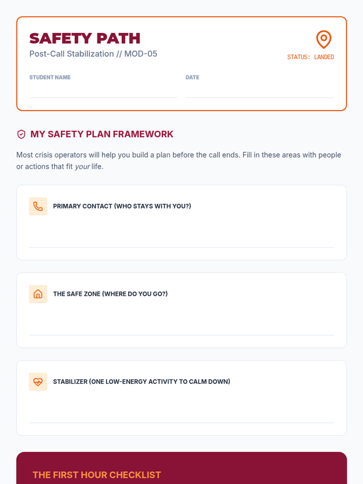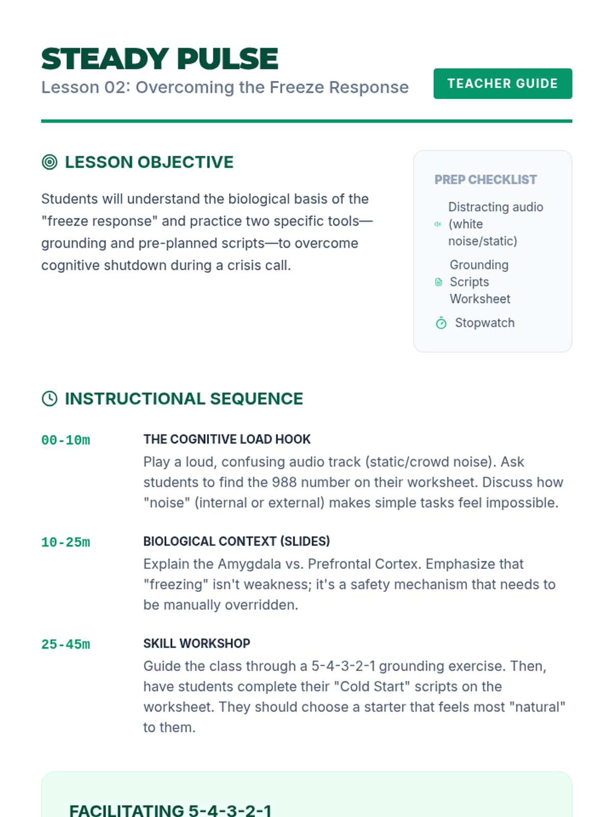 This skill-building sequence focuses on communication strategies for seeking crisis support, moving beyond just knowing phone numbers to practicing the specific scripts and techniques needed to facilitate help for oneself or others. Students learn to articulate urgent needs, overcome physiological stress responses, perform 'warm handoffs' as bystanders, and navigate the follow-up steps after a crisis call.