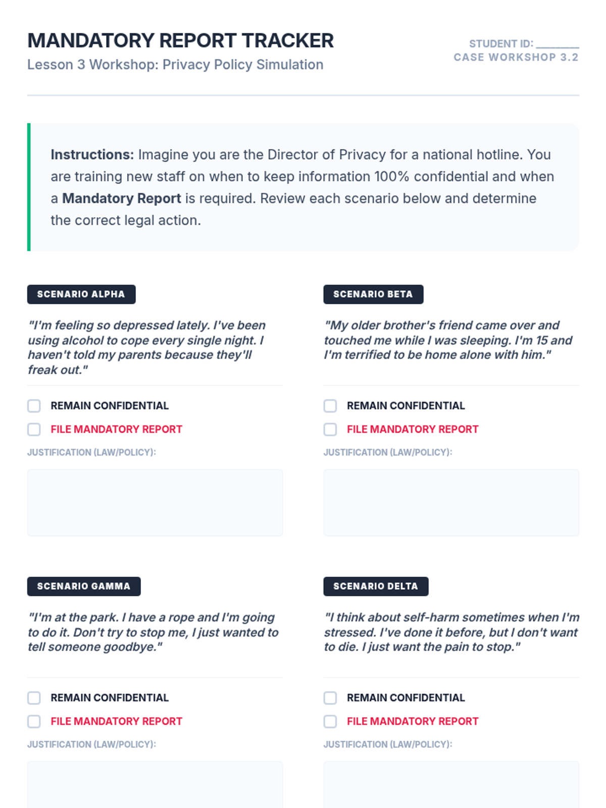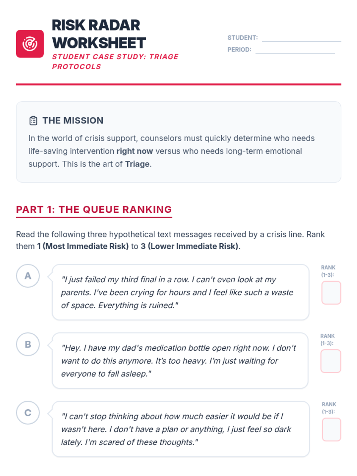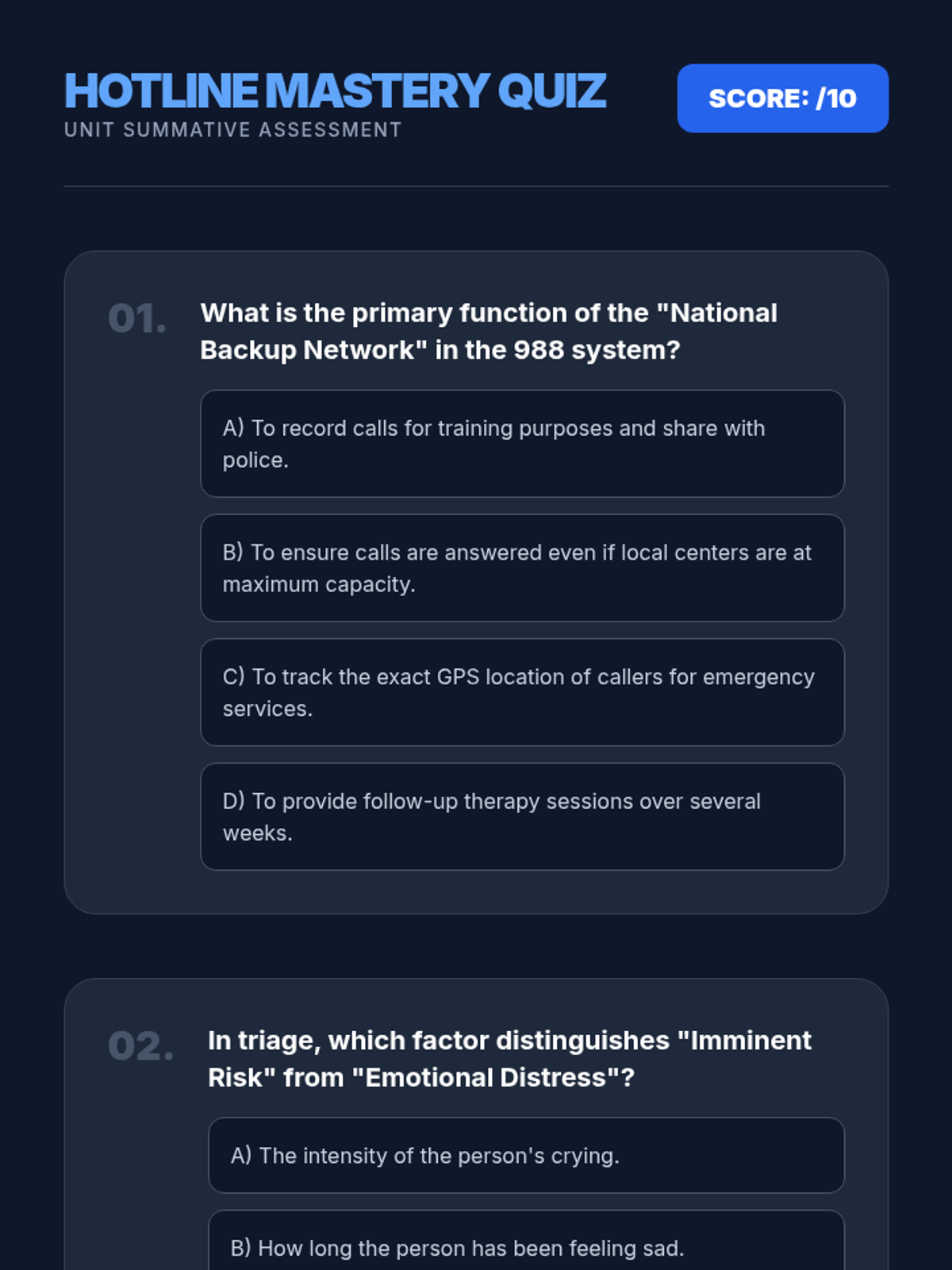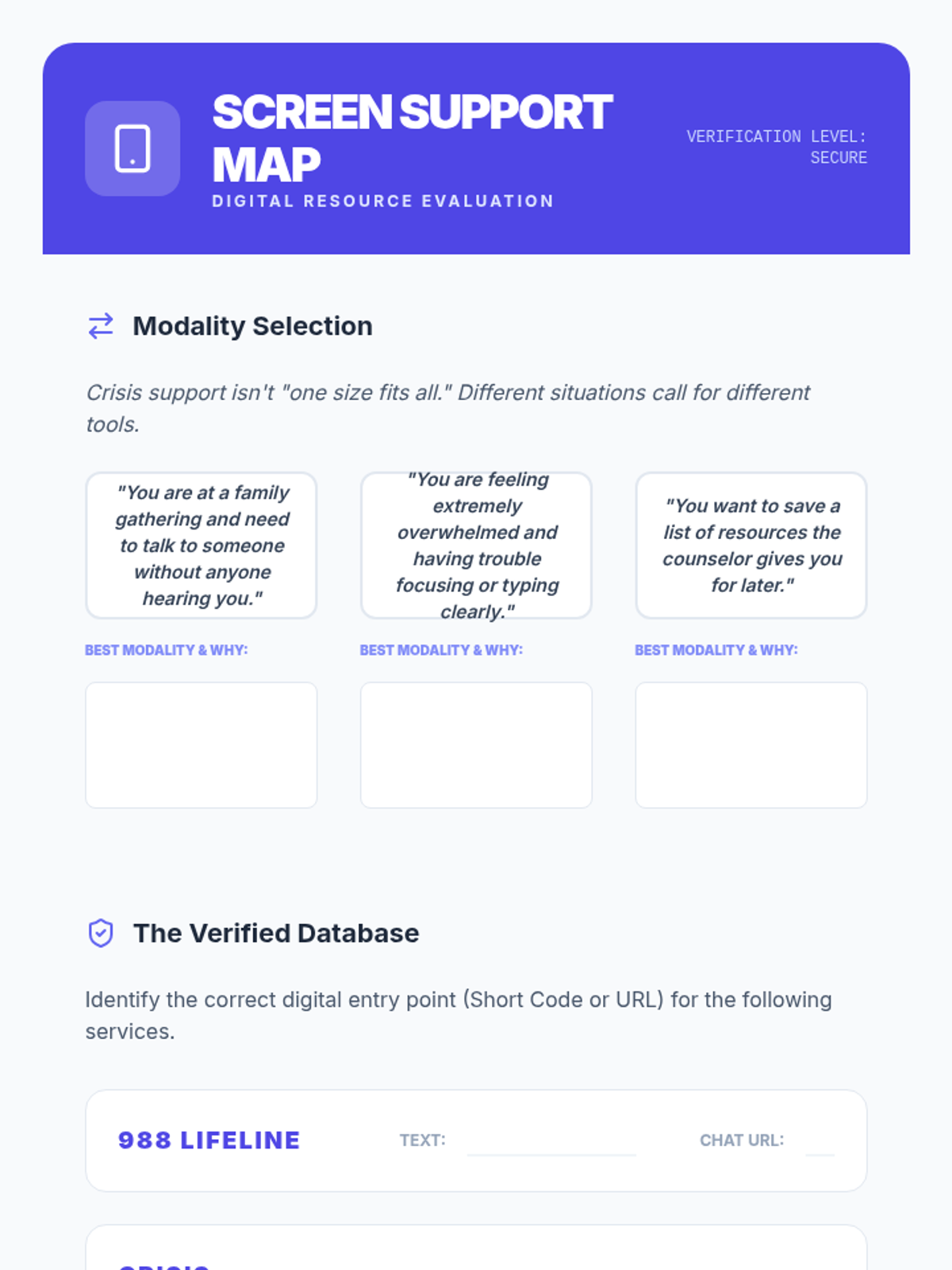 This sequence demystifies the operational side of crisis hotlines, focusing on triage, confidentiality, and the technical workflow of help-seeking. Students will learn how risk is assessed and how privacy is maintained, reducing anxiety about reaching out for support.