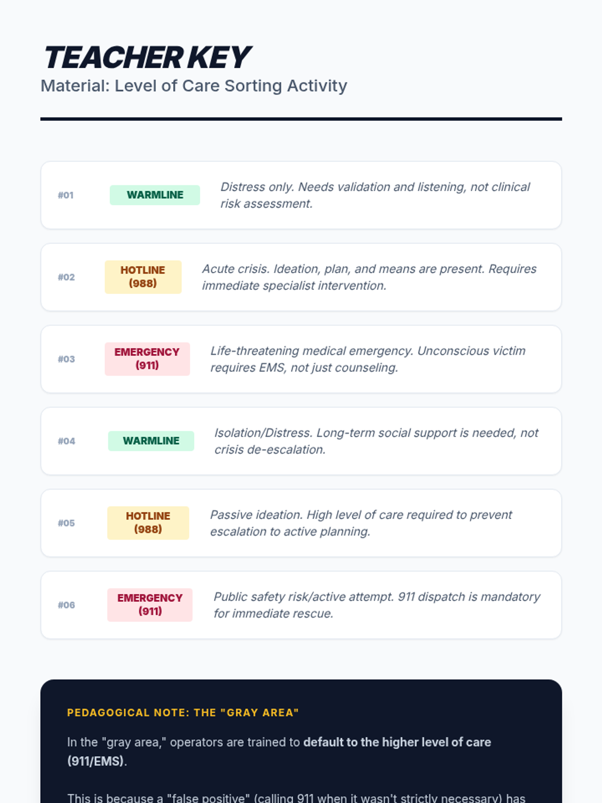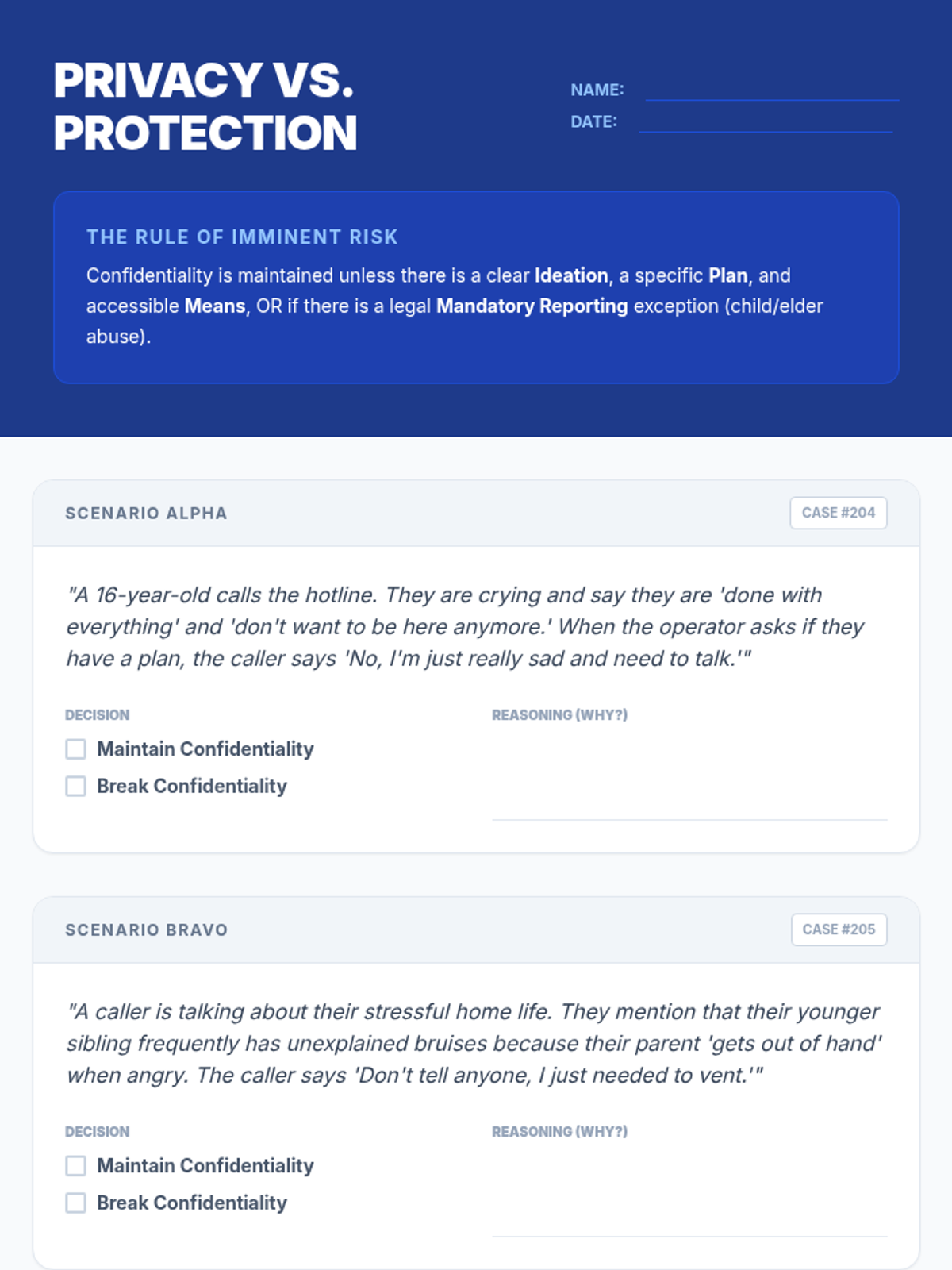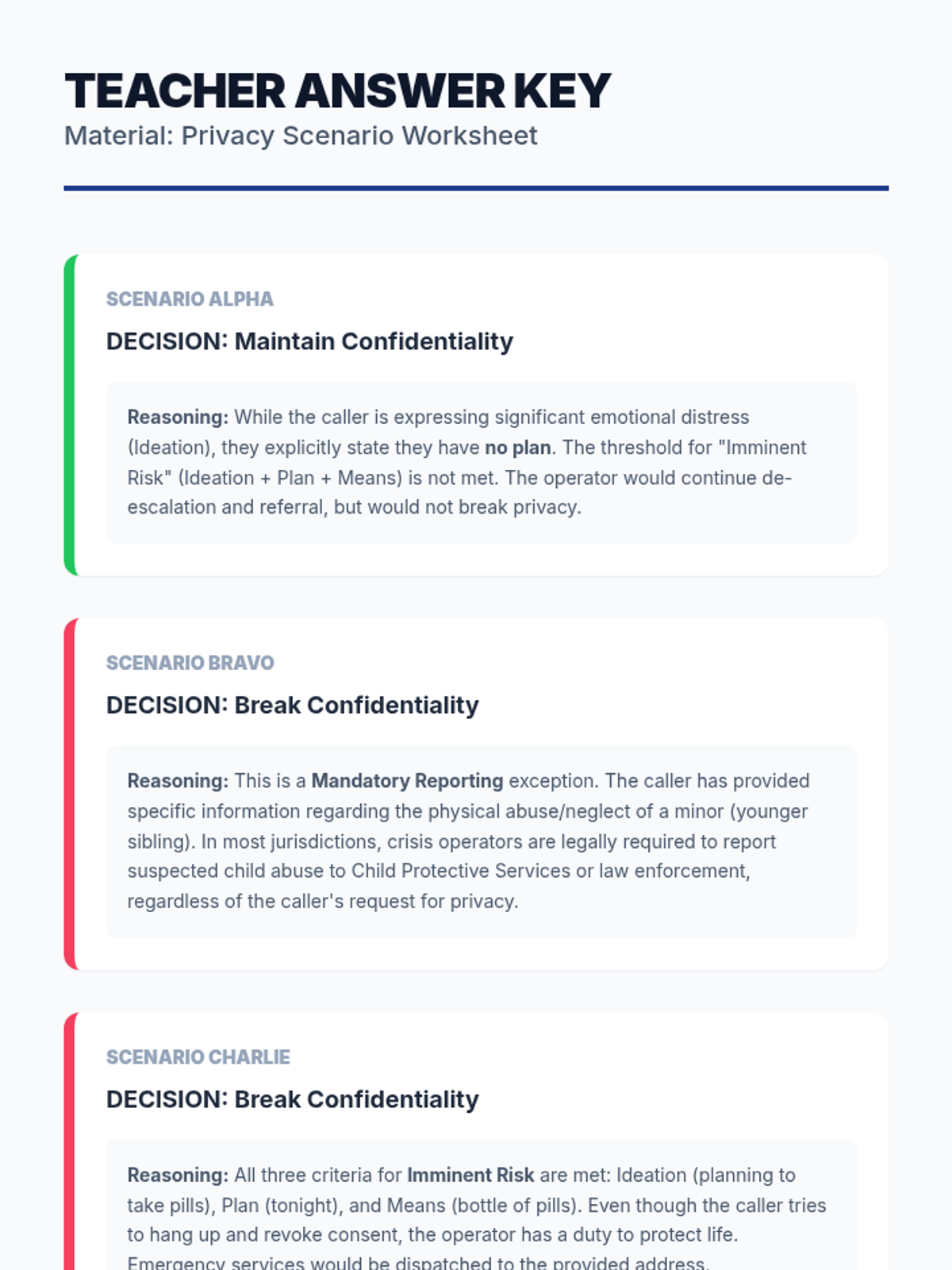 This sequence demystifies the operational side of crisis hotlines, focusing on technical and legal procedures. Students explore the 988 system, confidentiality laws, and triage protocols to understand how help is delivered and privacy is protected.