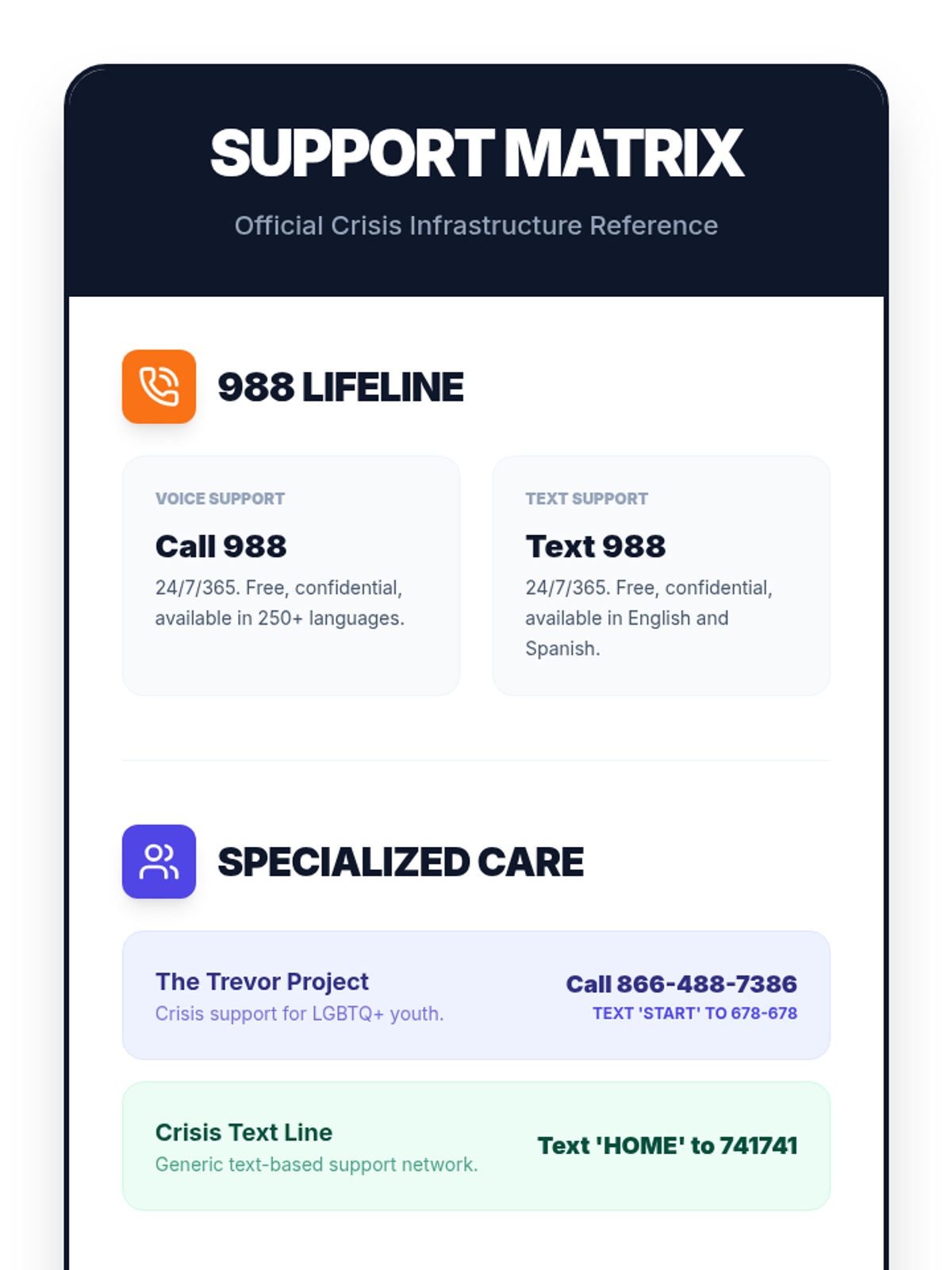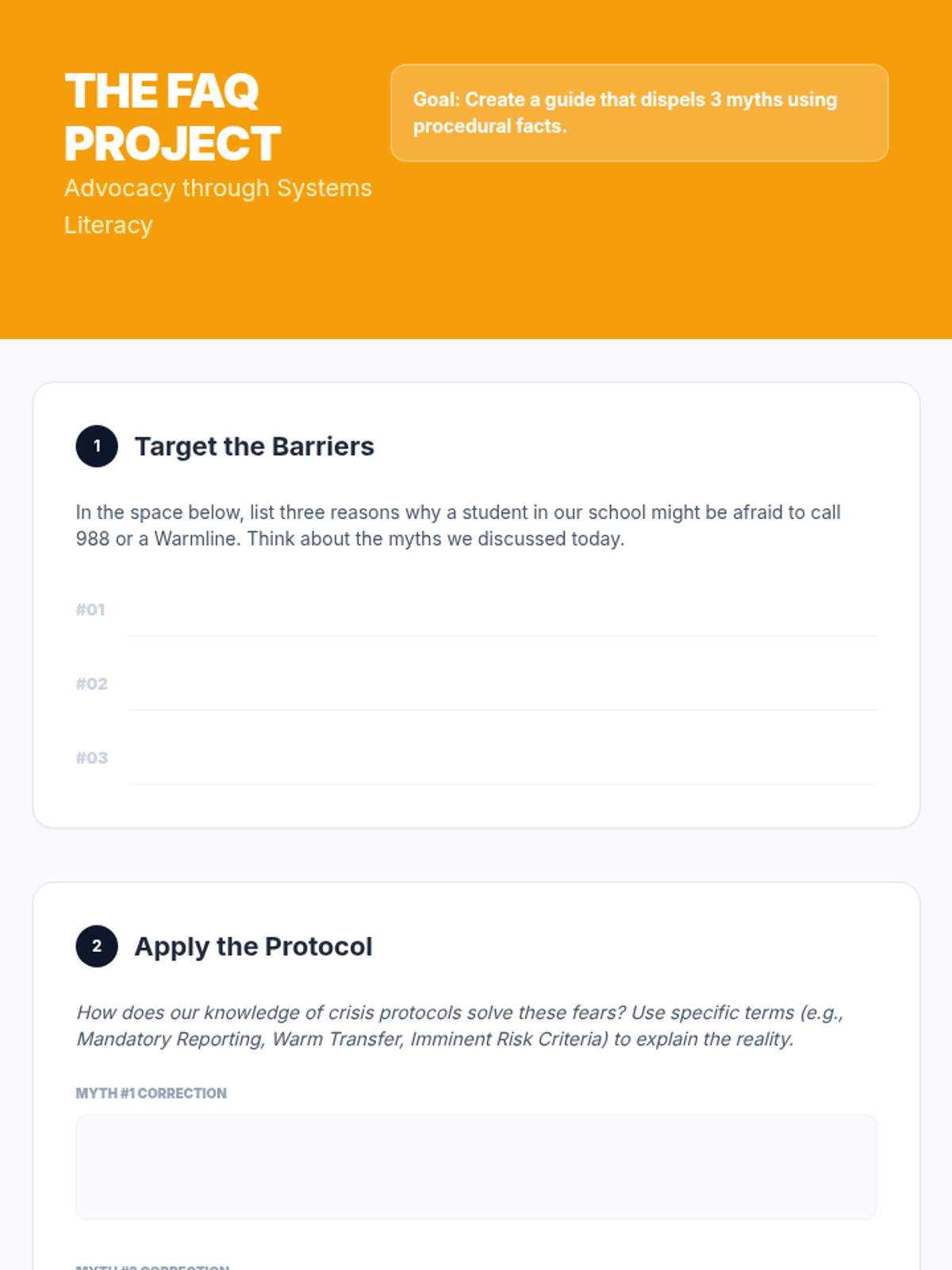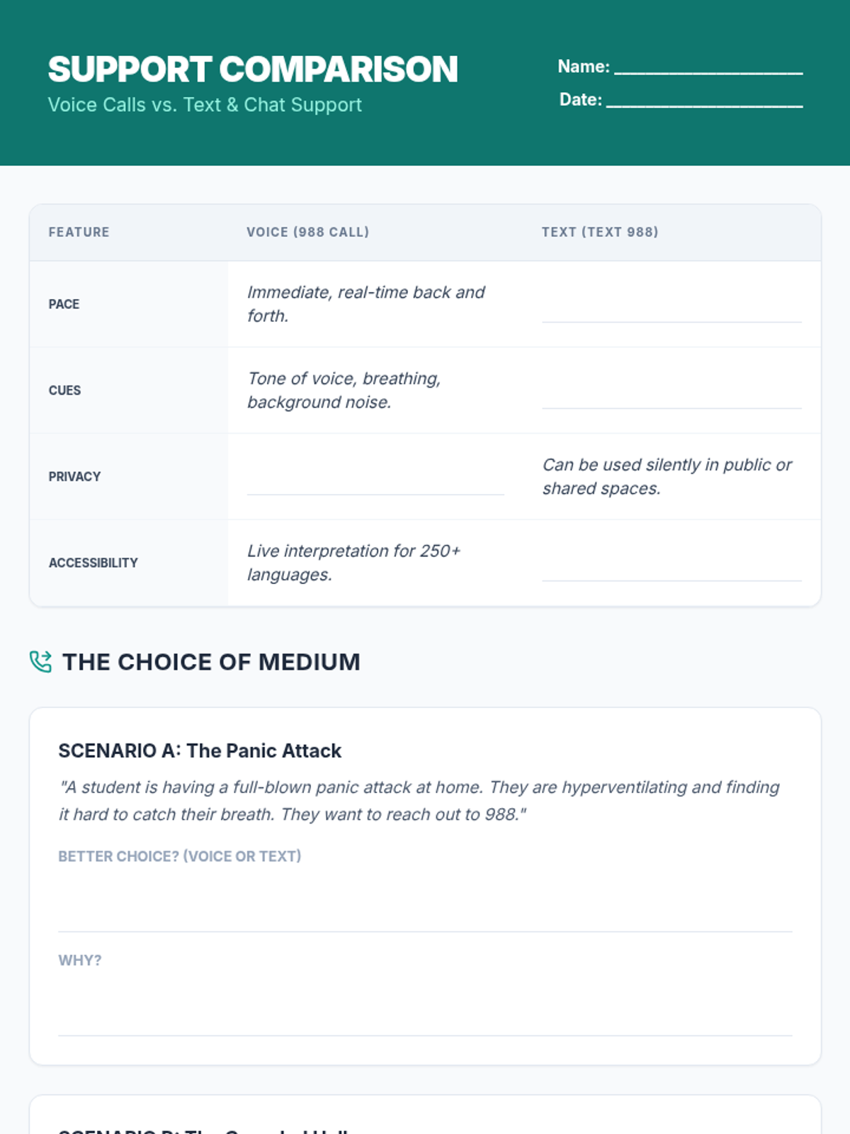 This sequence demystifies the operational side of crisis hotlines, focusing on technical and legal procedures. Students explore the 988 system, confidentiality laws, and triage protocols to understand how help is delivered and privacy is protected.