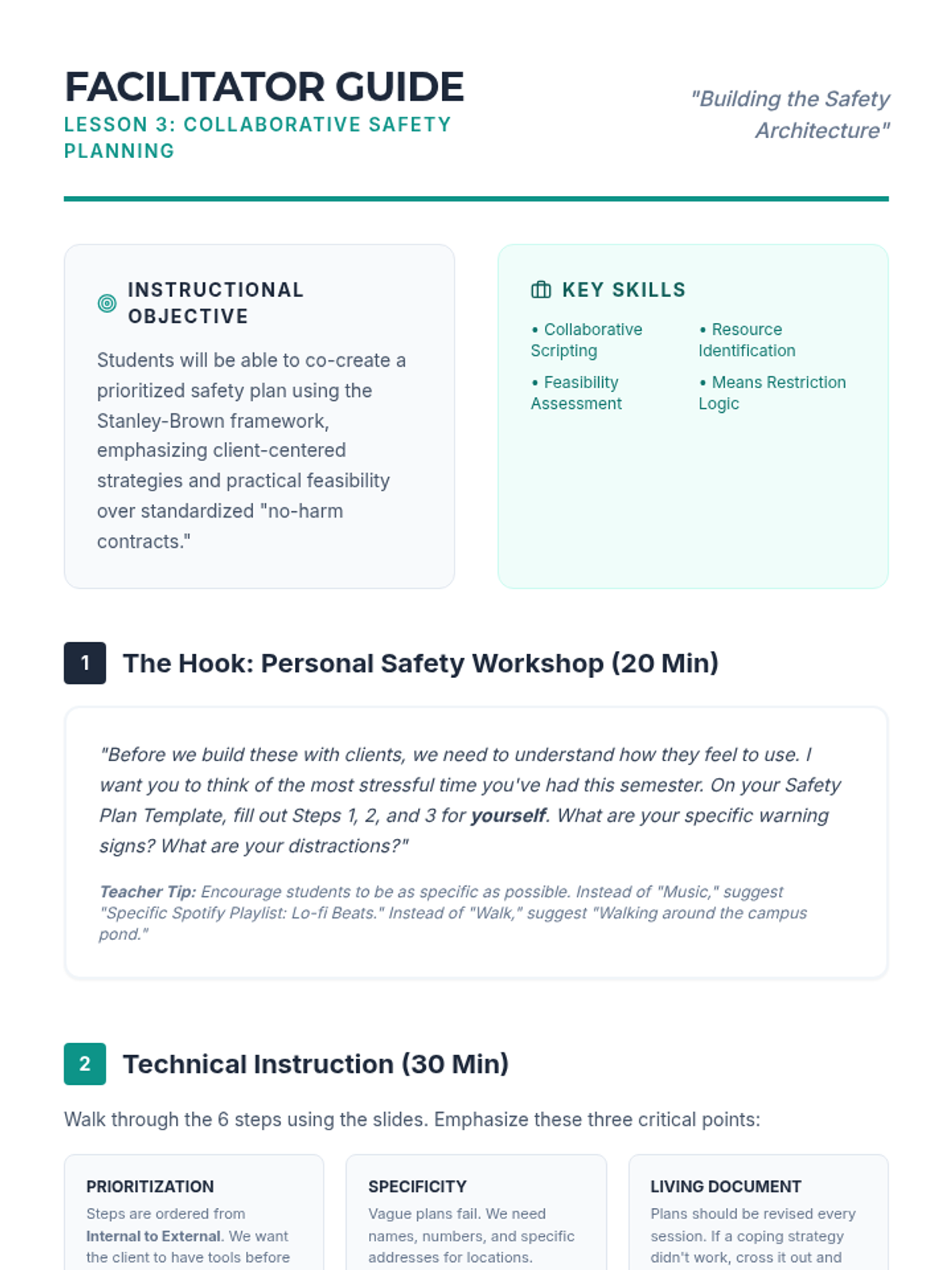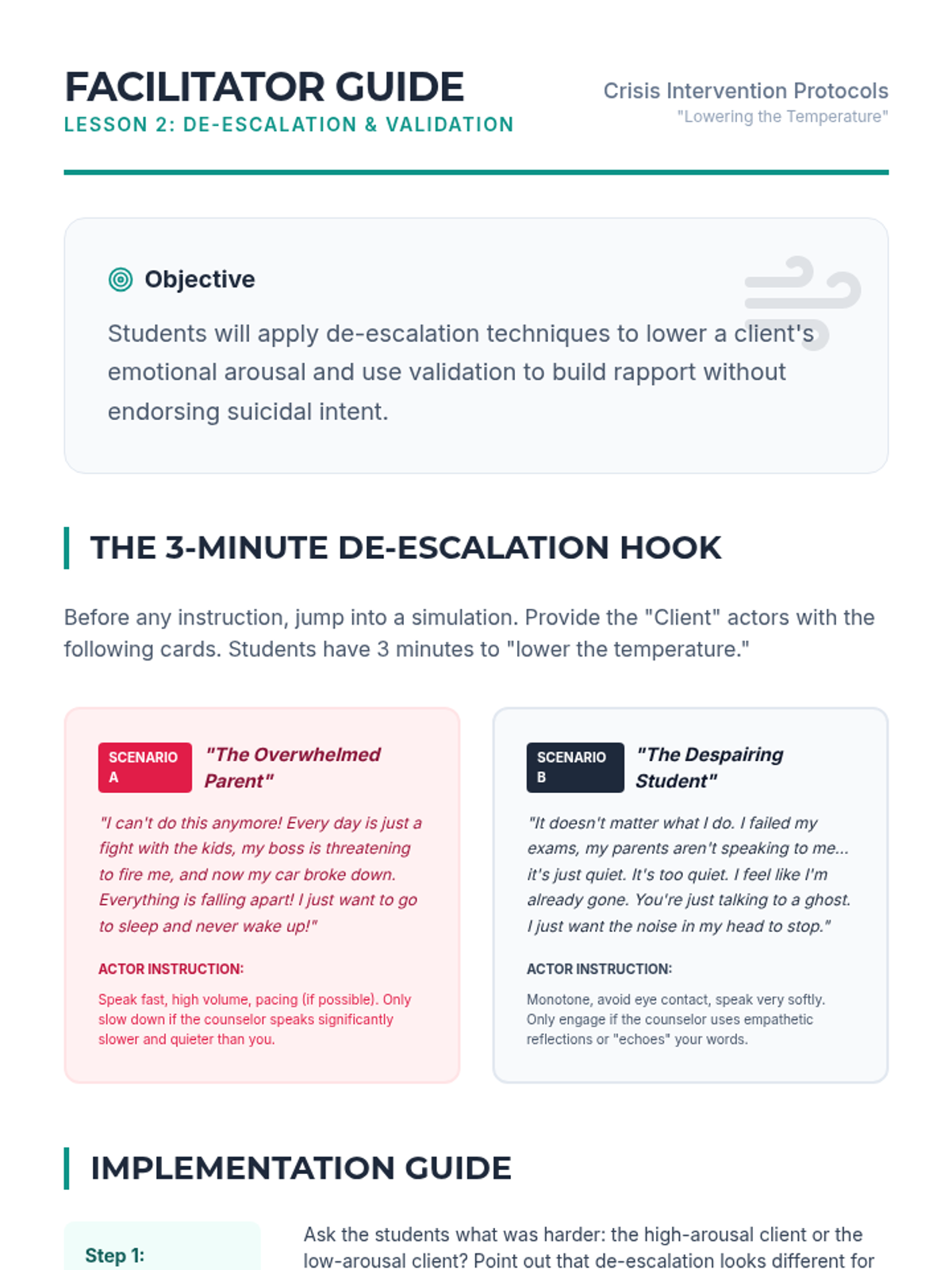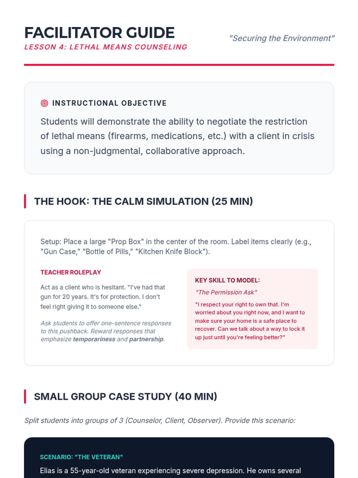 This sequence equips undergraduate counseling students with the interpersonal and procedural skills necessary for suicide intervention, covering direct communication, de-escalation, safety planning, lethal means counseling, and legal/ethical mandates.