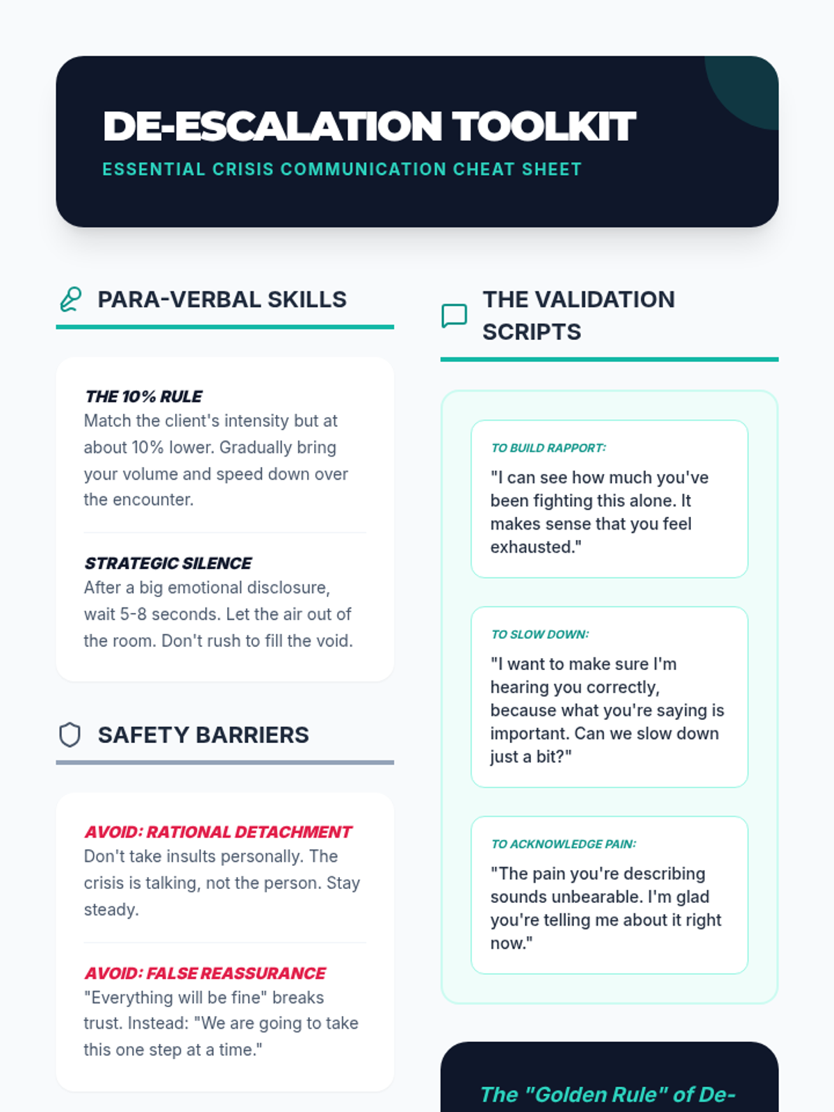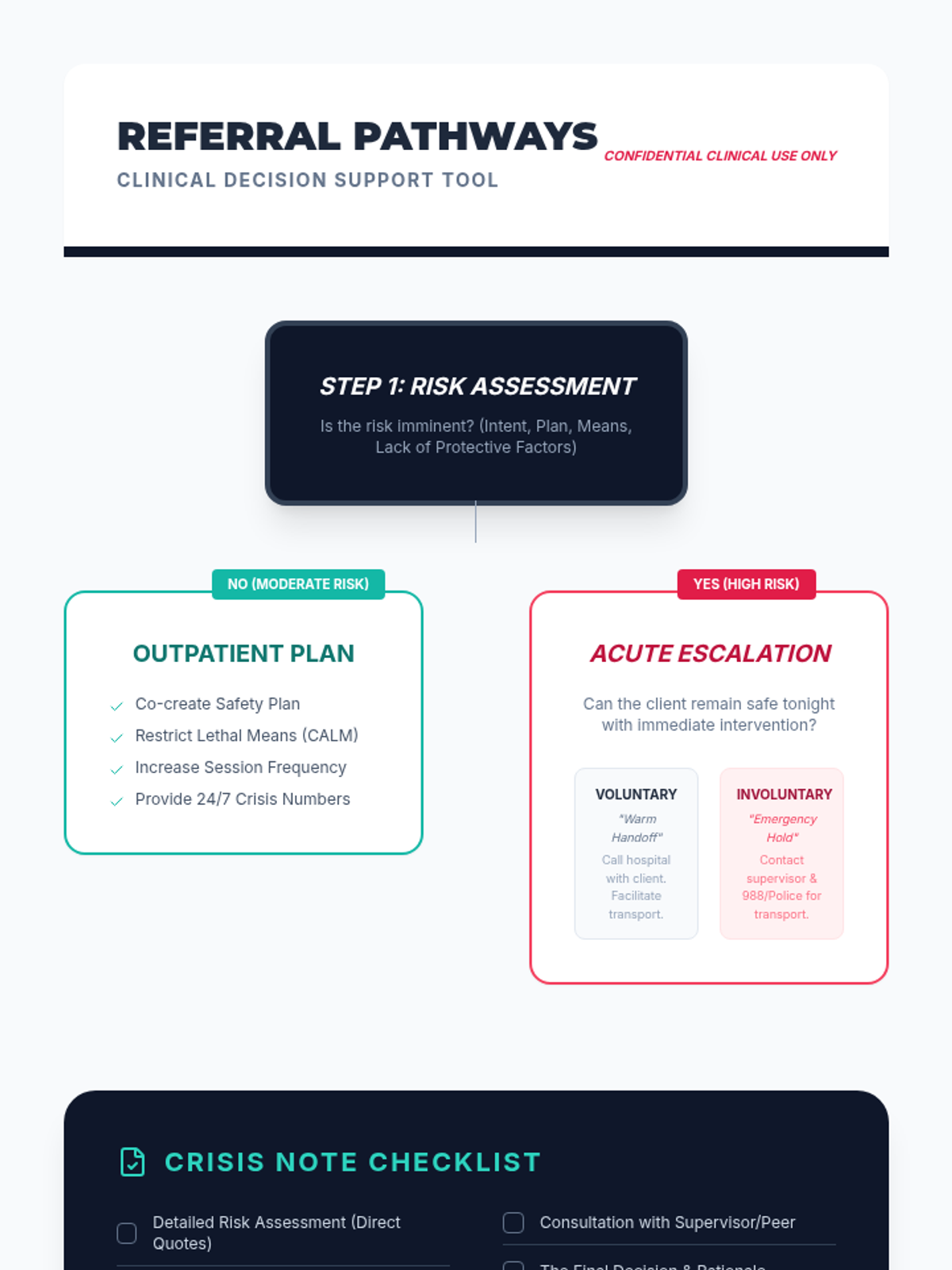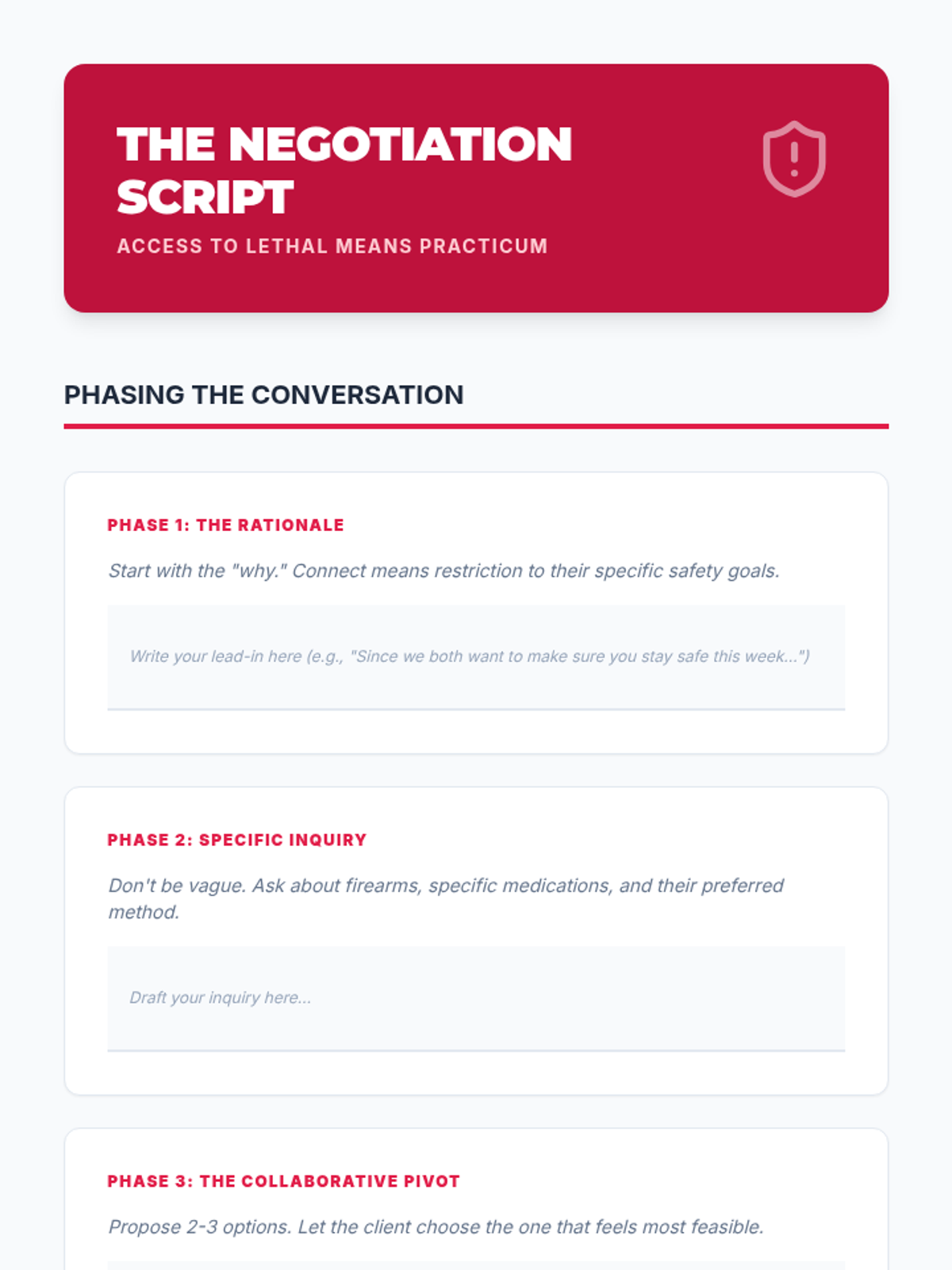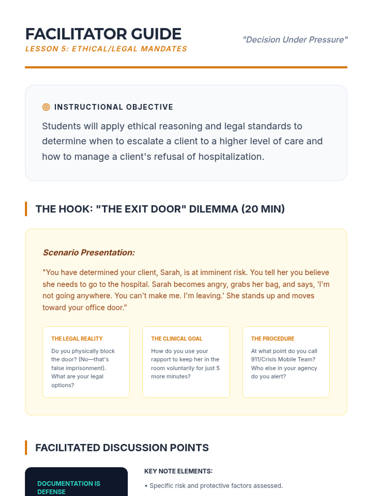 This sequence equips undergraduate counseling students with the interpersonal and procedural skills necessary for suicide intervention, covering direct communication, de-escalation, safety planning, lethal means counseling, and legal/ethical mandates.
