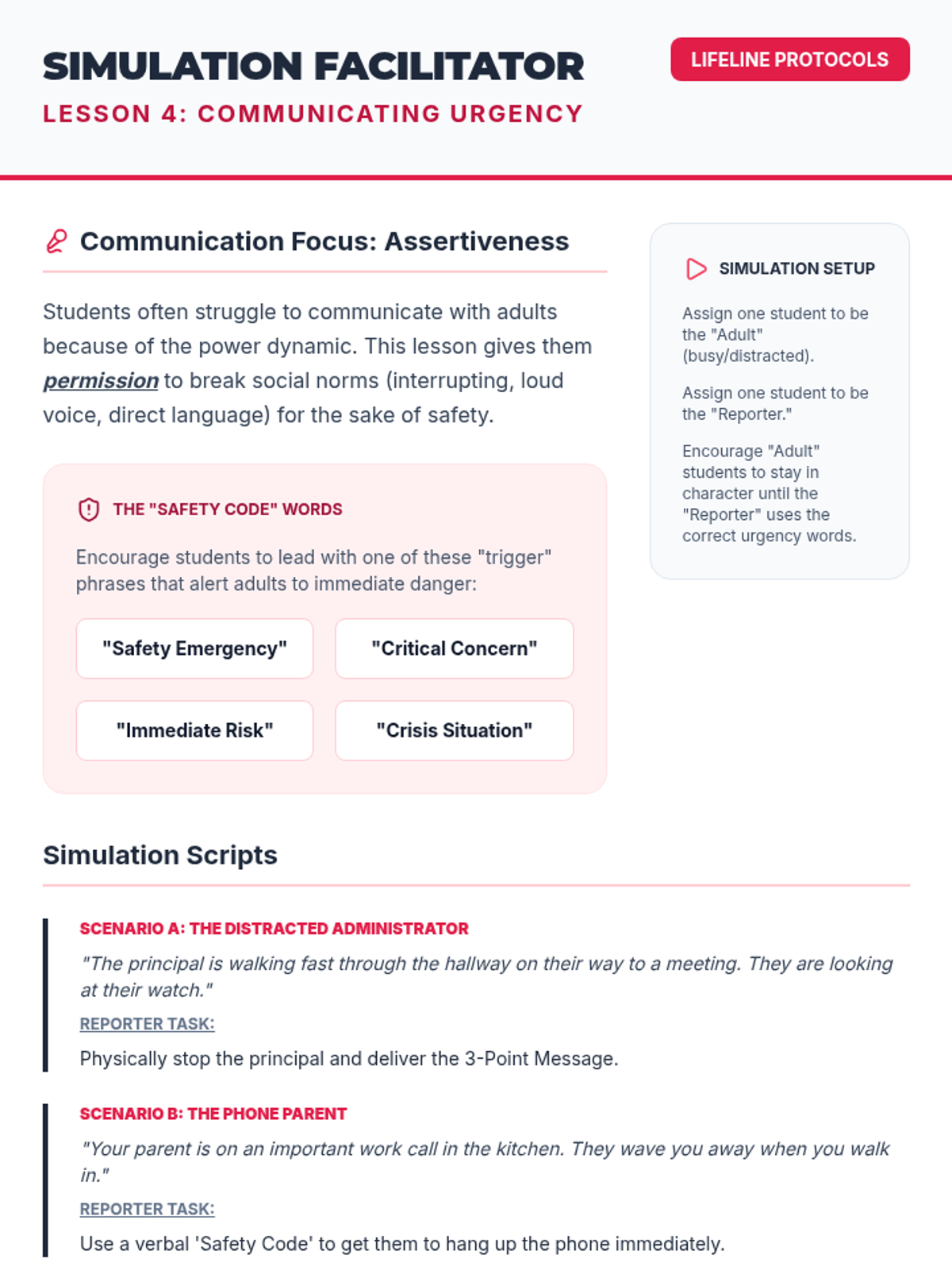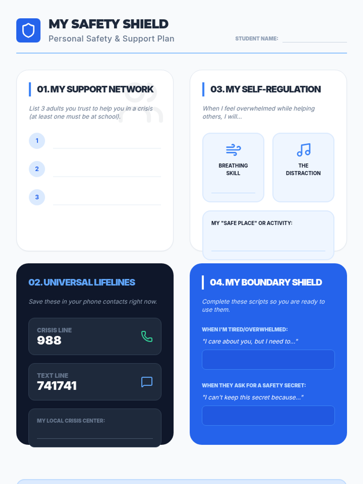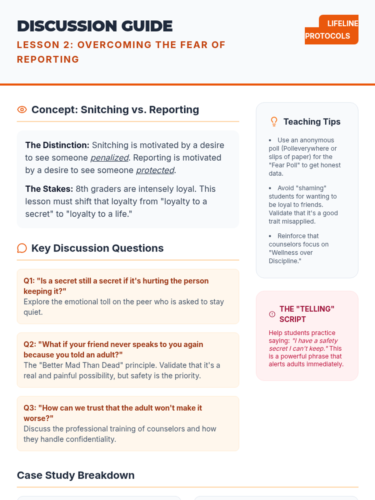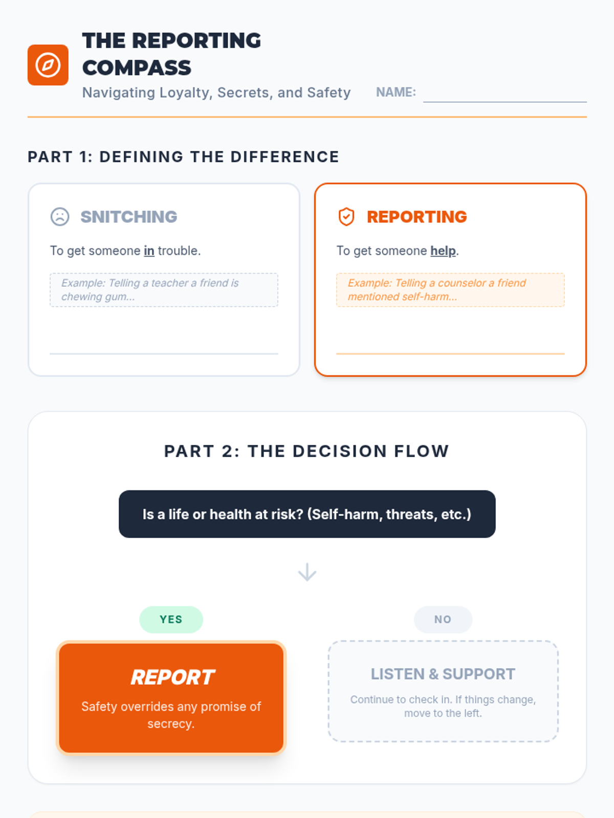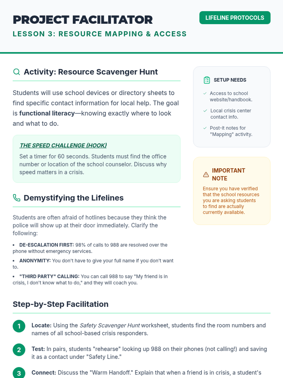 An actionable workshop sequence for 8th graders on recognizing mental health crises and applying the ACT (Acknowledge, Care, Tell) model to ensure peer safety. Students learn to overcome barriers to reporting and practice communicating urgency to trusted adults.