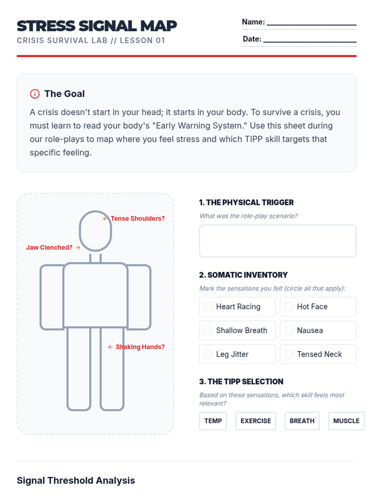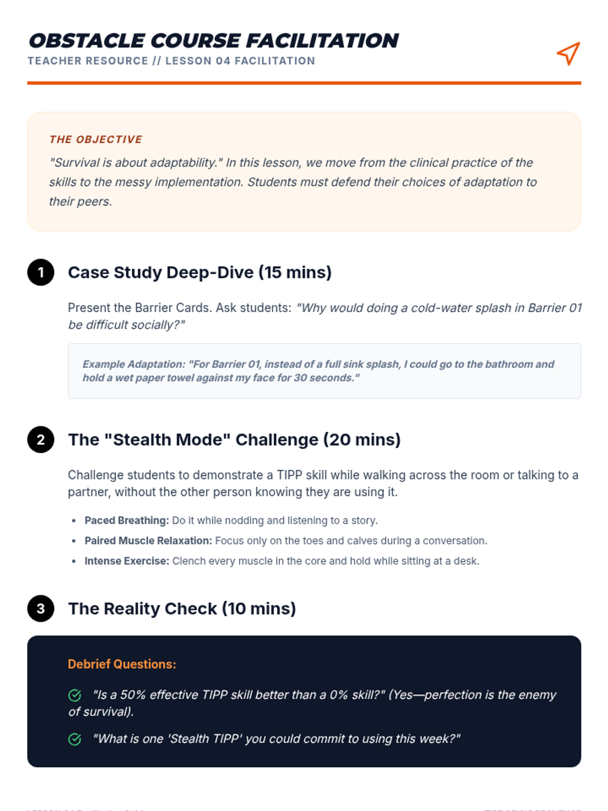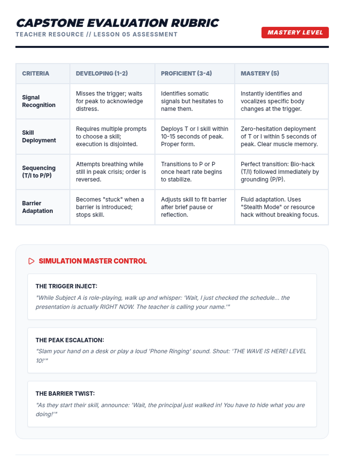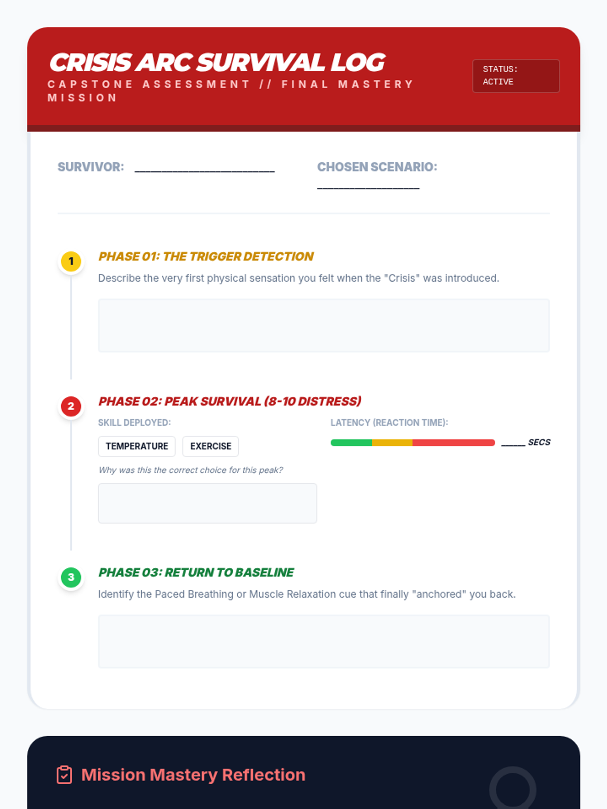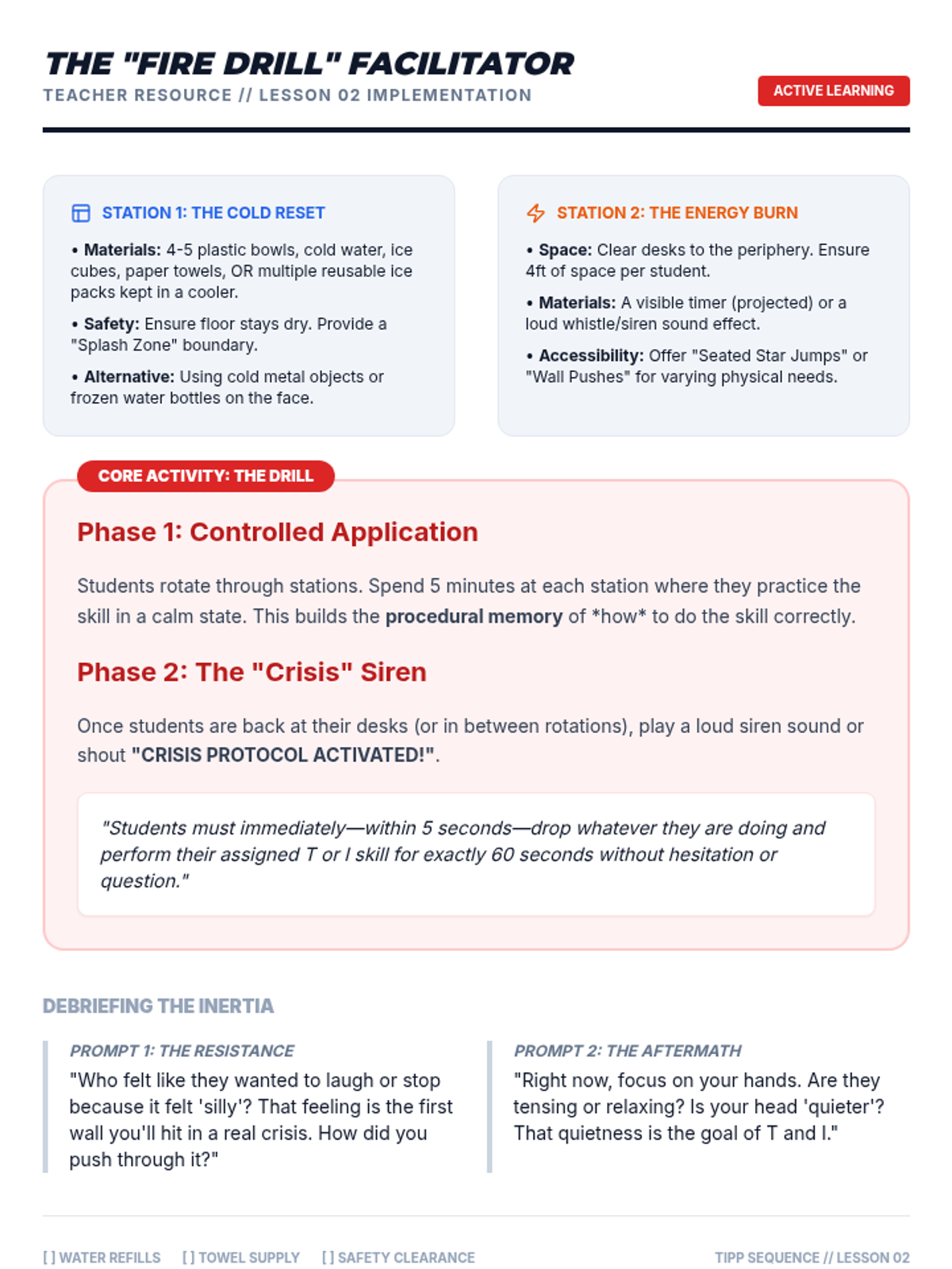 This sequence uses simulations and role-play to help 10th-grade students build muscle memory for TIPP crisis survival skills, focusing on reducing reaction time between distress and action.