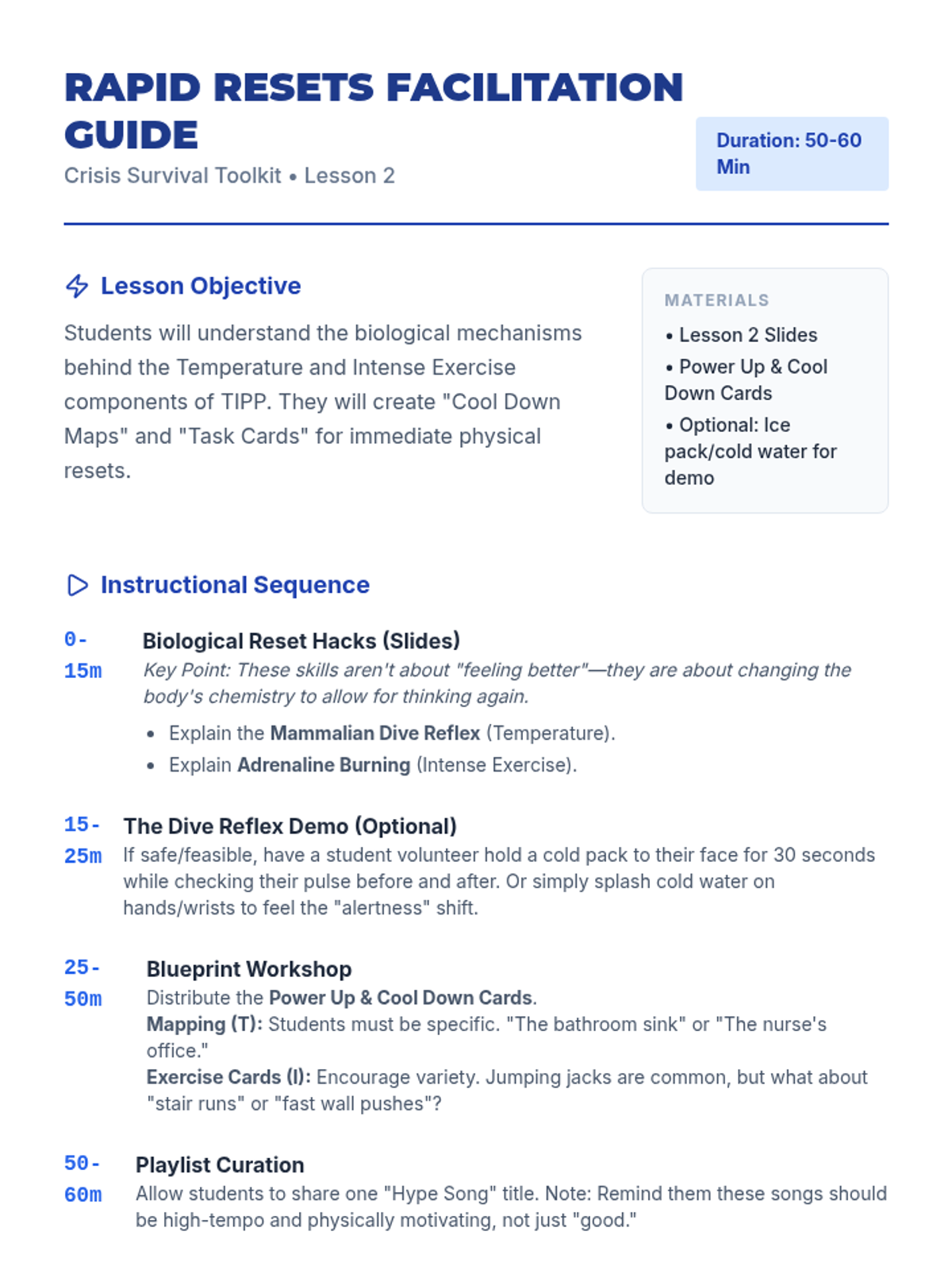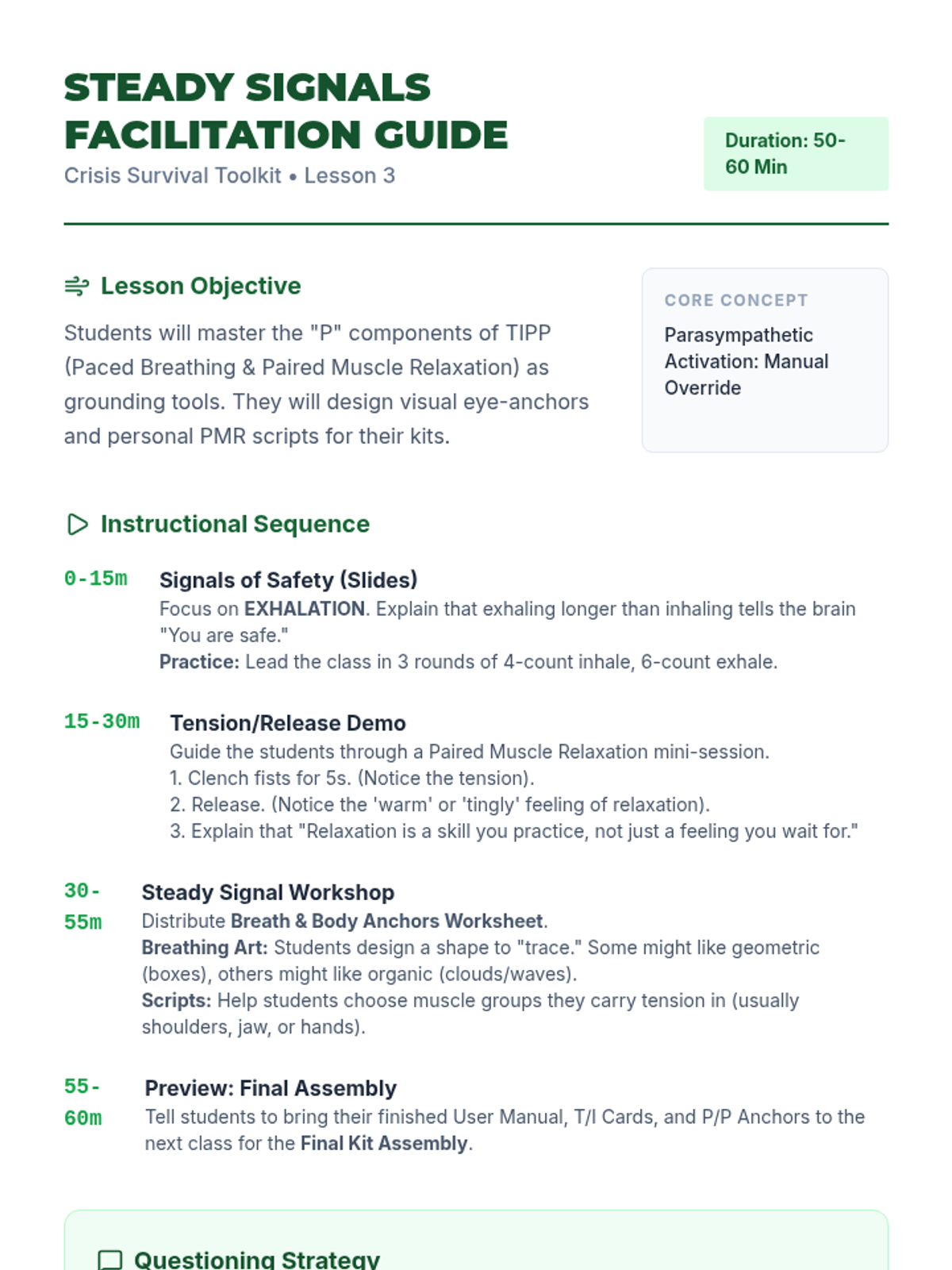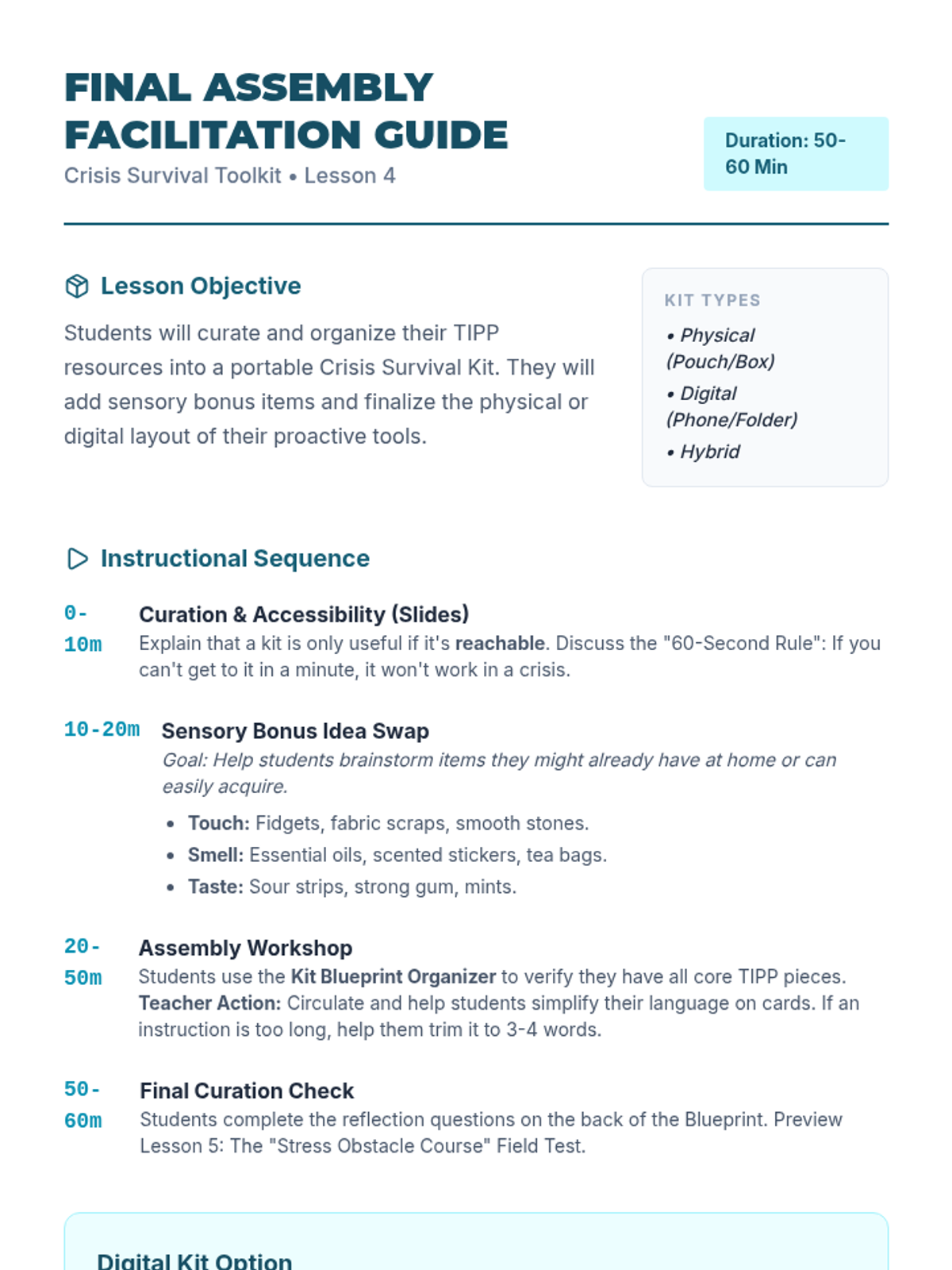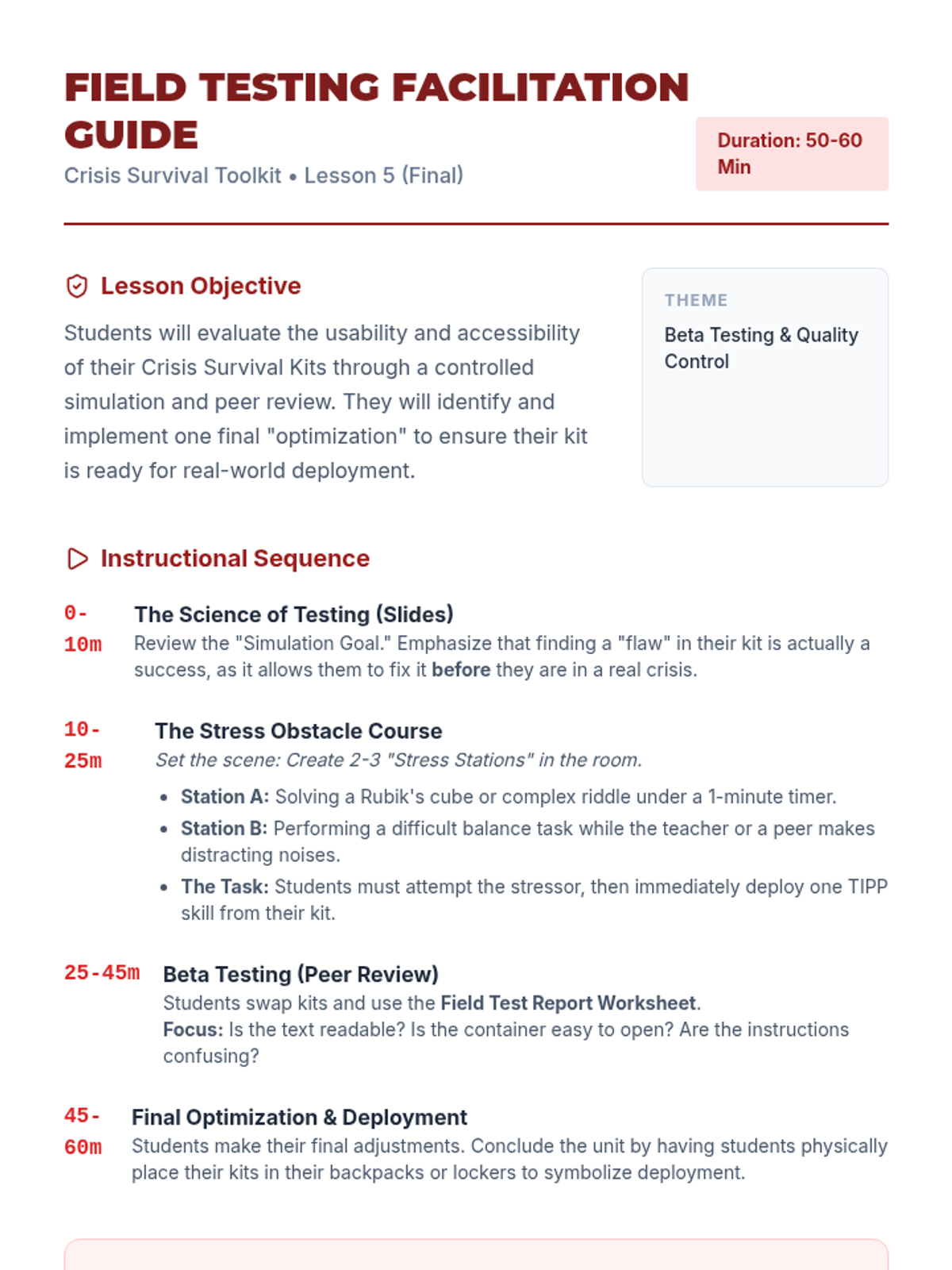 A project-based unit where 7th-grade students design and assemble personal 'Crisis Survival Kits' based on the TIPP skills (Temperature, Intense Exercise, Paced Breathing, and Paired Muscle Relaxation). Students move from self-audit to physical tool creation and final testing of their proactive mental health resources.