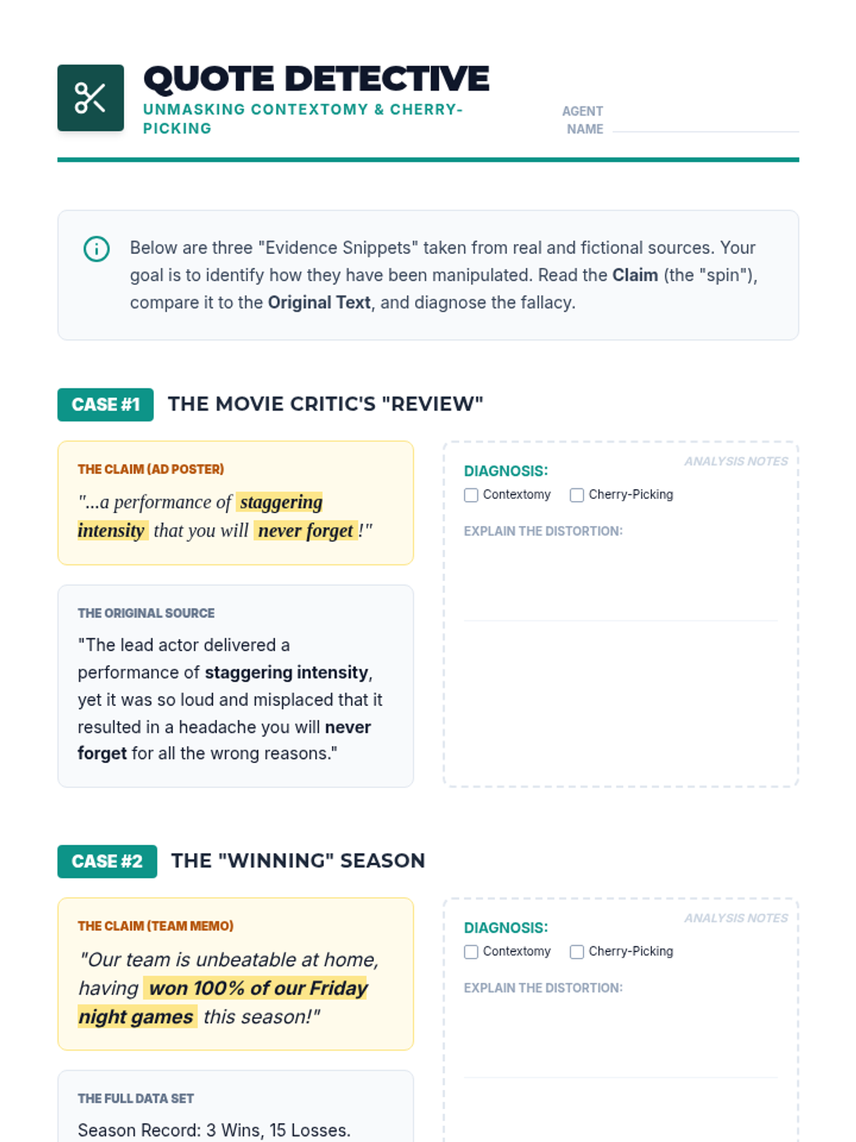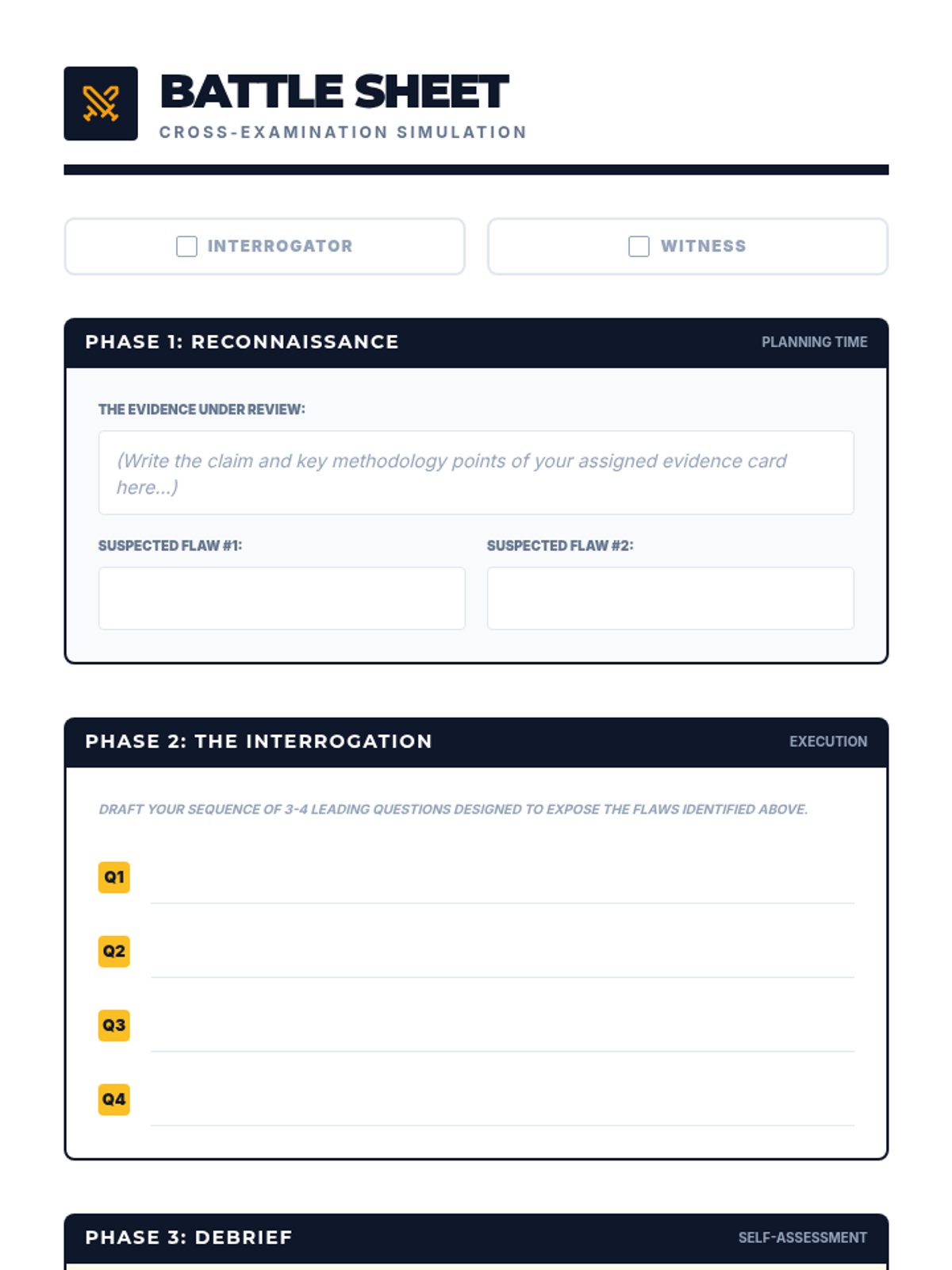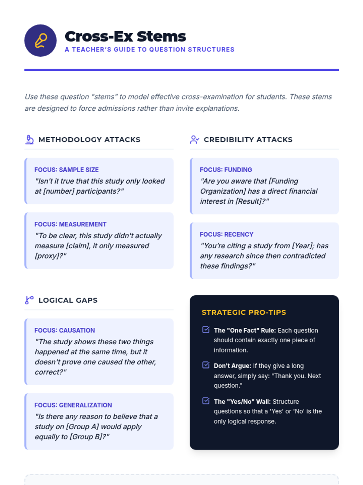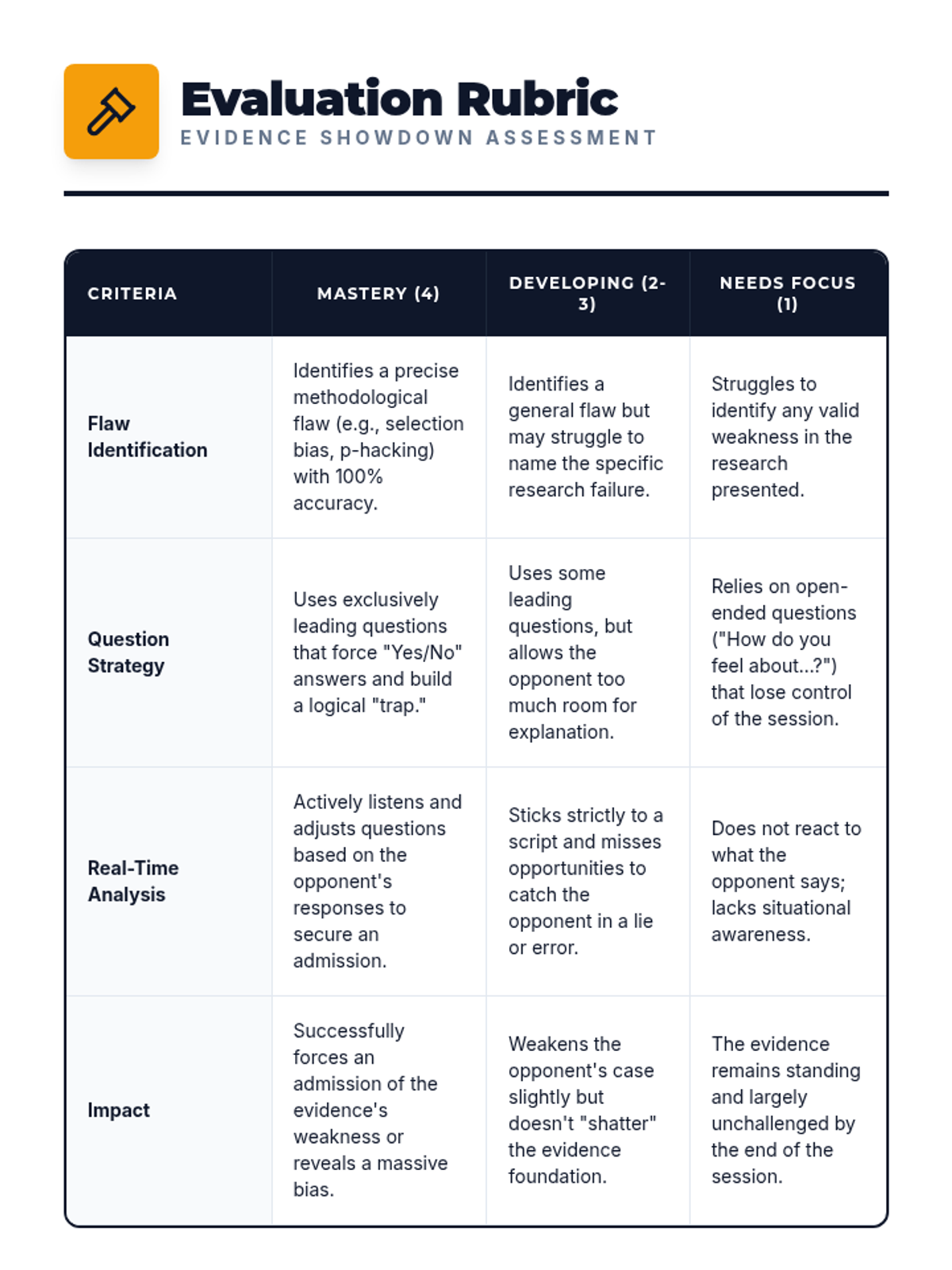 A 10th-grade ELA sequence focused on the critical analysis and deconstruction of opposing evidence in debate. Students learn to scrutinize research methodologies, identify logical fallacies like cherry-picking and contextomy, and develop sharp cross-examination skills to expose weaknesses in arguments.