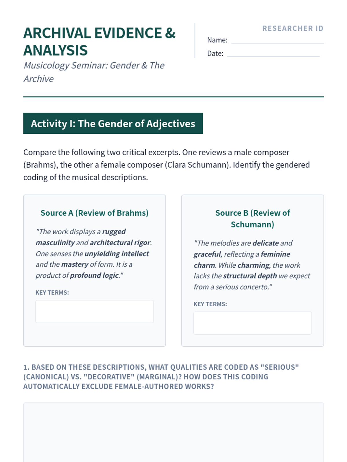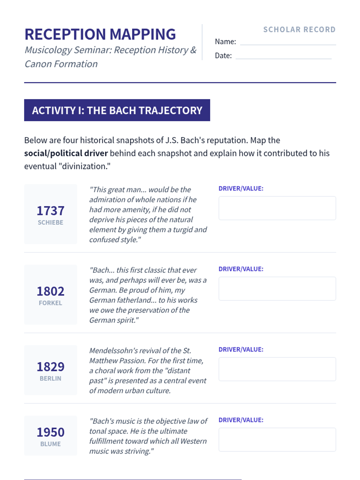 An advanced graduate seminar sequence exploring the social, political, and ideological forces that shape Western Art Music history. Students move from deconstructing 19th-century canon-building to proposing new, inclusive curricular frameworks.