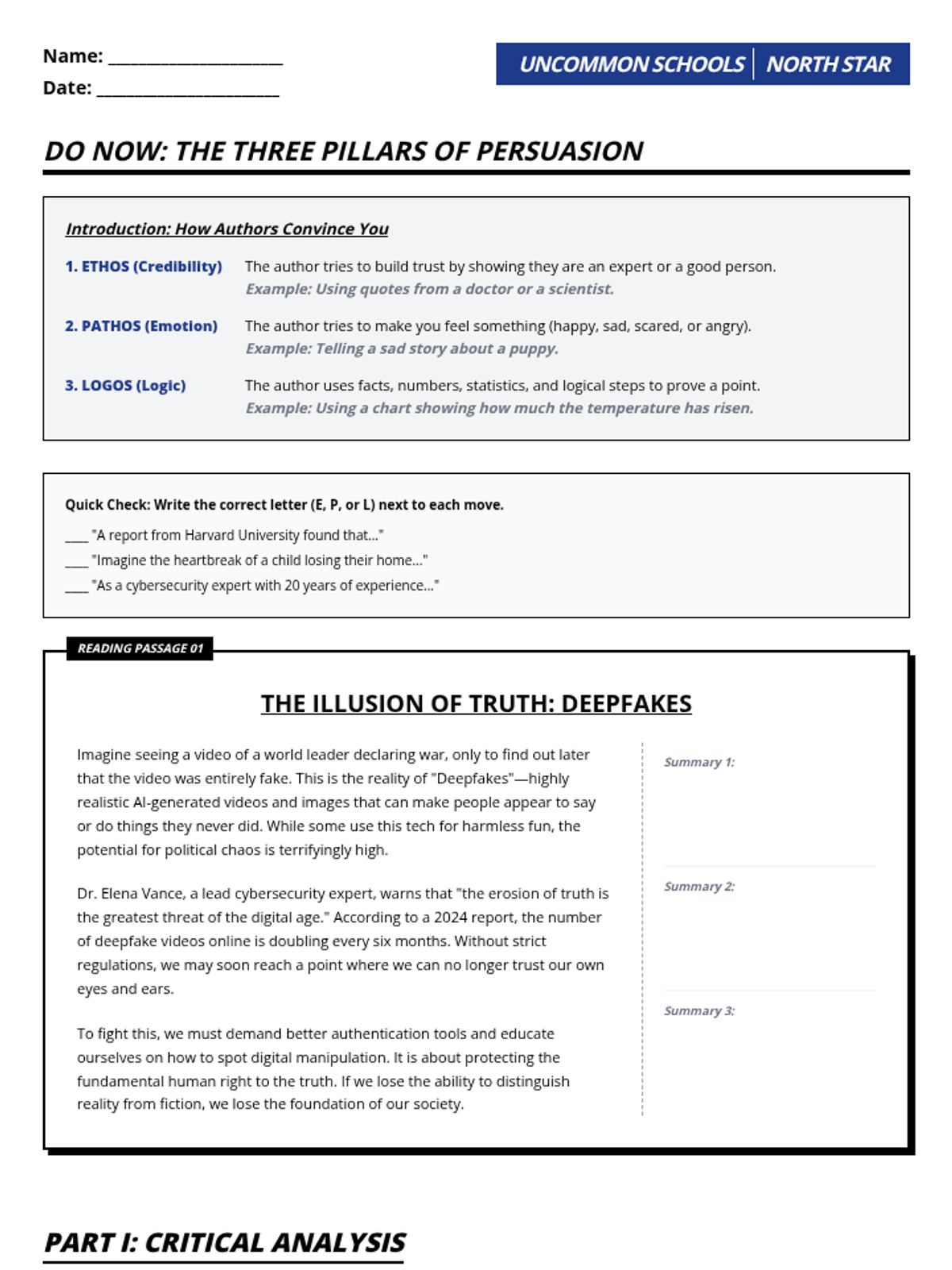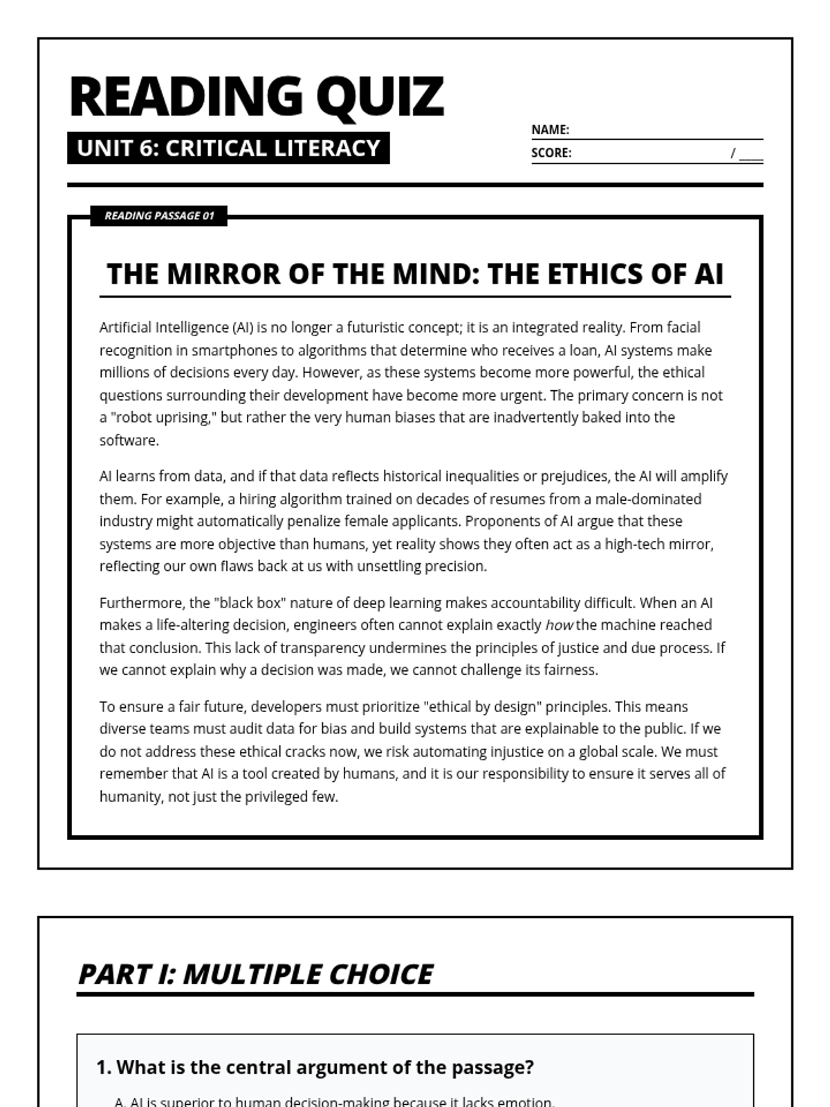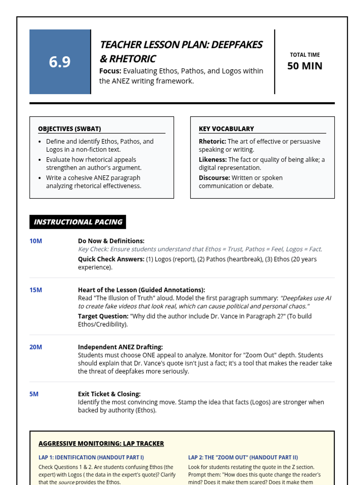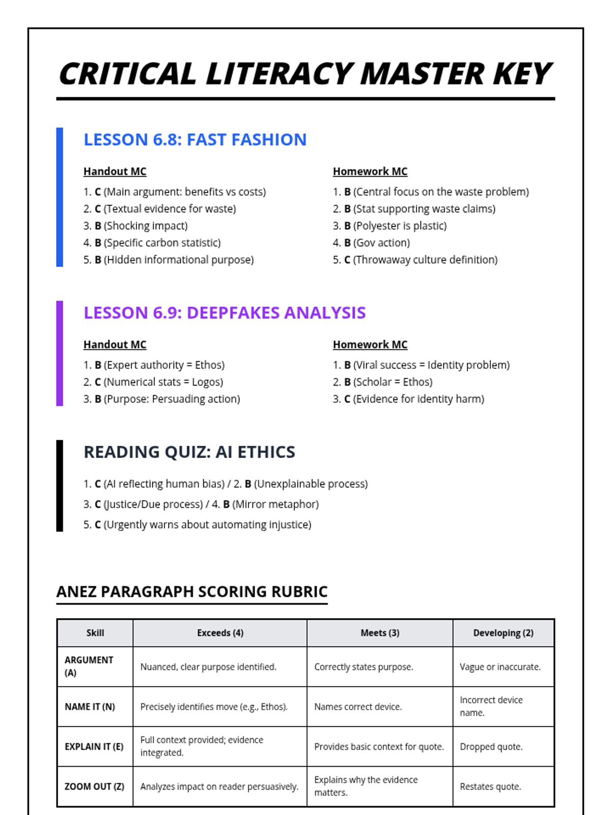 A two-part literacy unit focused on informational text analysis, featuring a review lesson on the impact of fast fashion and a formal assessment on the ethical considerations of artificial intelligence. Students practice identifying central ideas and author's purpose using the ANEZ paragraph framework.