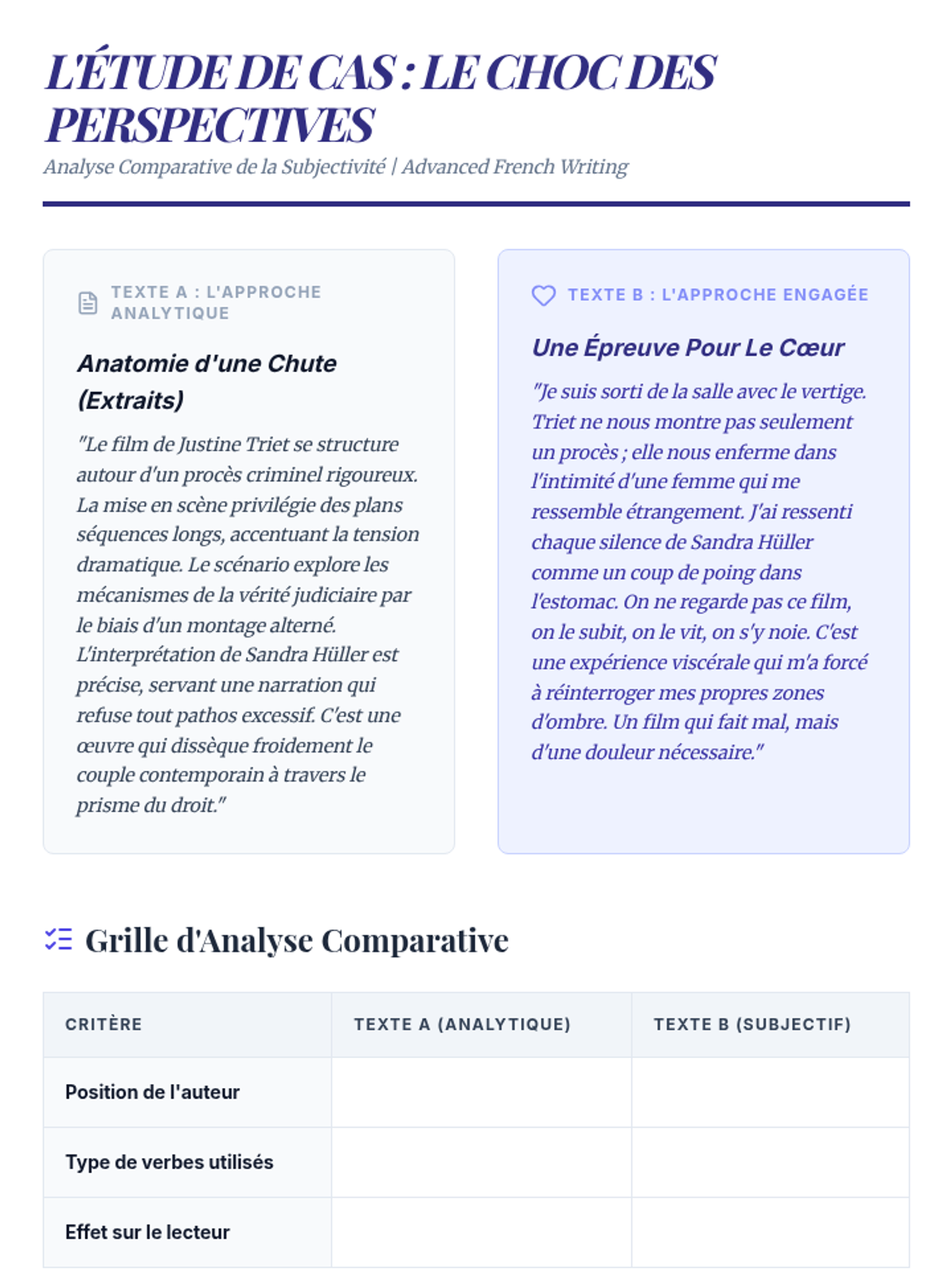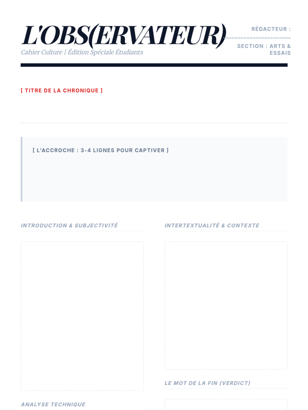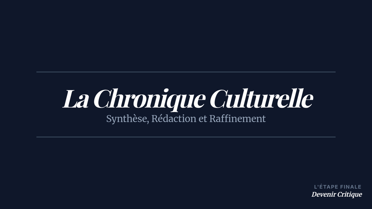 This advanced French writing sequence guides graduate students through the art of cultural criticism, from building a specialized aesthetic vocabulary to crafting sophisticated 'chroniques culturelles'. Students explore the balance of subjectivity and analysis while mastering the journalistic conventions of French intellectual publications.