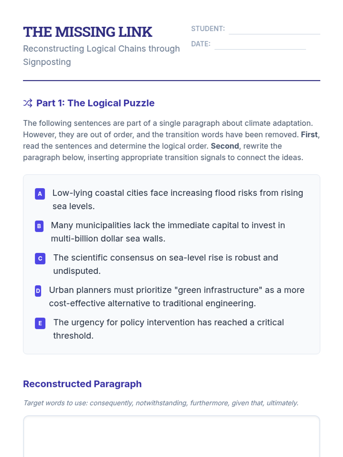 A comprehensive workshop-style unit for 6th Grade ESL students focused on the linguistic mechanics of paraphrasing and synthesizing information. Students move from identifying core concepts to orally retelling information, transforming individual sentences, and finally weaving multiple sources into a single coherent paragraph without plagiarizing.