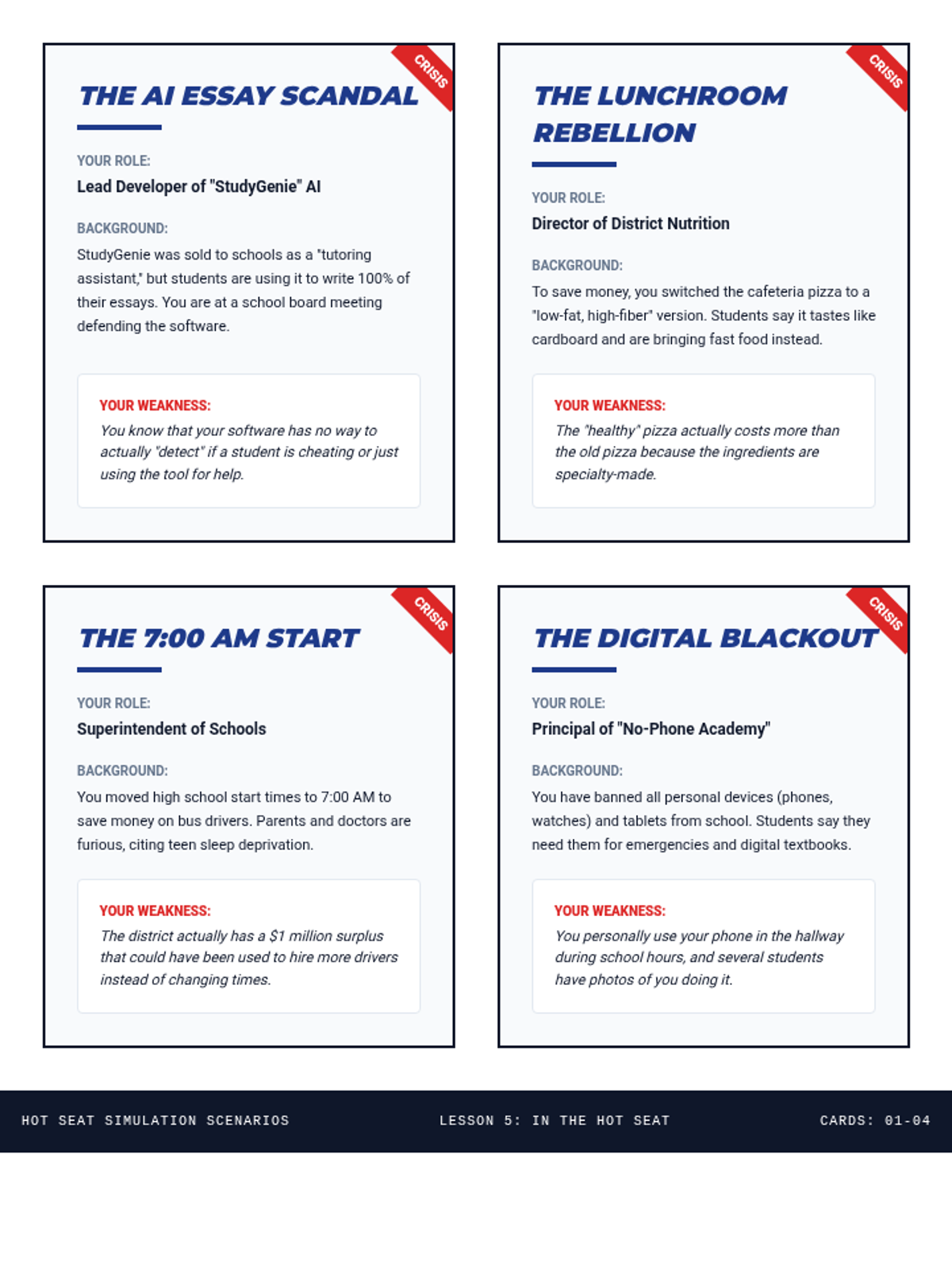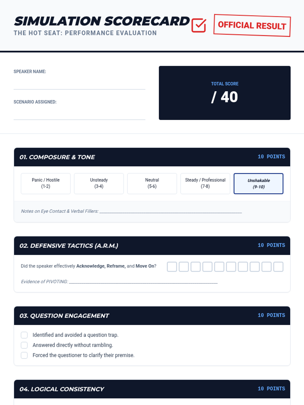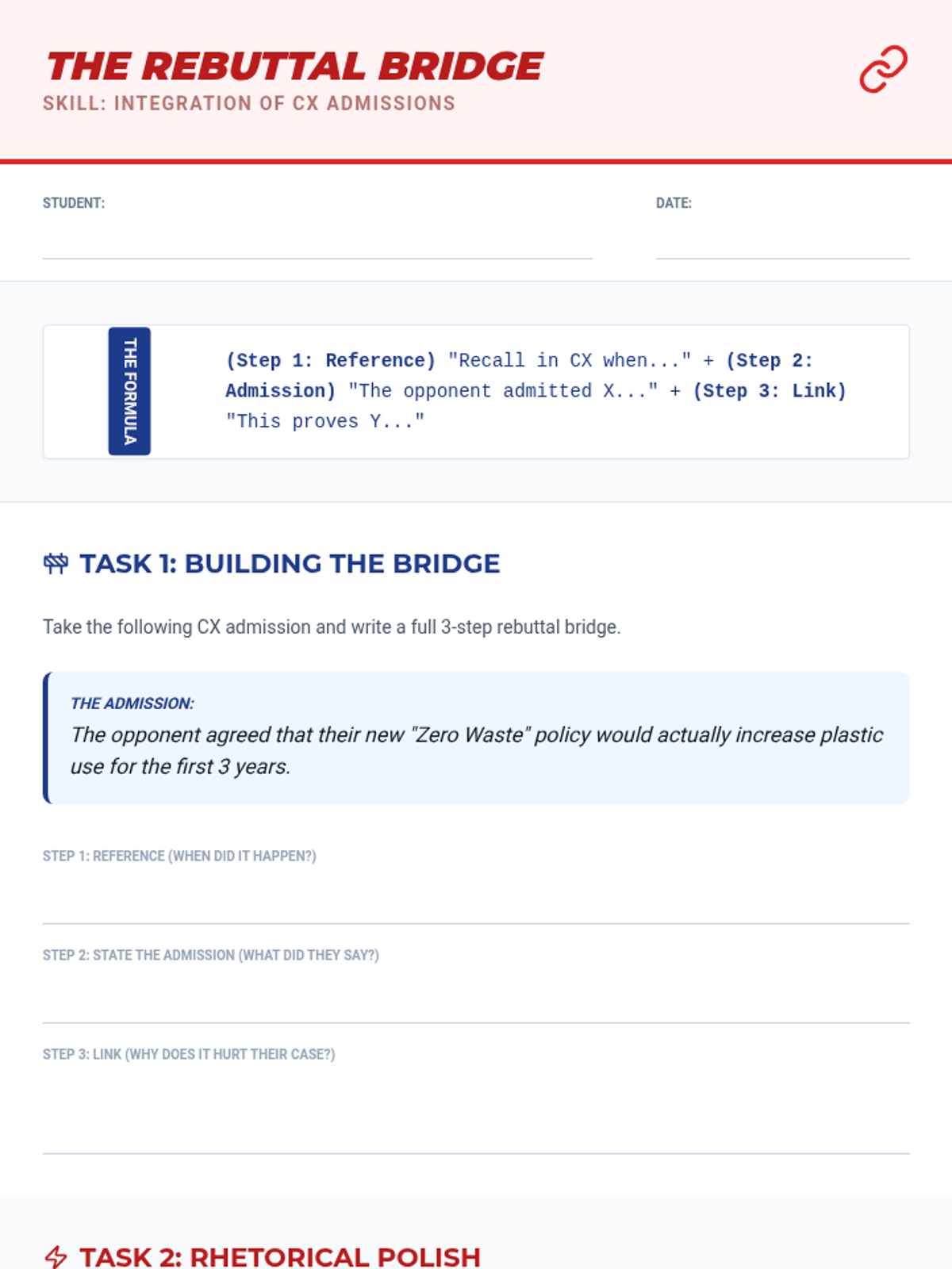 A comprehensive unit on Cross-Examination for middle school debaters, focusing on strategic questioning, rhetorical control, and integrating admissions into rebuttal speeches. Students move from understanding the purpose of questioning to executing complex 'question traps' in high-pressure simulations.